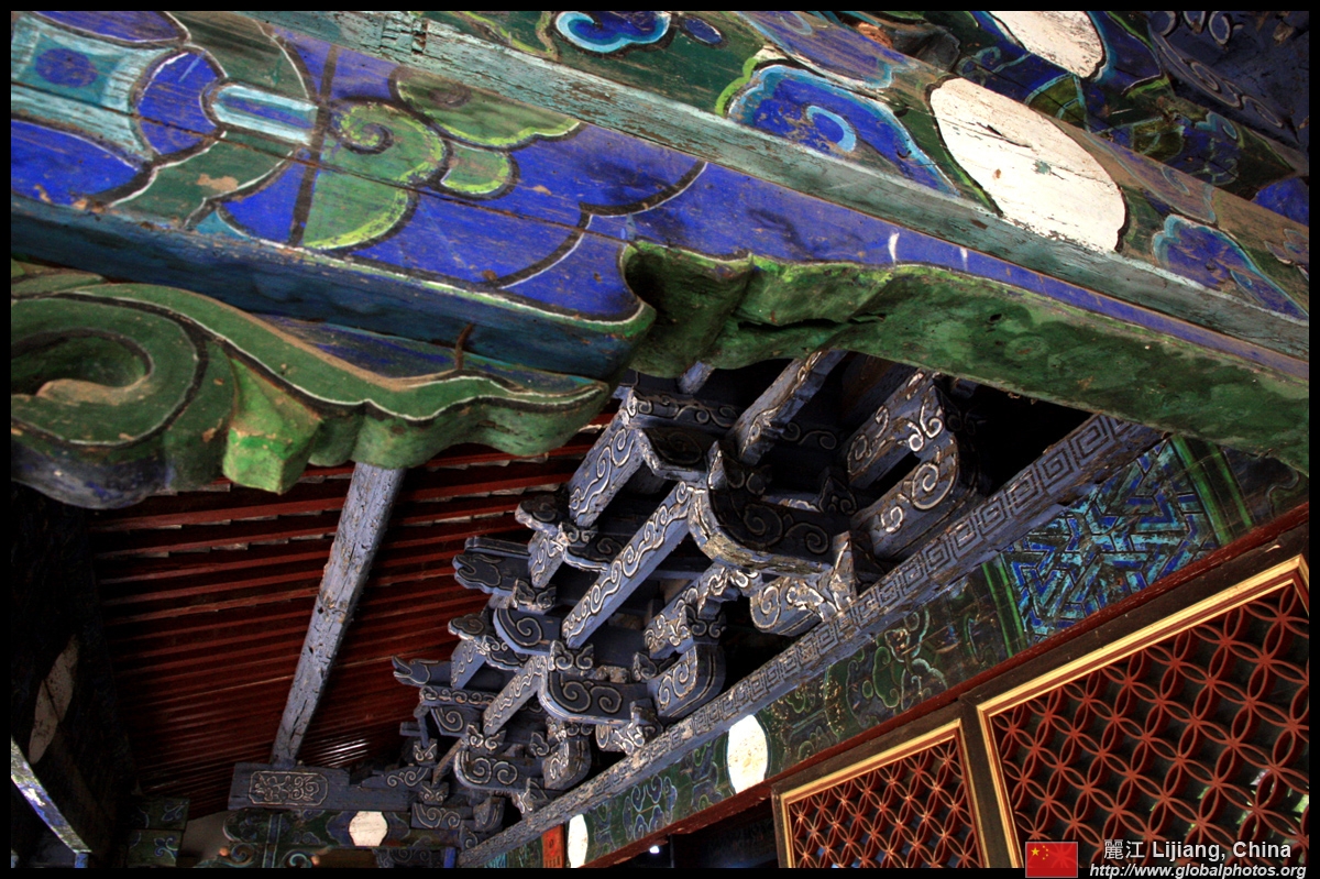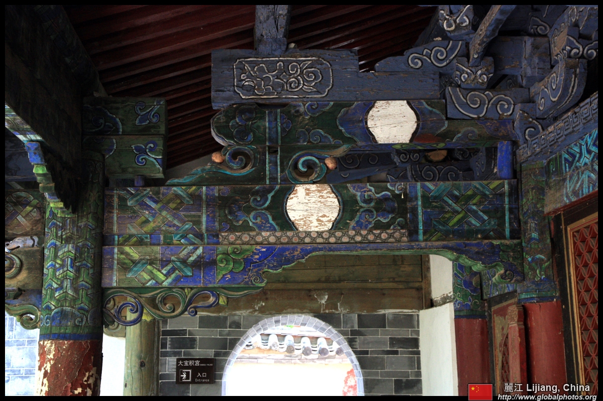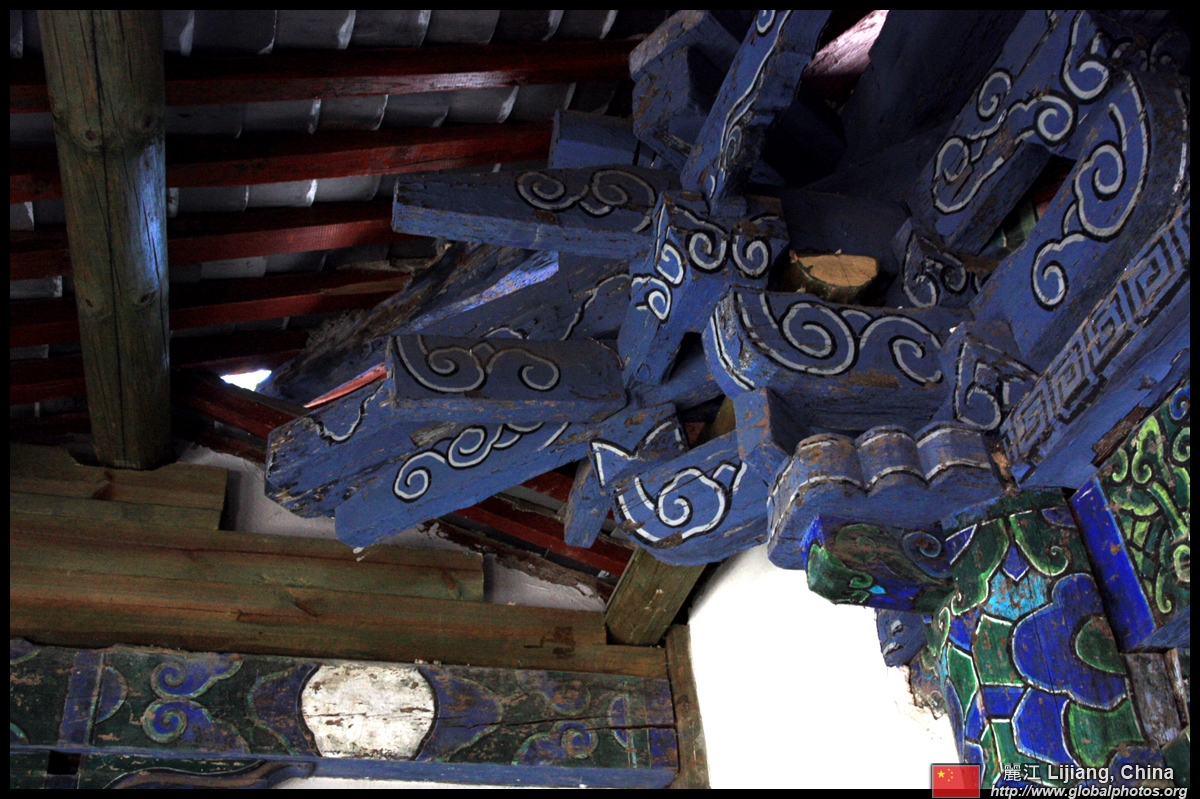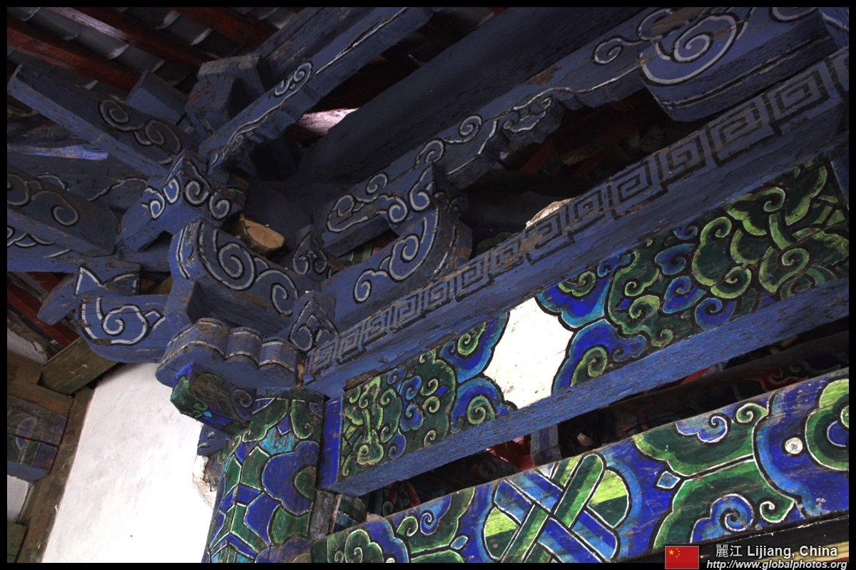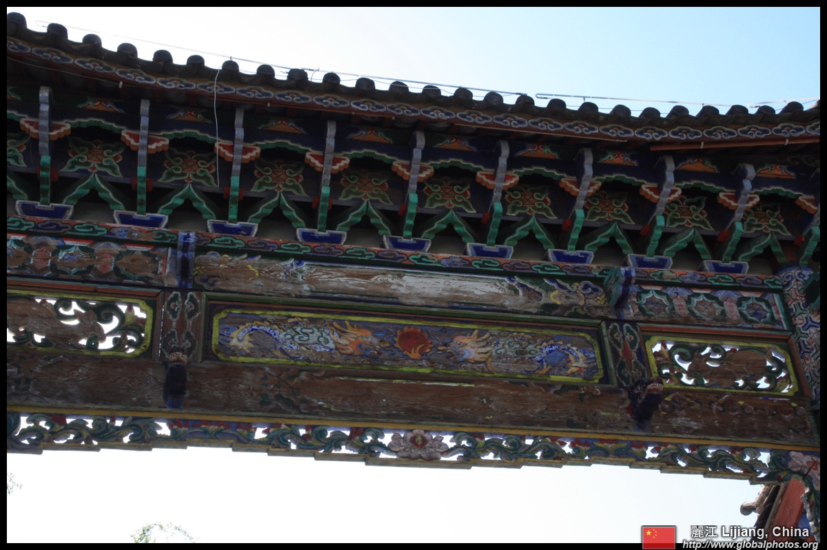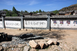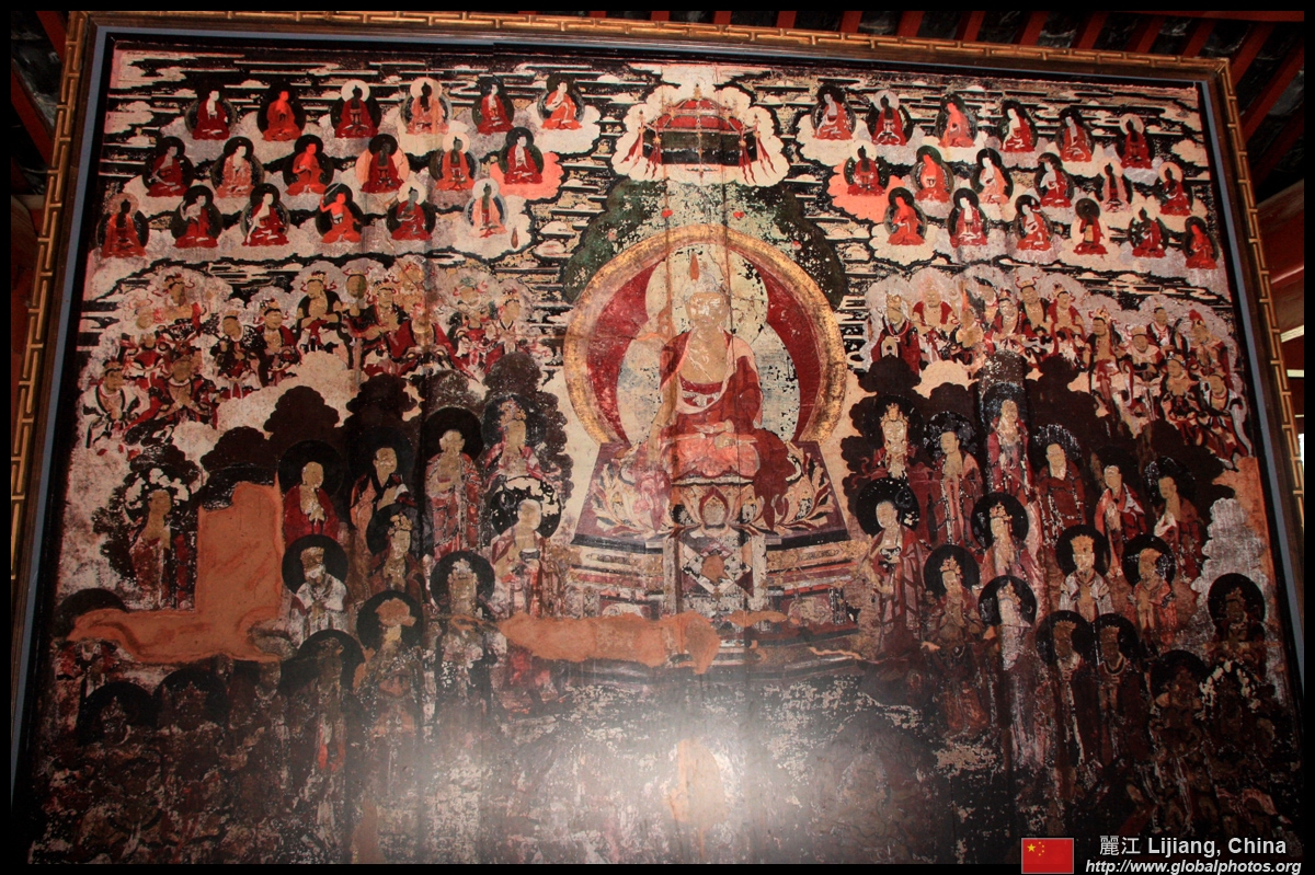 Baisha is famous for its temple frescoes from the Ming and Qing Dynasties. Since photos are not allowed inside the main temple, the frescoes are reproduced on display as an exhibit. The frescoes are influenced by Naxi, Tibetan, Bai, and Han artists to symbolize harmony among the different groups and religions.