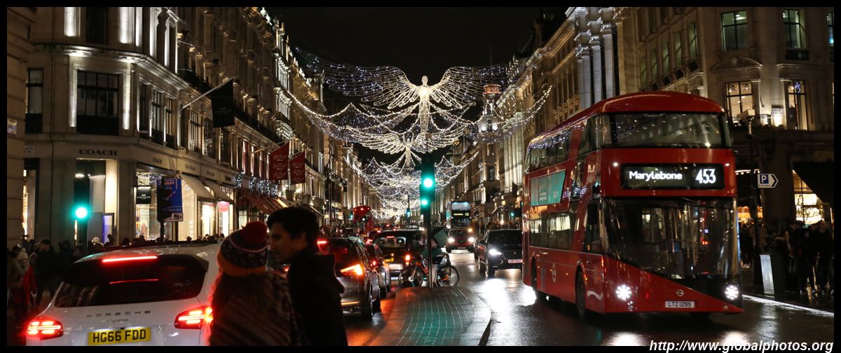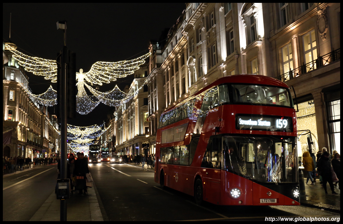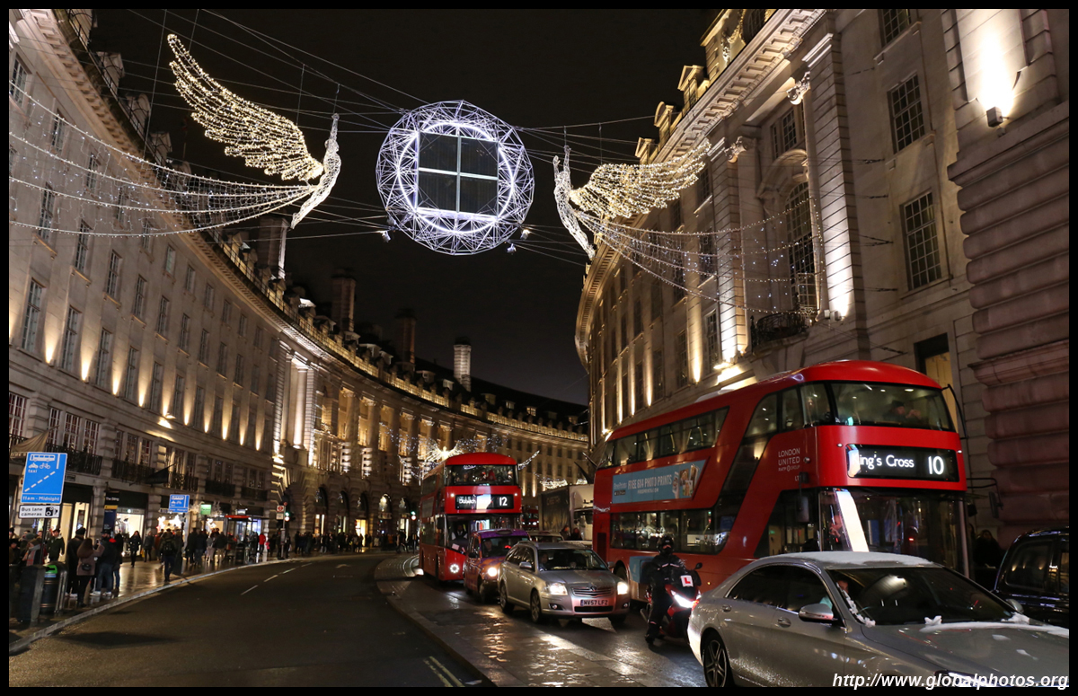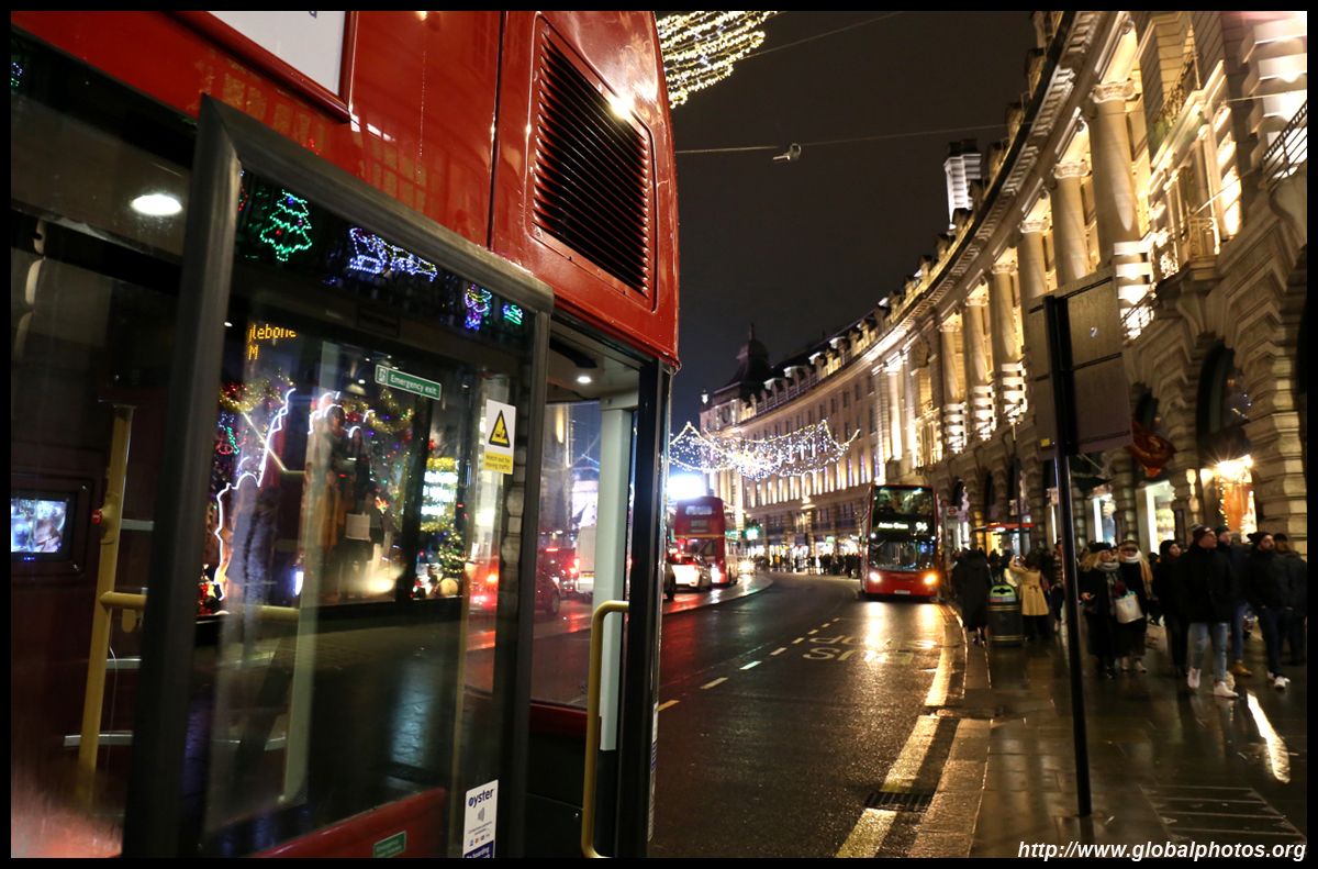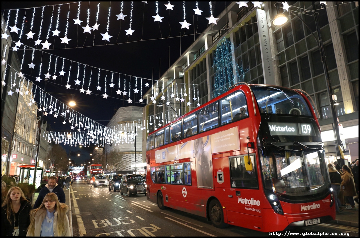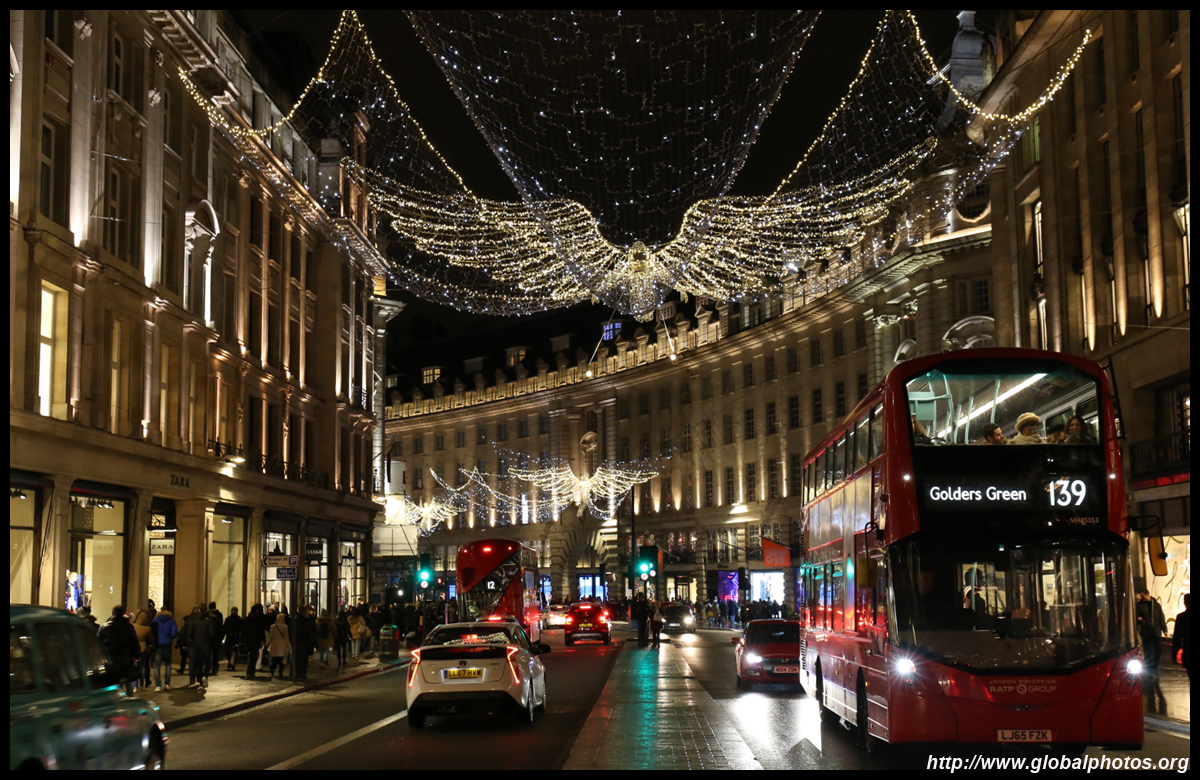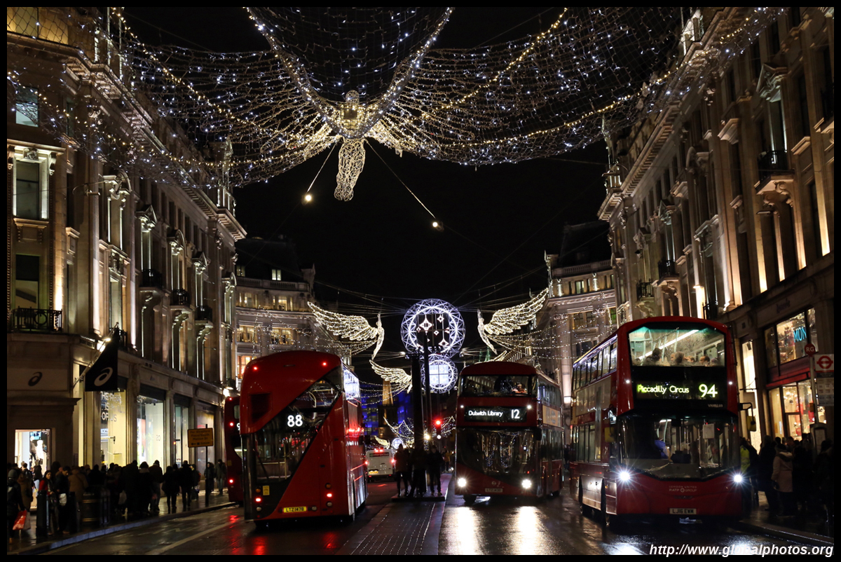 Regent Street is a great place to spot buses. Many parts have a small median to stand and photograph the many buses coming into their stops amidst a setting of historic buildings and Christmas lights.