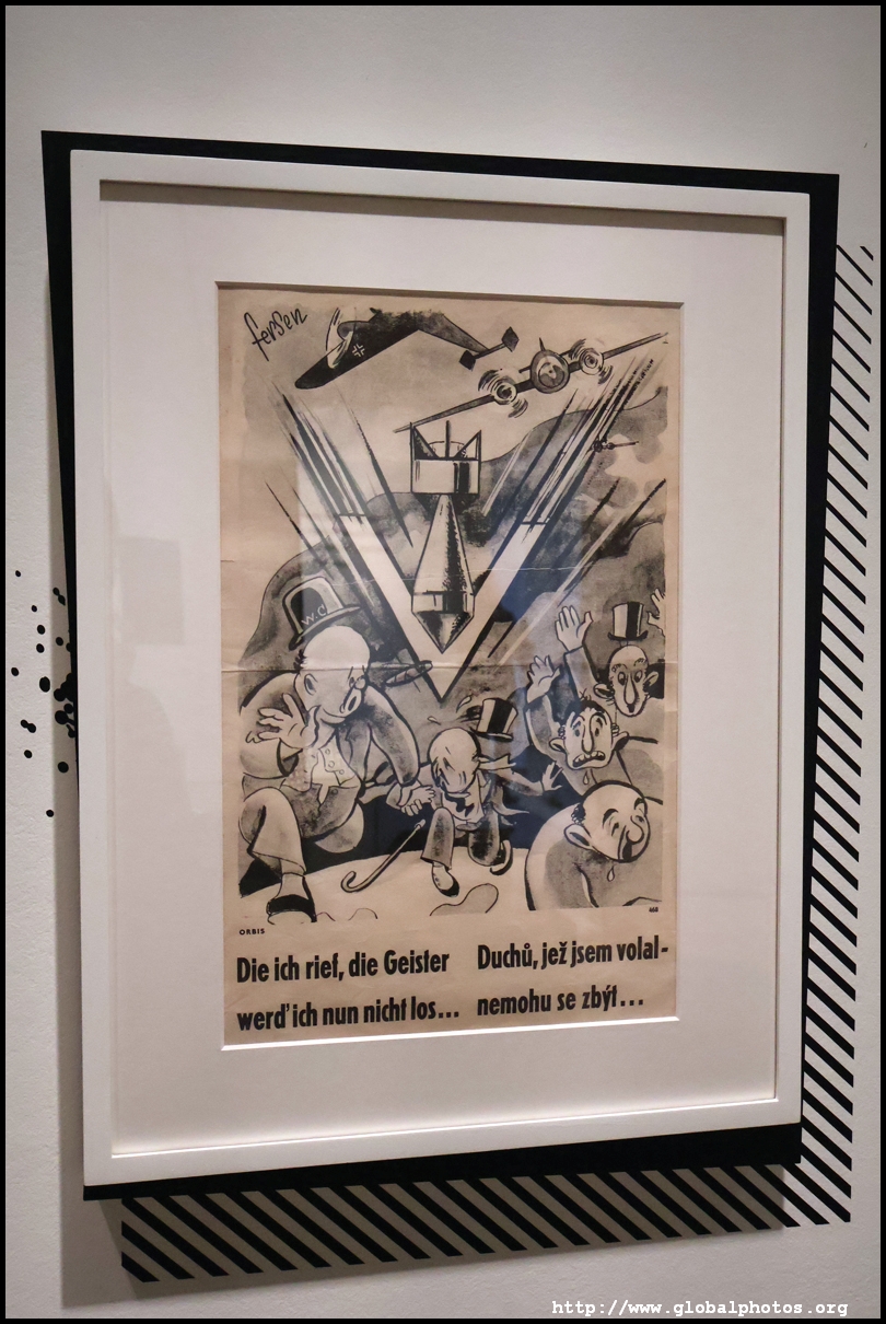 This Czech-produced poster shows Churchill fleeing German bombs during the Blitz, part of the Nazi propaganda campaign that blamed him for the air raids. At the time, he was depicted as a drunk warmonger and criminal.