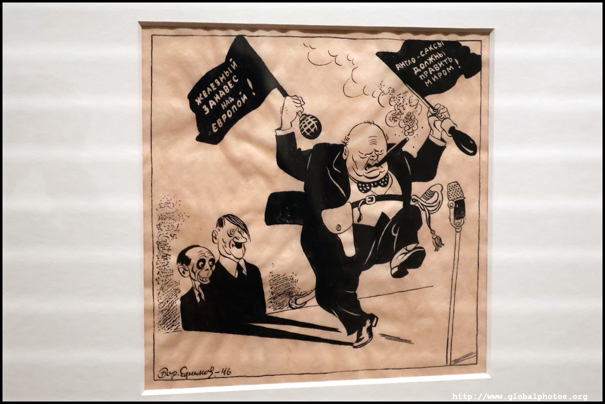 Churchill delivers his "Iron Curtain" speech in 1946, which many regarded it being the start of the Cold War. This cartoon in the Russian media ridiculed him as yet another fascist.