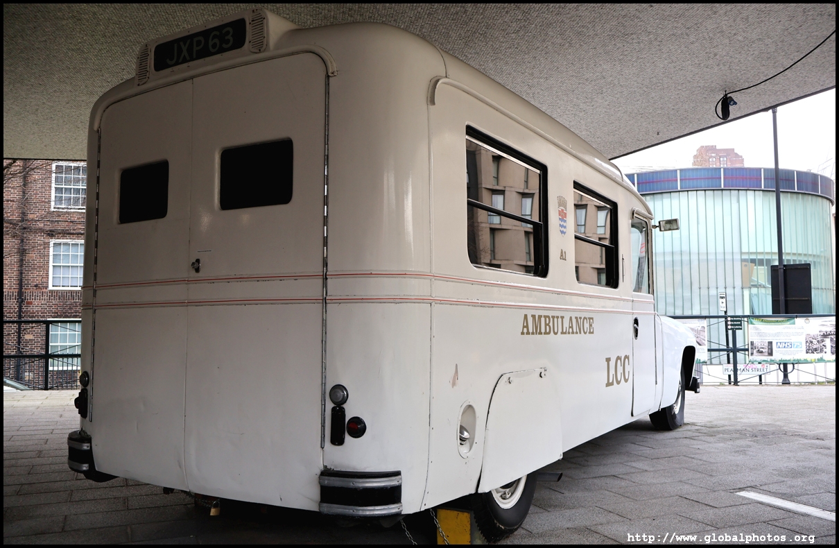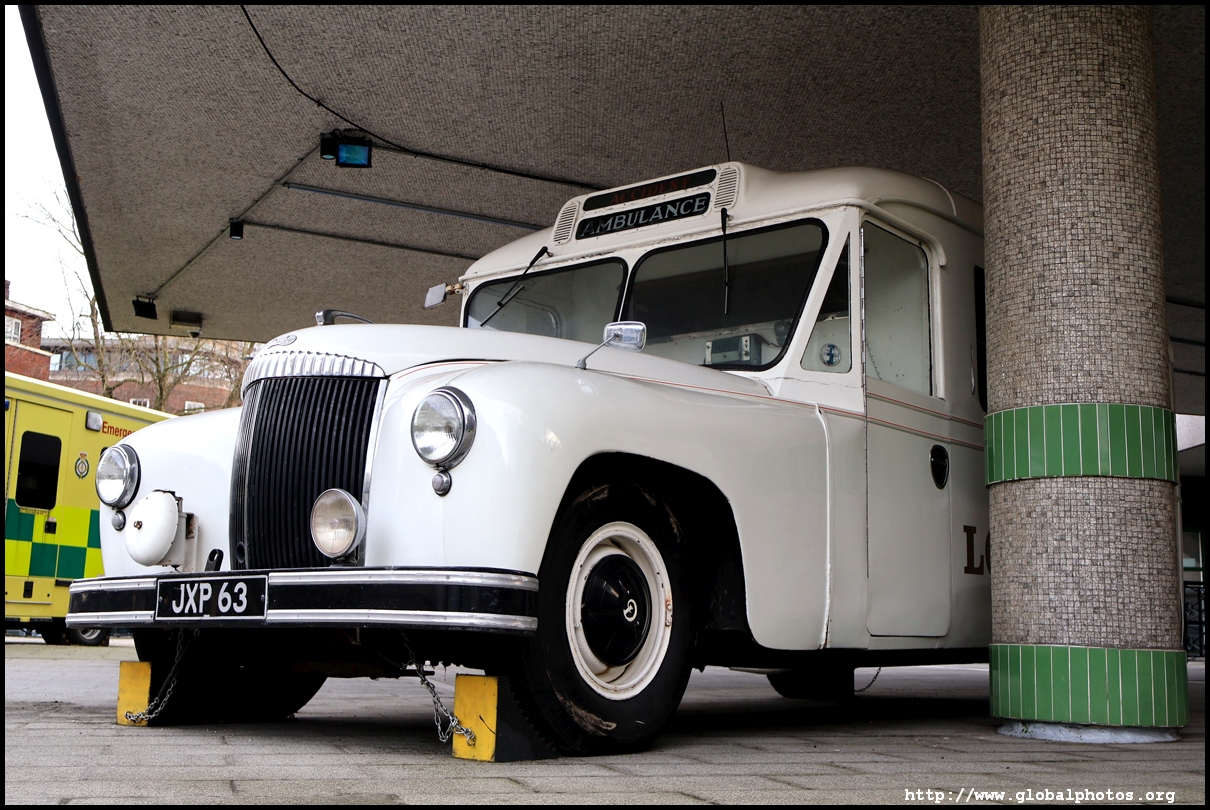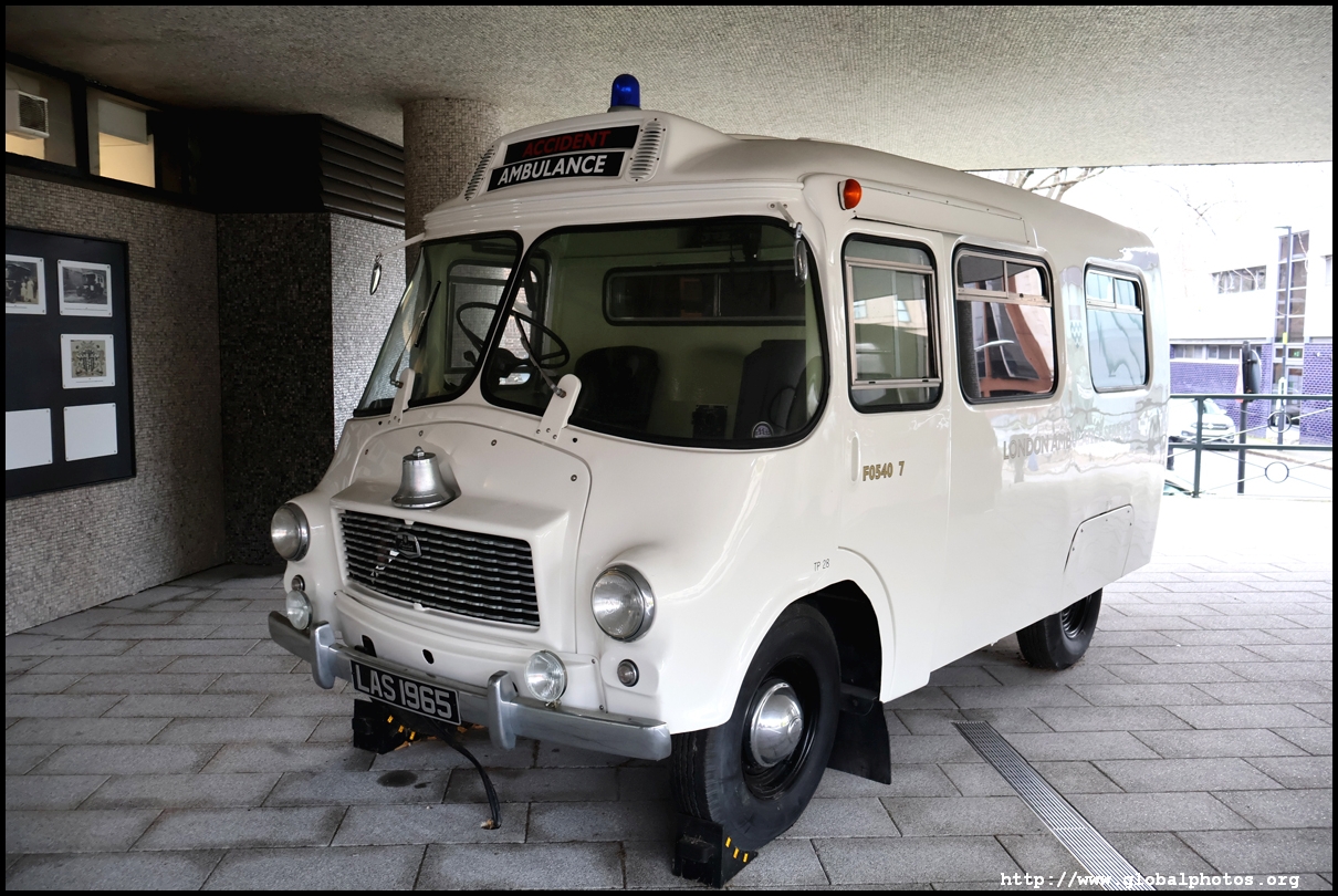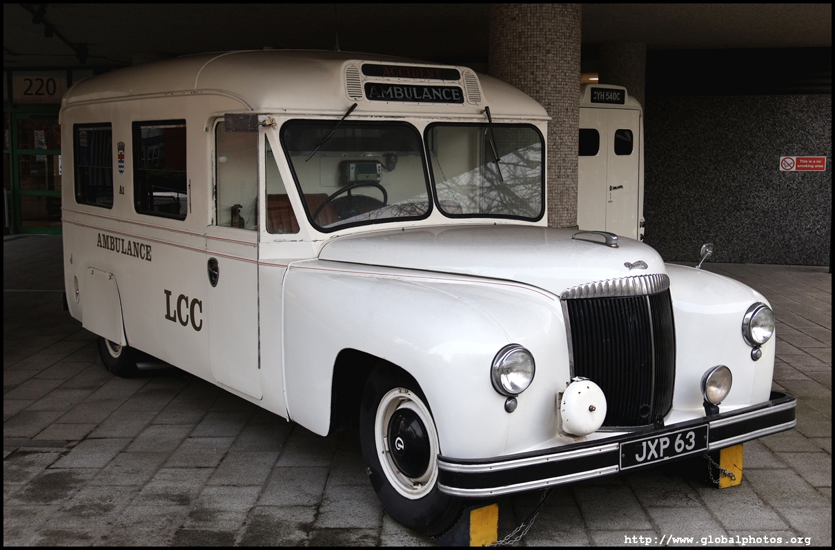 The London Ambulance Service's headquarters near Waterloo station have 2 vintage vehicles parked out front and on display regularly.This is a 1949 Daimler DC27, which served during the early years of the NHS after it was founded in 1948. This is the first of 120 vehicles purchased, which served to the late 1950s.