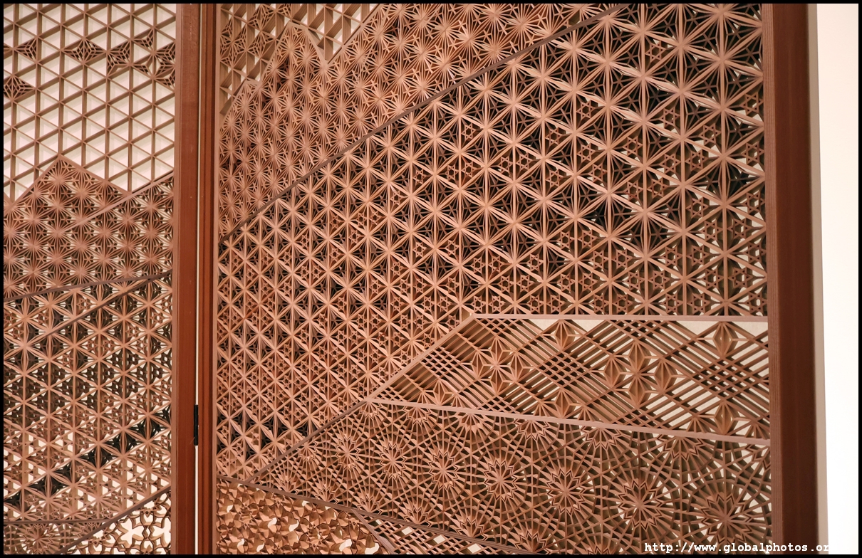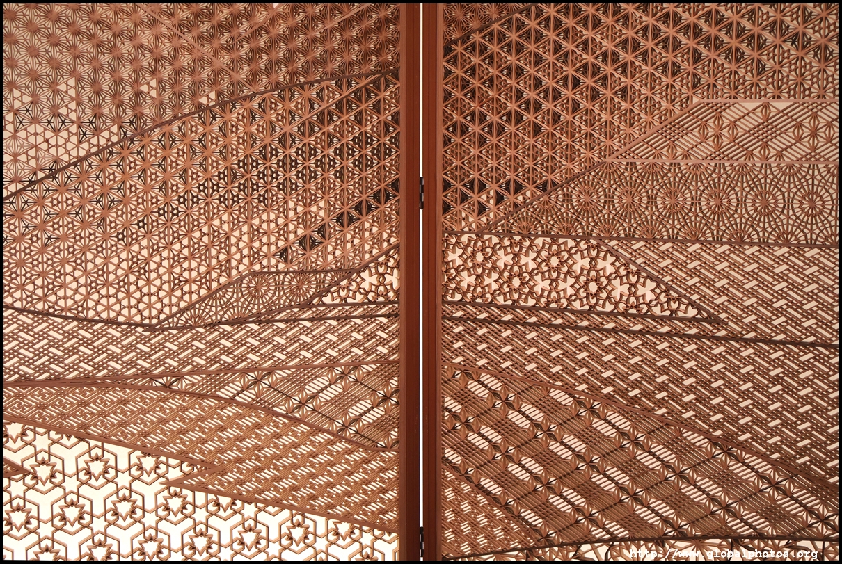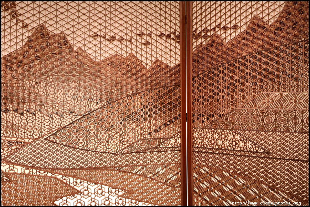 This kumiko folding screen shows a misty mountain landscape. Kumiko refers to lattice work involving thin and delicate pieces of wood arranged in various geometric patterns.