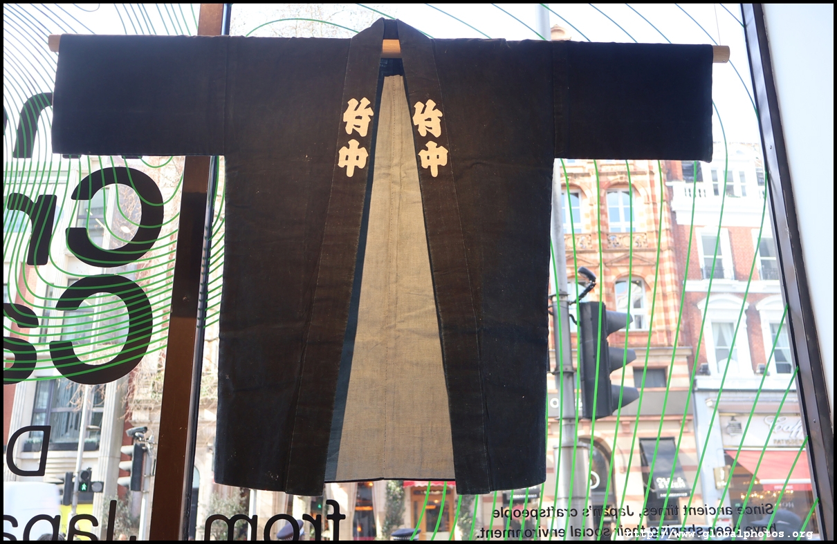 On the left is a whistling arrow used during a ceremony to purify an area from demons before a carpentry project. To the right is a hanten workman's coat that was popular during the late Edo period.