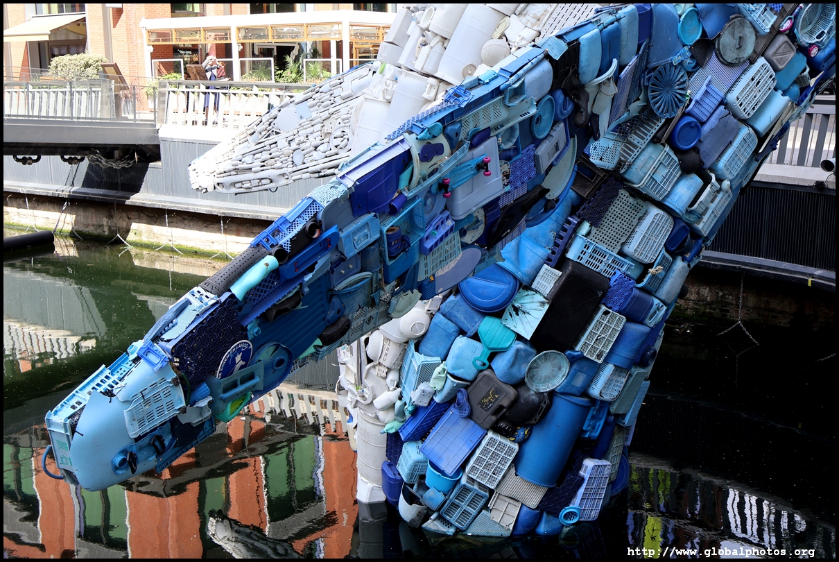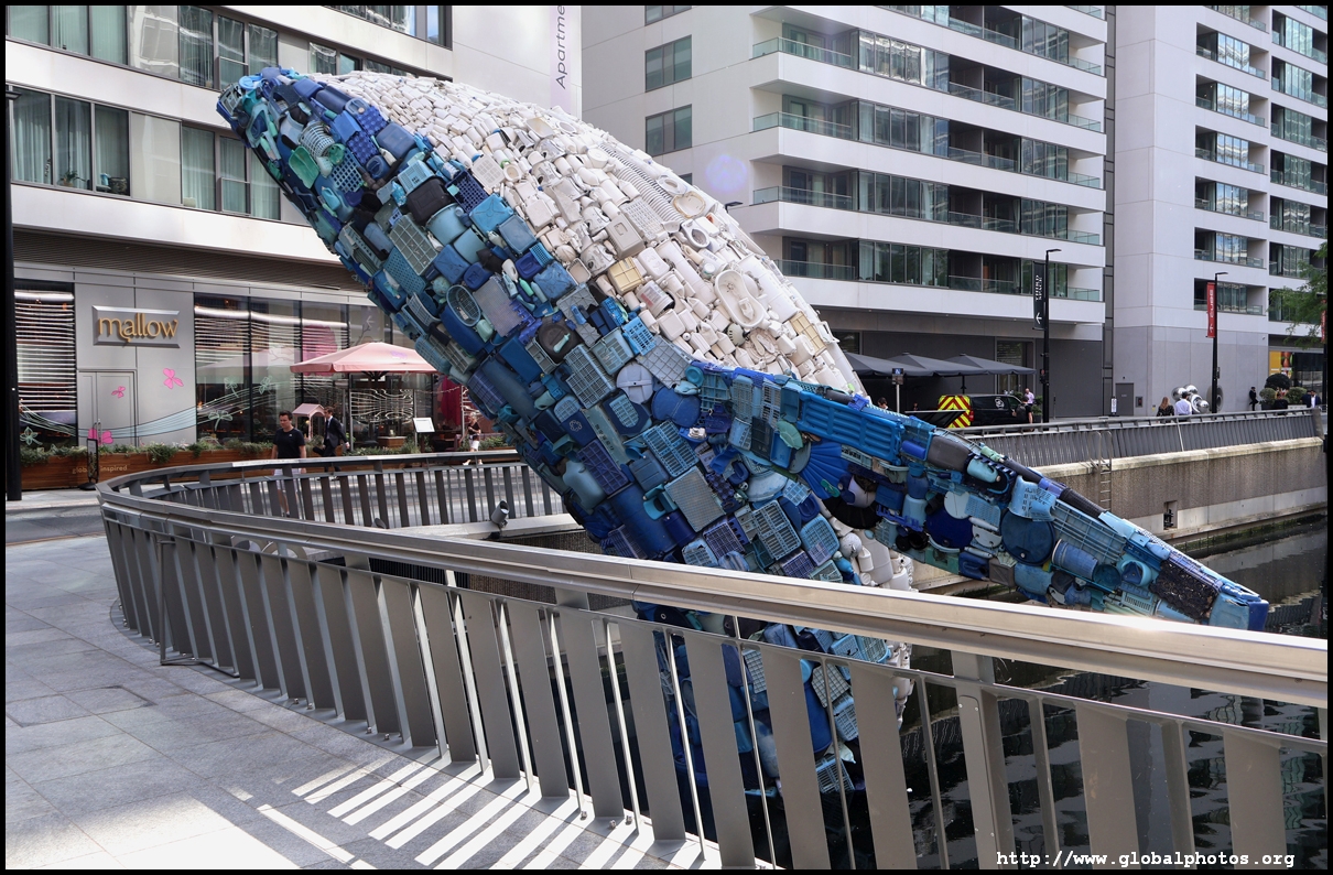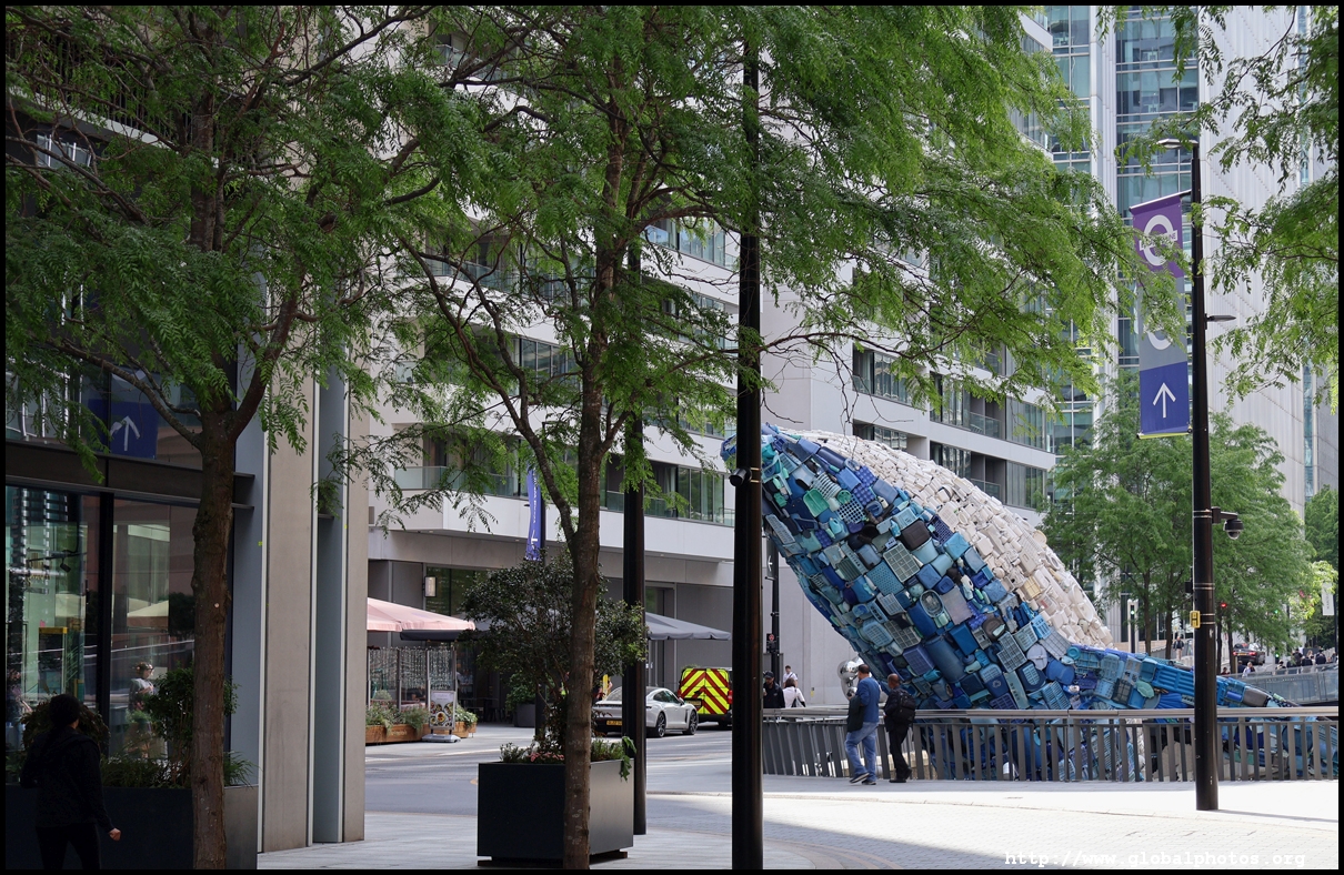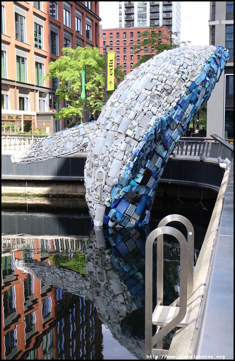 Whale on the Wharf (May 2025)Scientists estimate there are over 150 million tons of plastic waste in our oceans. To highlight the massive pollution problem in our oceans, Whale on the Wharf was made using 5 tonnes of plastic litter found on Hawaii's beaches. It sits on a concrete base made of spent coffee grounds from area restaurants. Designed by StudioKCA in collaboration with the Hawaii Wildlife Fund, the 11m sculpture will be a permanent addition to Canary Wharf as part of the district's public art collection.