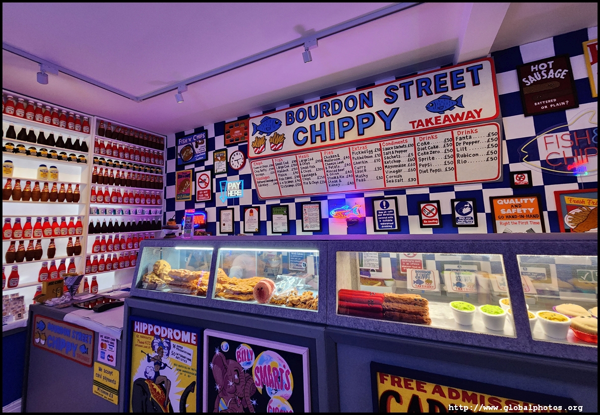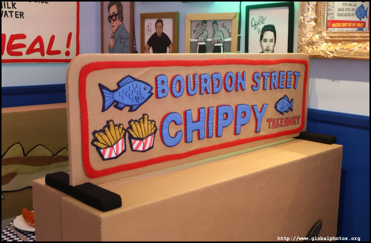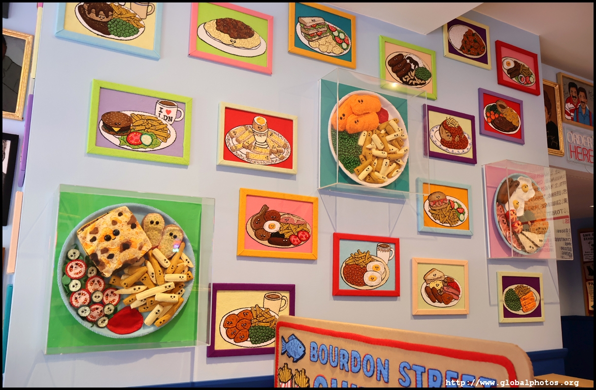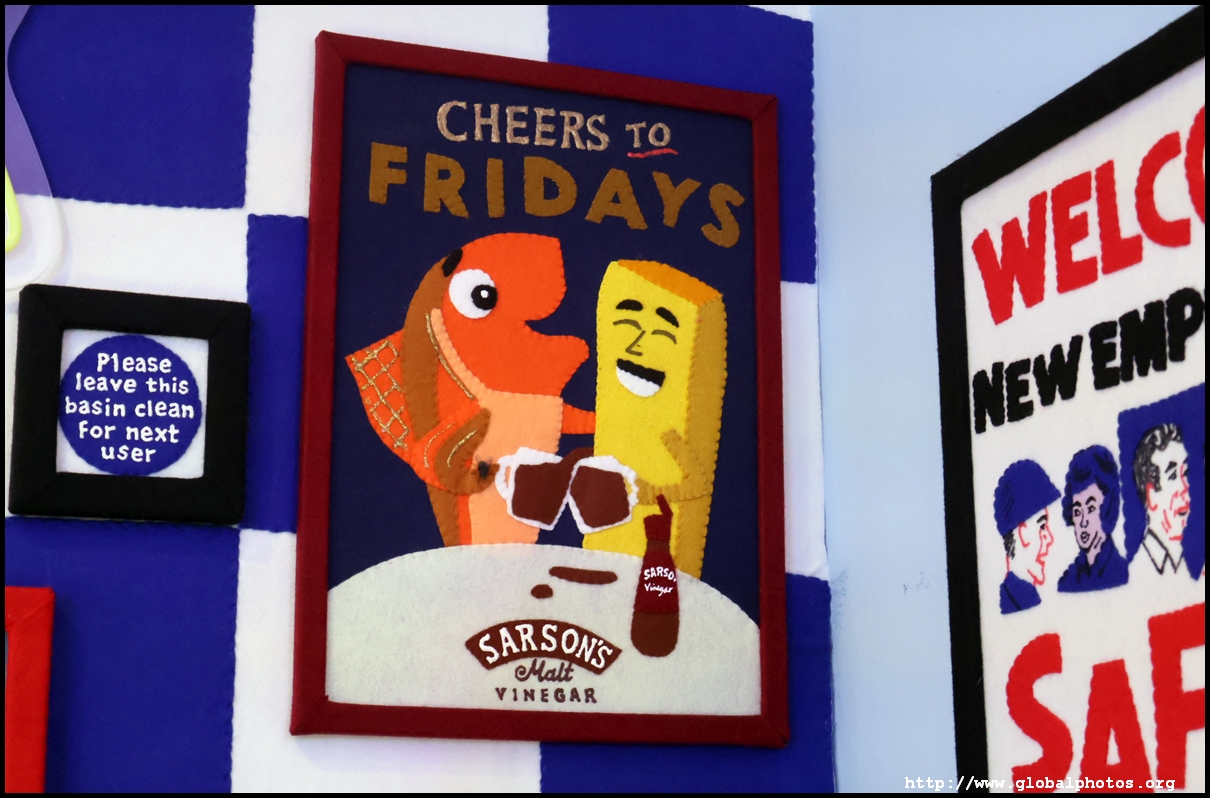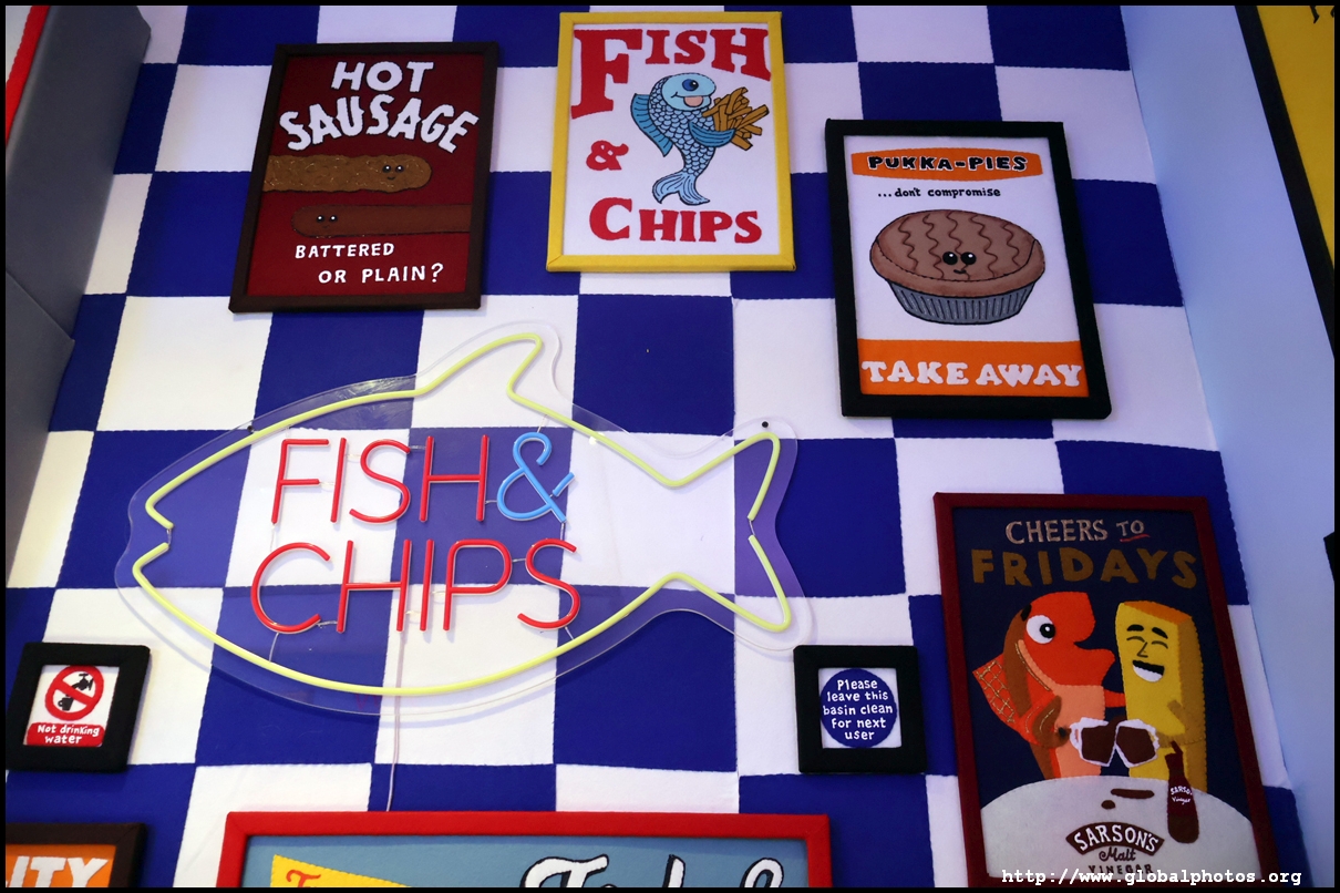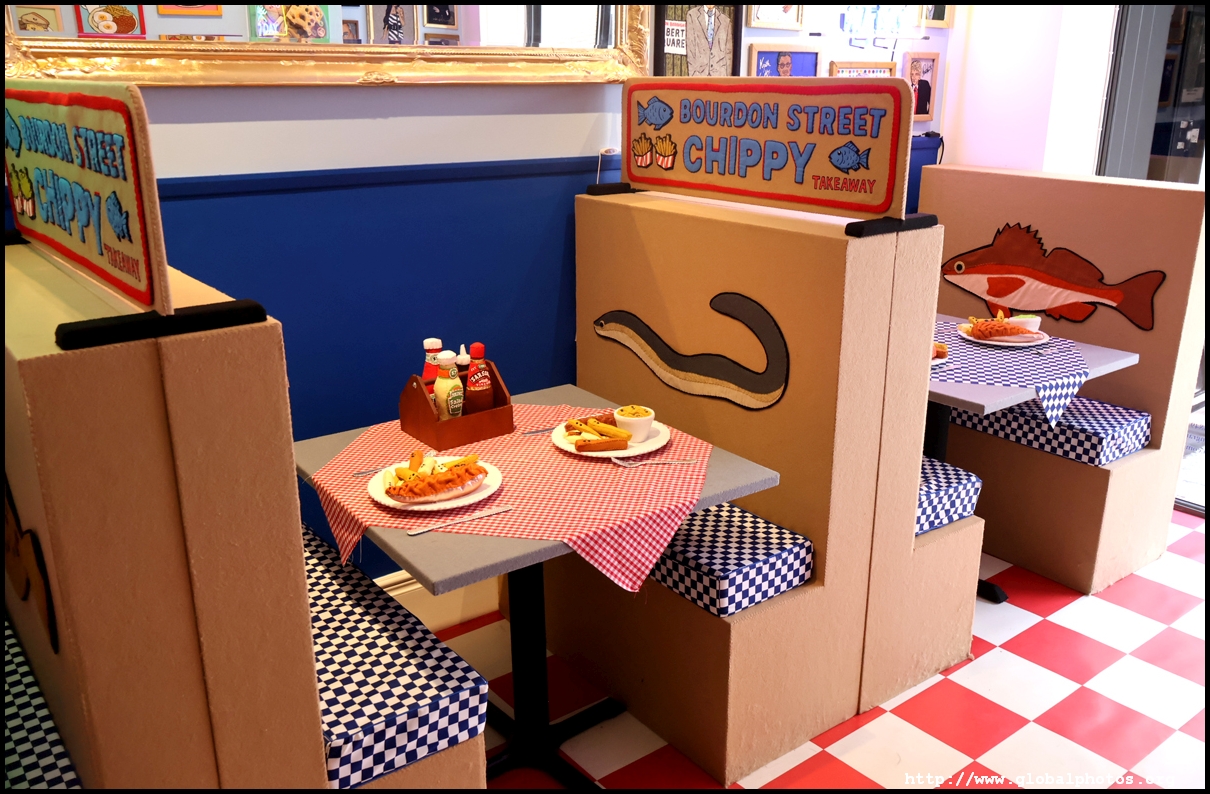 Bourdon Street Chippy (September 2025)Tucked on a side street in upscale Mayfair behind from the luxury brands is a fish and chips shop. Open for only 6 weeks, all of its decor are artworks made from fabric, which you can purchase to bring home. British artist Lucy Sparrow unveiled this exhibition in August with over 65,000 hand-crafted felt pieces on display, ranging from art on the walls, food on the table, to the soft drinks in the vending machine. There are 15 chip shapes and each item is made in great detail. Lucy has struggled with anorexia since her teenage years. Art became her outlet and motivation to recover. You enter into the shop's seating area, with plates of fish and chips and their friends on the tables. Too bad we couldn't sit in the booths to try them all!