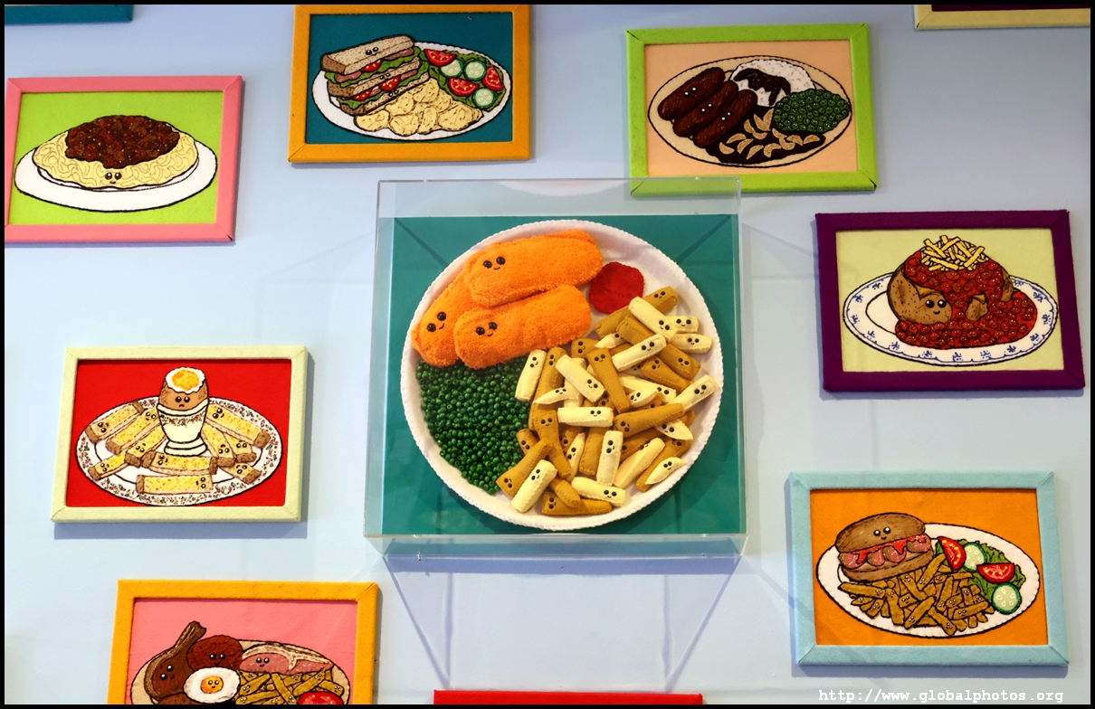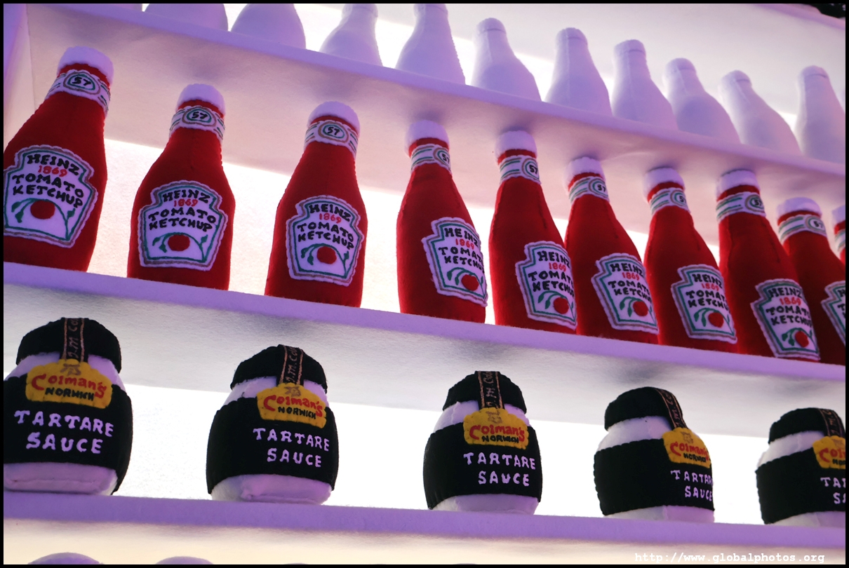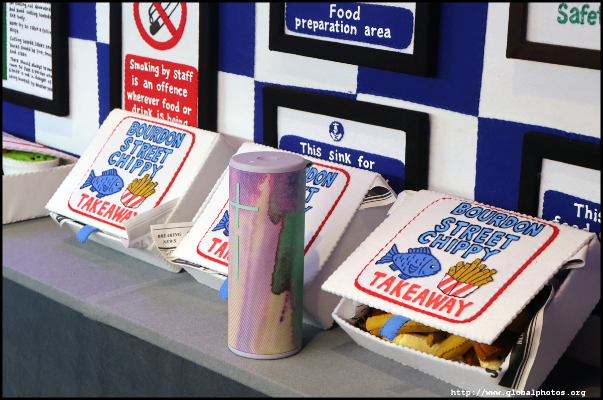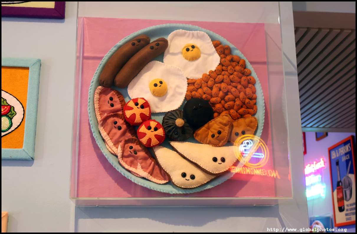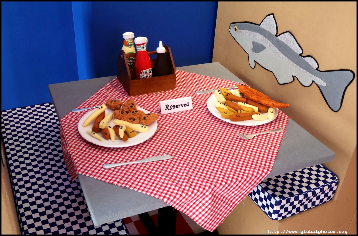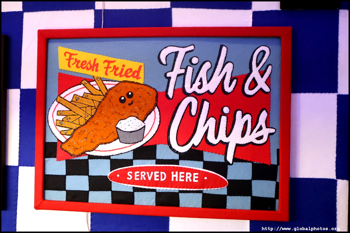 Bourdon Street Chippy (September 2025)Tucked on a side street in upscale Mayfair behind from the luxury brands is a fish and chips shop. Open for only 6 weeks, all of its decor are artworks made from fabric, which you can purchase to bring home. British artist Lucy Sparrow unveiled this exhibition in August with over 65,000 hand-crafted felt pieces on display, ranging from art on the walls, food on the table, to the soft drinks in the vending machine. There are 15 chip shapes and each item is made in great detail. Lucy has struggled with anorexia since her teenage years. Art became her outlet and motivation to recover. You enter into the shop's seating area, with plates of fish and chips and their friends on the tables. Too bad we couldn't sit in the booths to try them all!