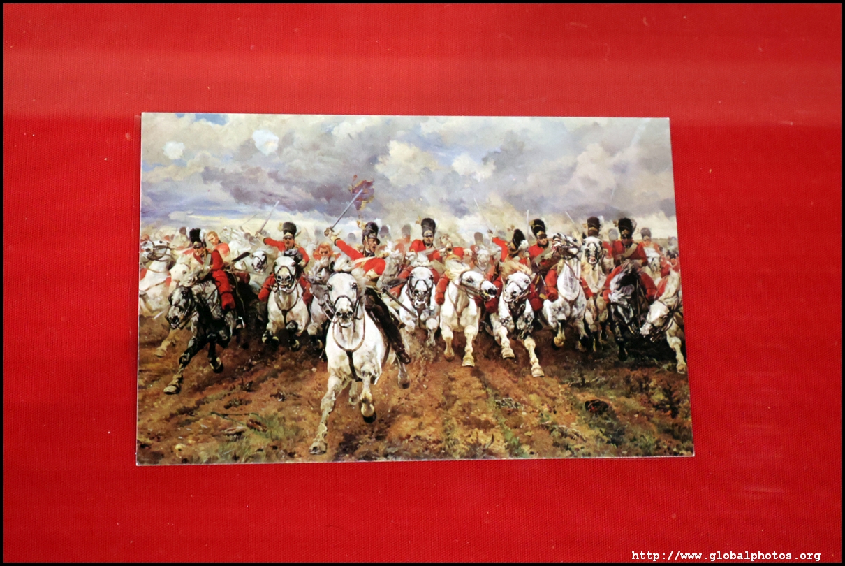 This postcard depicts a Lady Butler painting with the 2nd Dragoons charging at Waterloo in 1815. This type of illustrated postcard was popular in the mid-1890s.