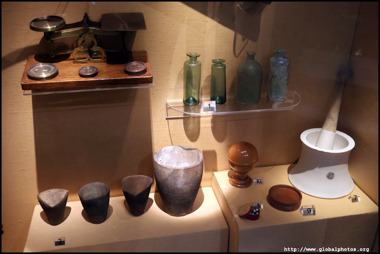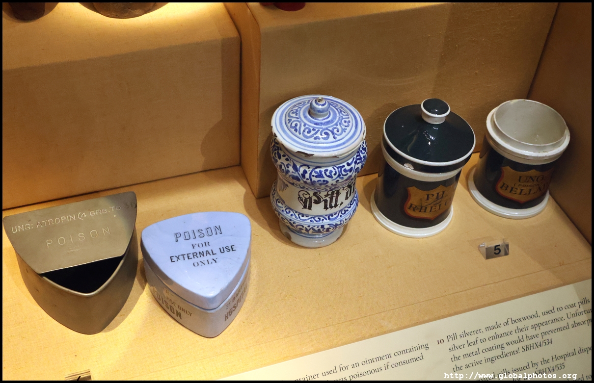 These jars stored various pills and ointments. Until the 17th century, most drugs were made from plants and spices. The first London Pharmacopoeia was published in 1618 with a list of approved drugs and how to make them.