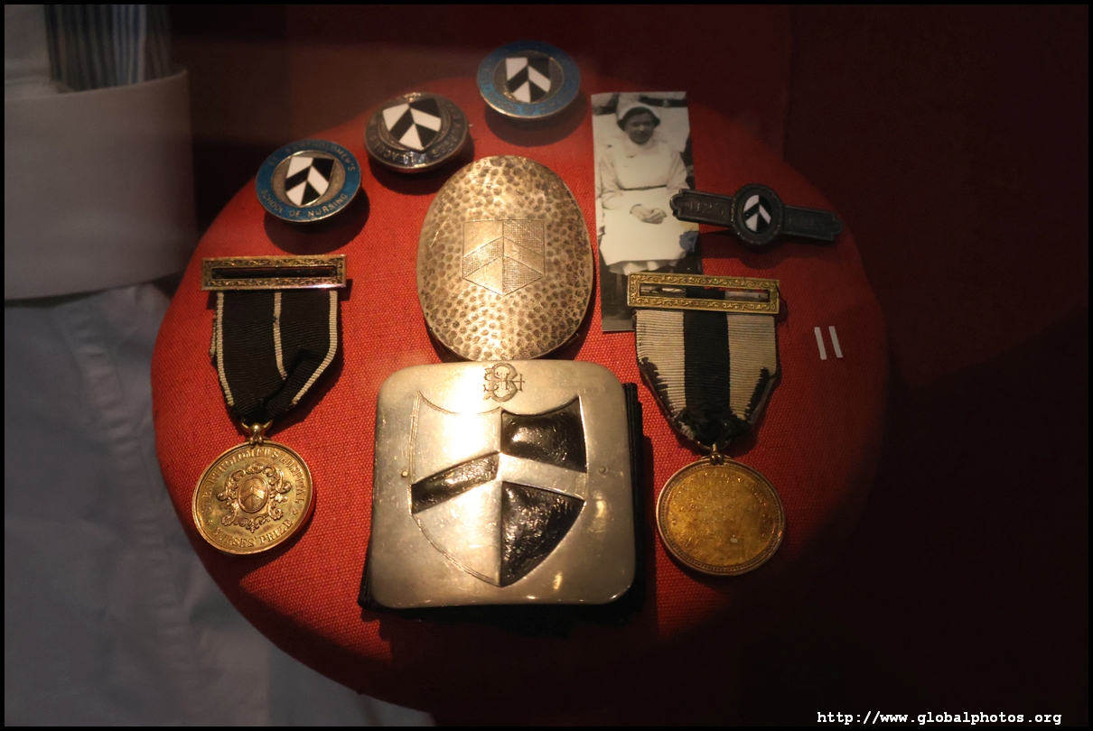 Qualified nurses can wear their choice of buckles with their uniforms. The black and white badge was given to the League of St. Bartholomew's Nurses.
