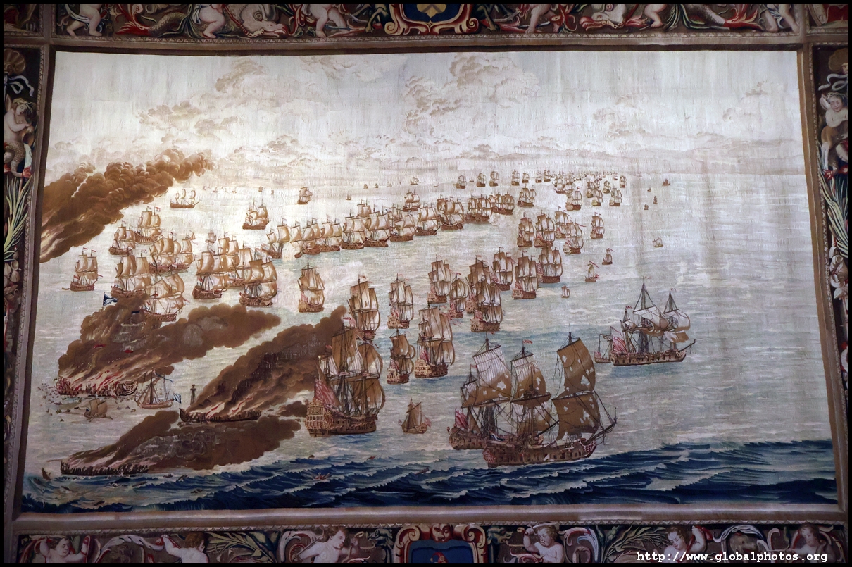 The Solebay tapestry features burning ships, waves, and smoke from the Battle of Solebay in 1672 between the English, Dutch, and French. It was part of 6 giant tapestries commissioned by King Charles II.