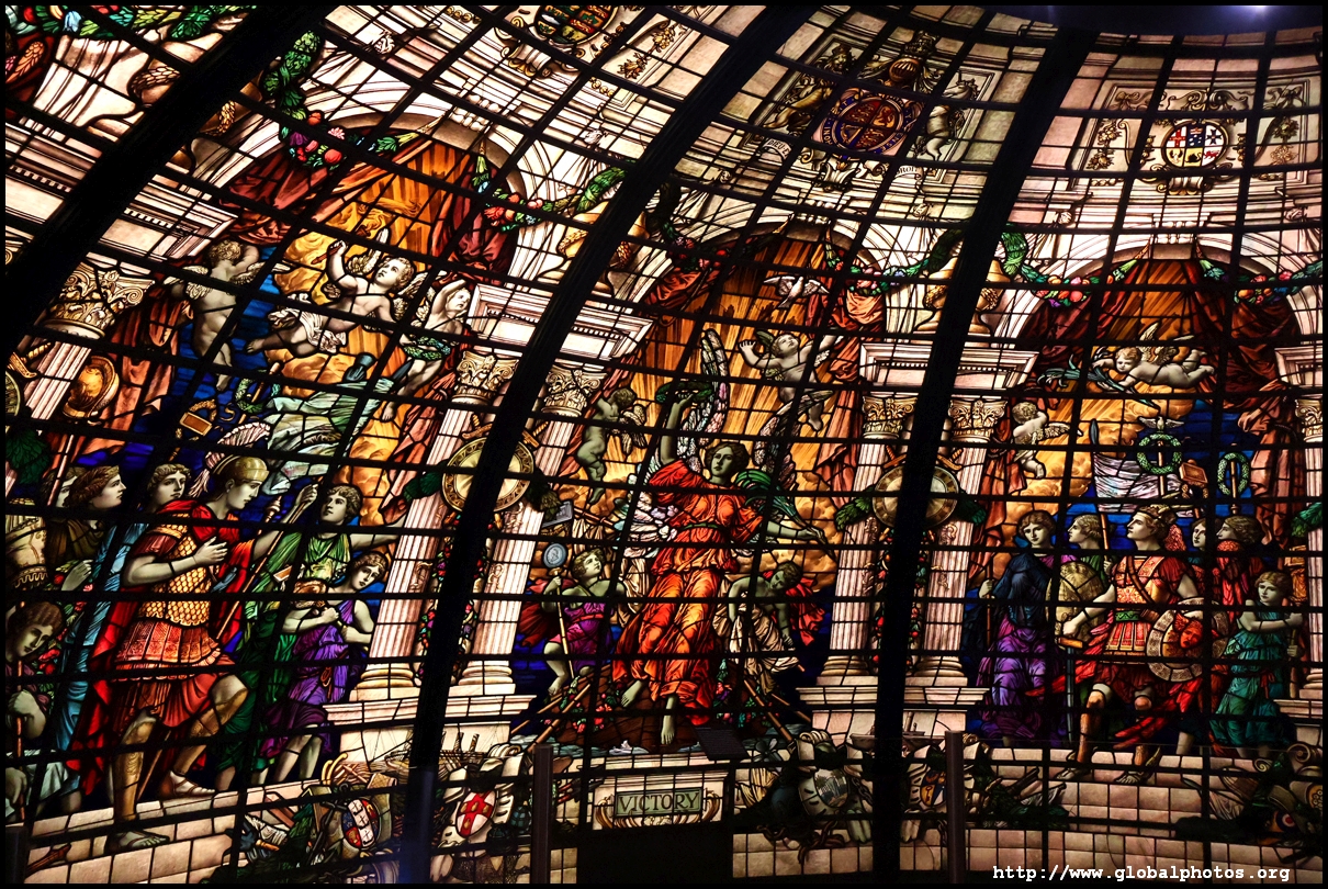 The stained glass from the Baltic Exchange Building was unveiled in 1922 to memoralize the members who died during World War I. Damaged by a terrorist bombing in 1992, they are now on display at the museum.