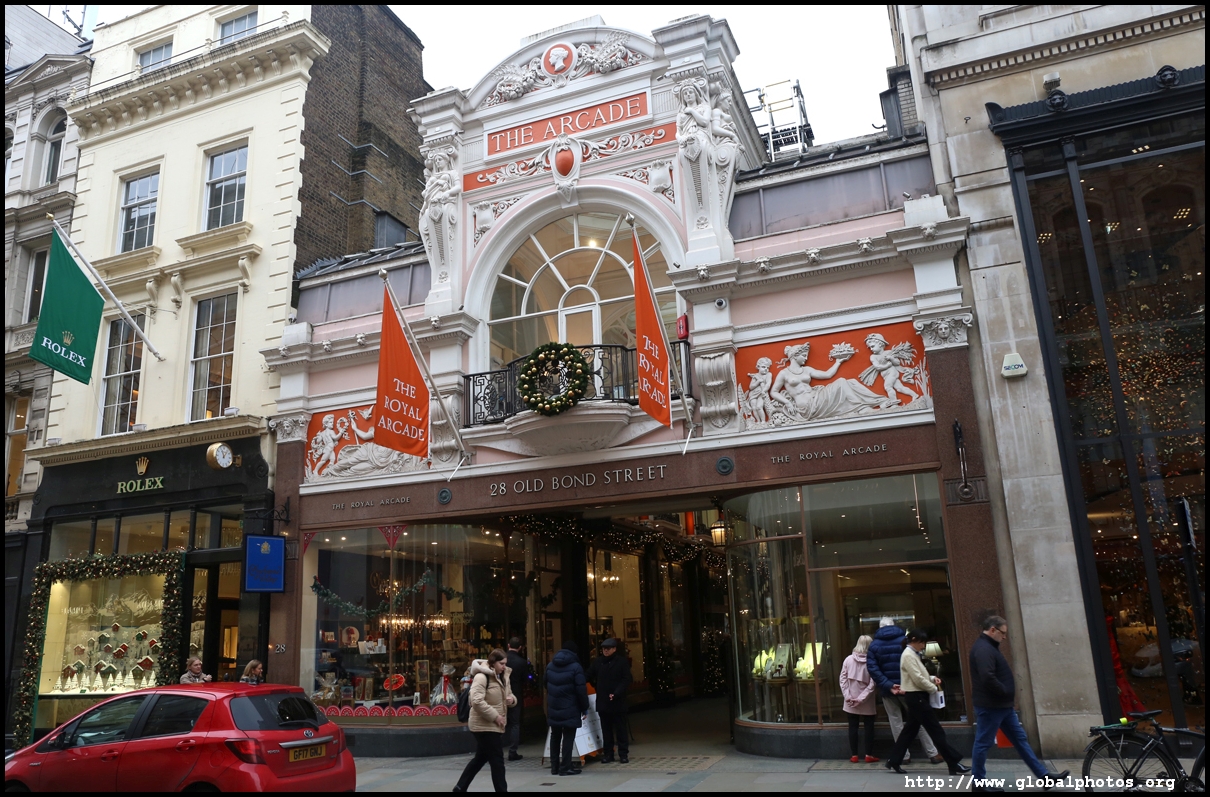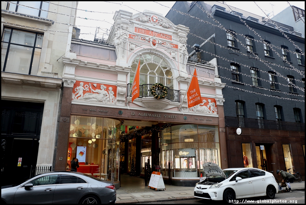 Royal Arcade was built in 1879 connecting Old Bond and Albemarle Streets. The arcade was originally designed to extend all the way to Regent Street but was rejected due to the large-scale demolition and access restrictions to existing properties. Its Victorian features remain today.