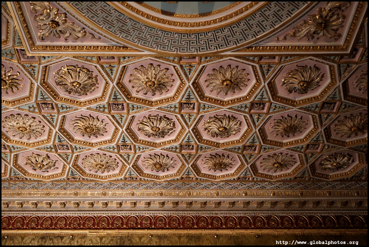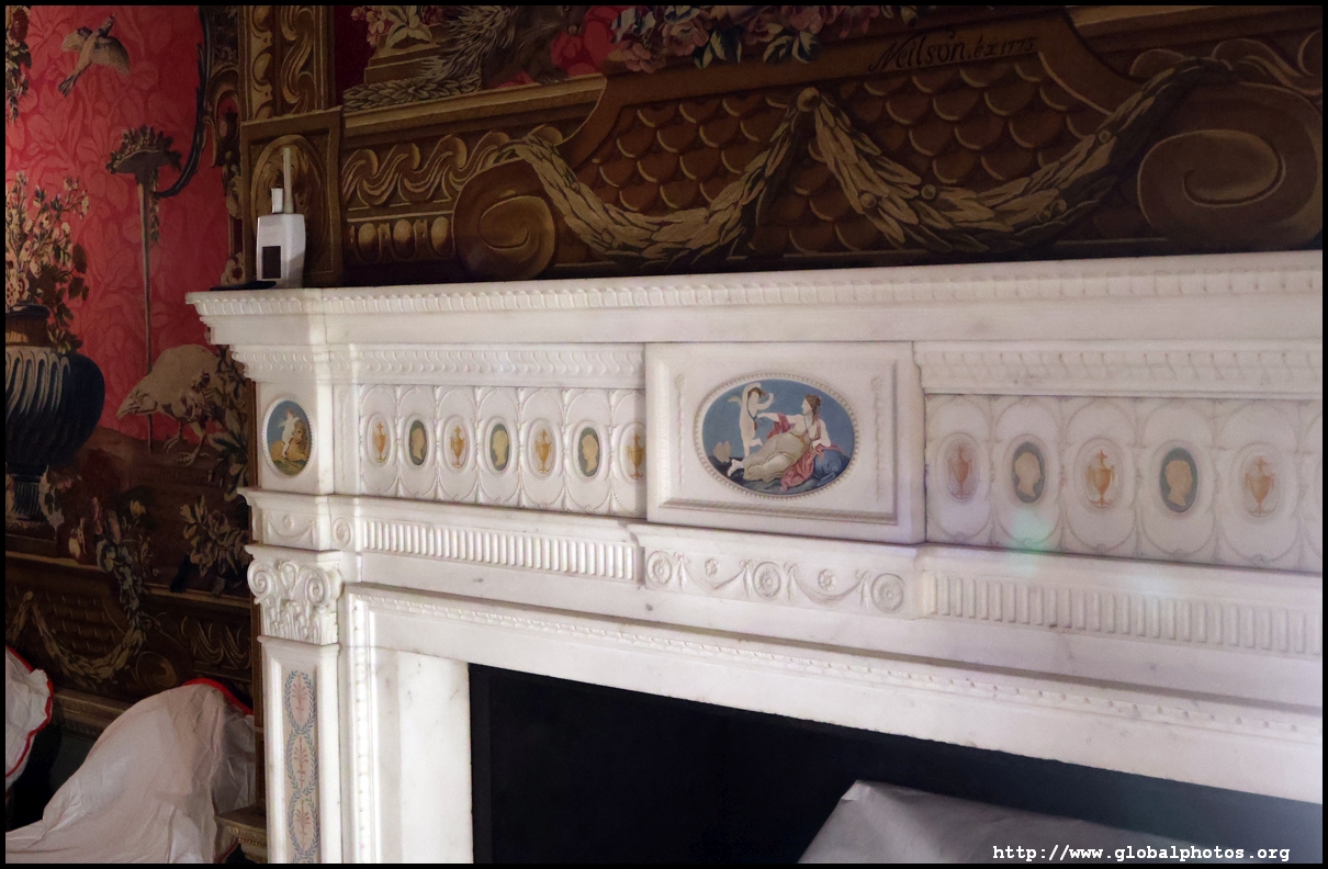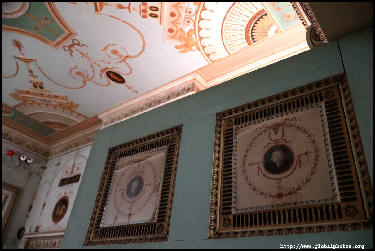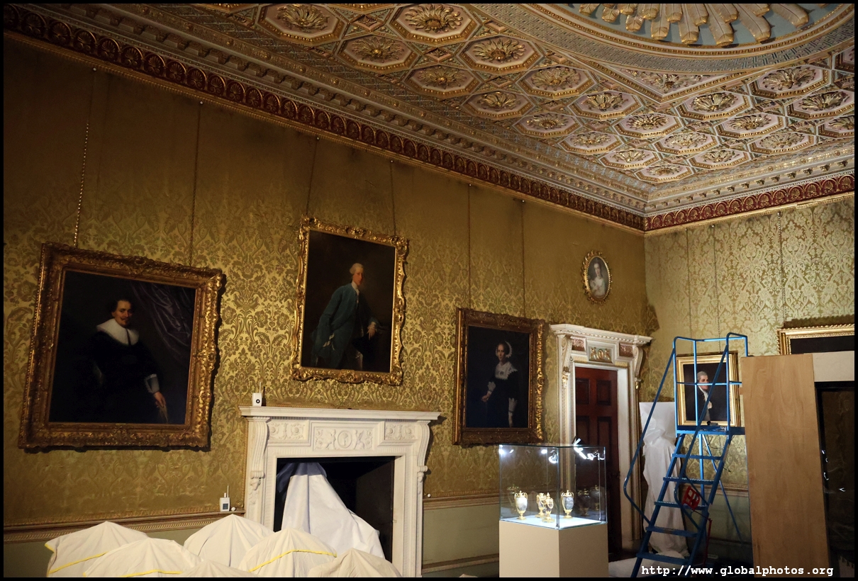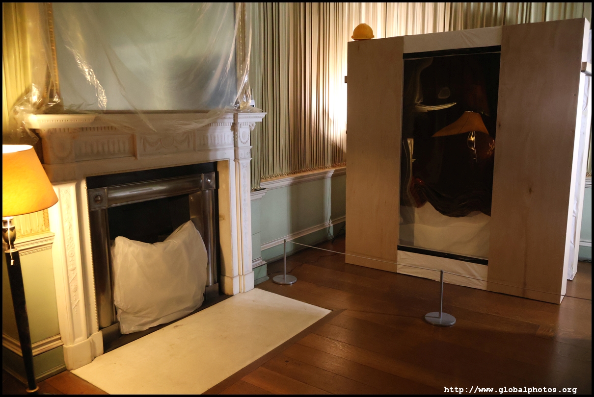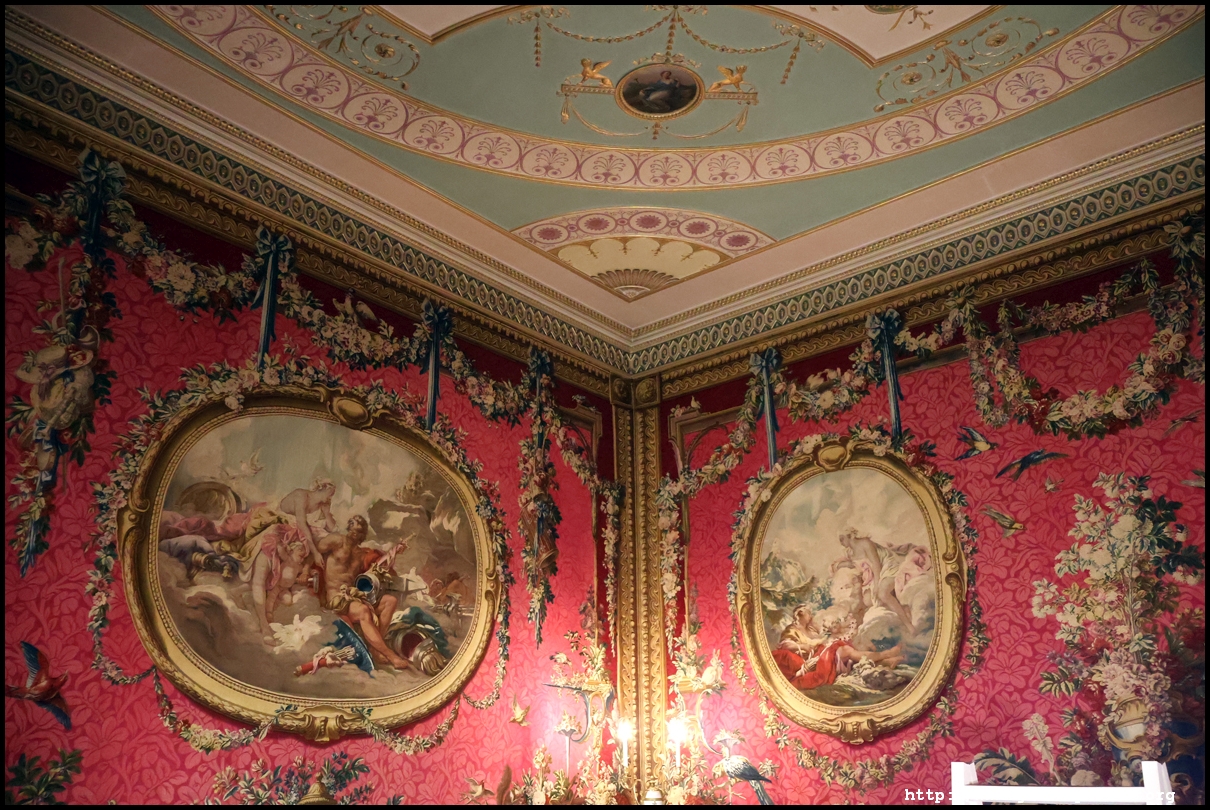 Continuing, the next few rooms are under renovation with many furniture packed up to protect them from construction. The Drawing Room was used to relax after dinner, such as playing cards or playing music. Up above, the ceiling is based on the Temple of the Sun from ancient Syria, a mid-1760s design. The old curtains have also been taken down and put into display cases.