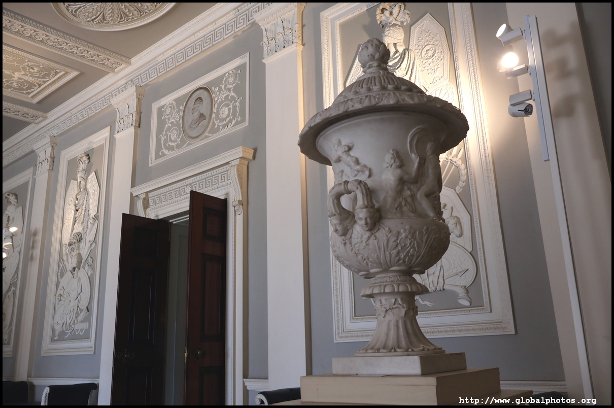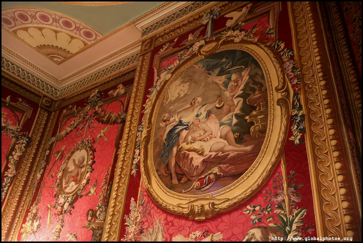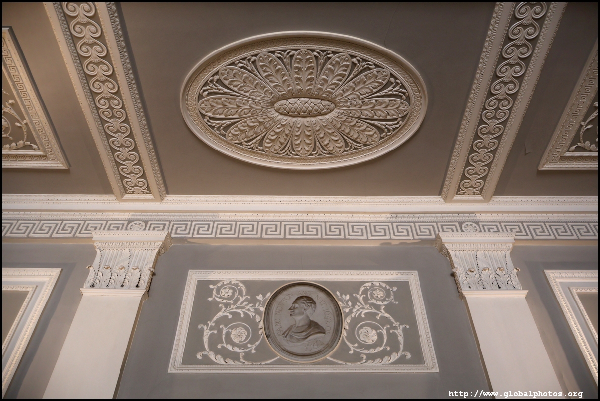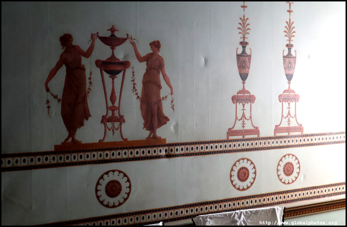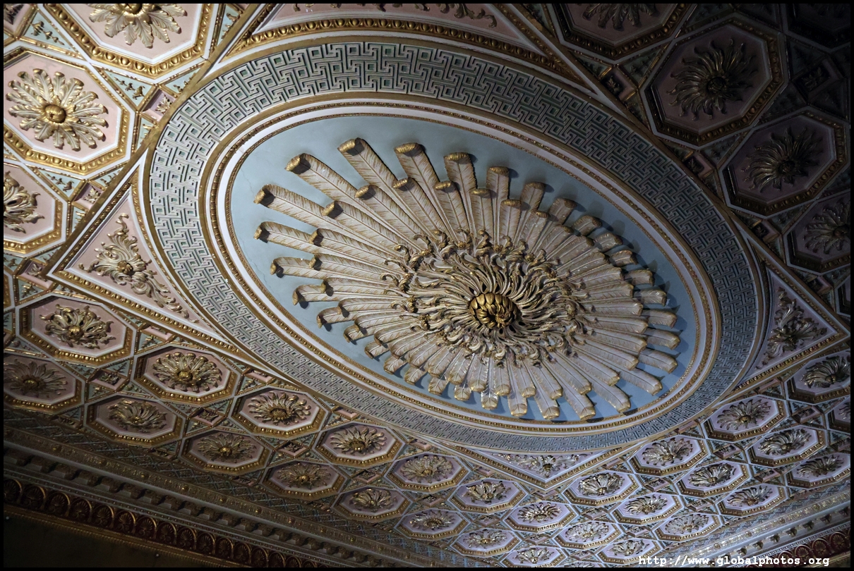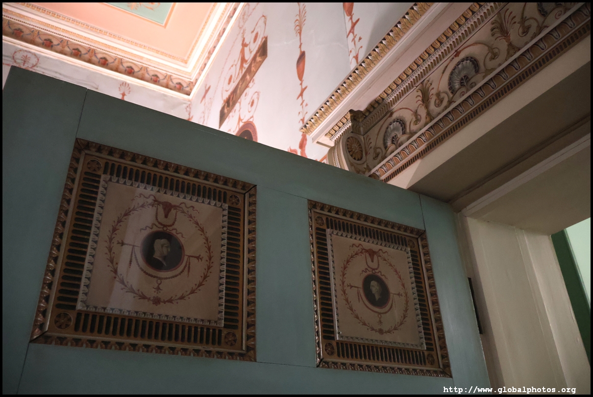 Continuing, the next few rooms are under renovation with many furniture packed up to protect them from construction. The Drawing Room was used to relax after dinner, such as playing cards or playing music. Up above, the ceiling is based on the Temple of the Sun from ancient Syria, a mid-1760s design. The old curtains have also been taken down and put into display cases.
