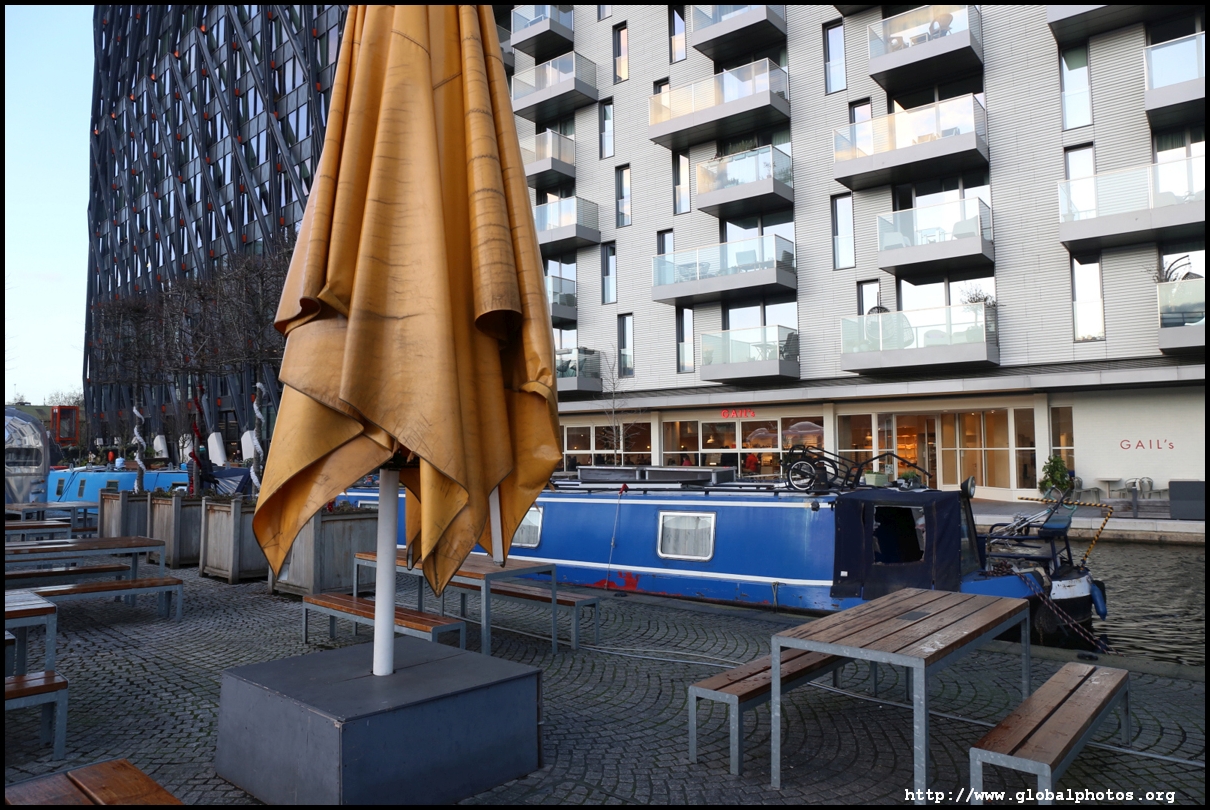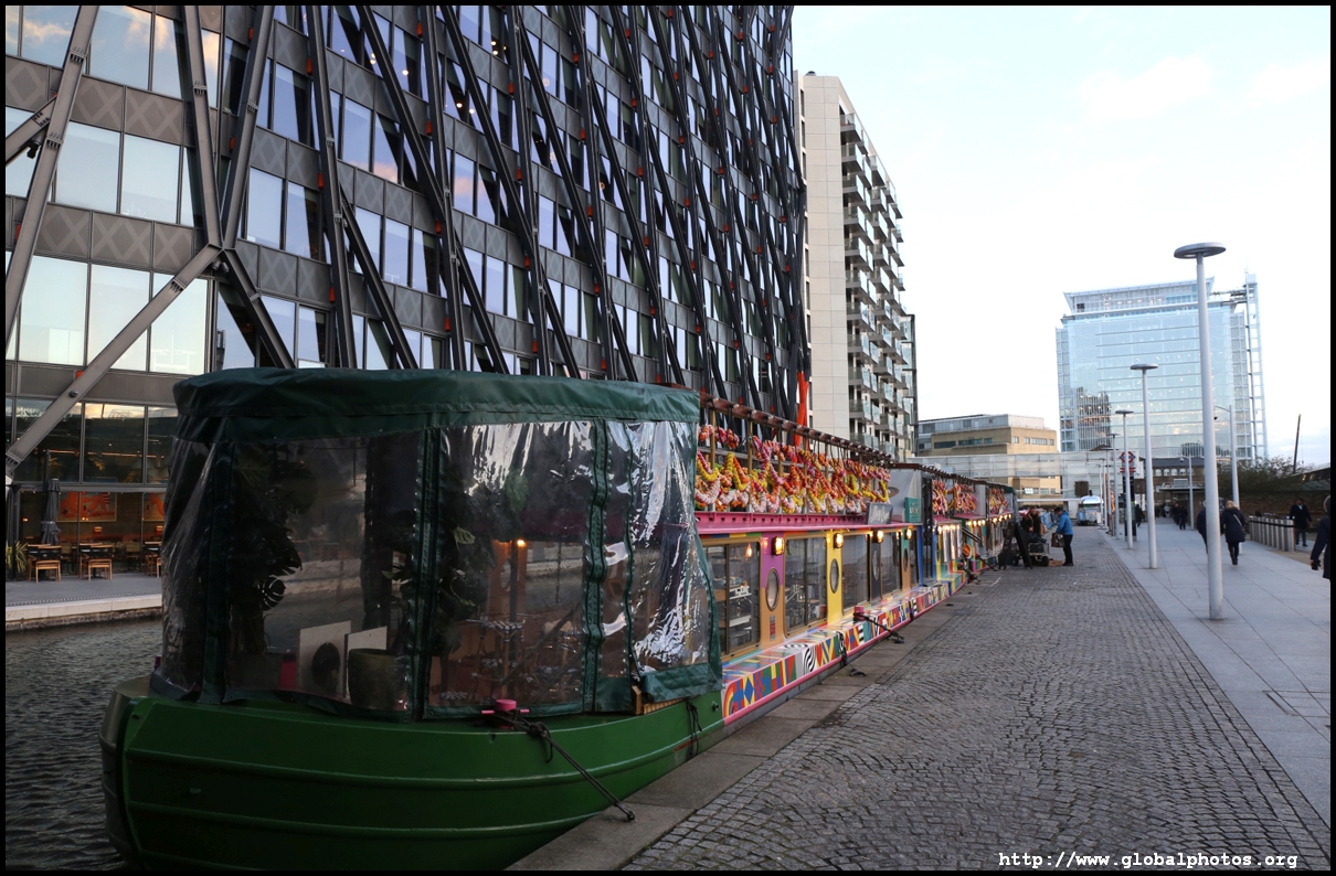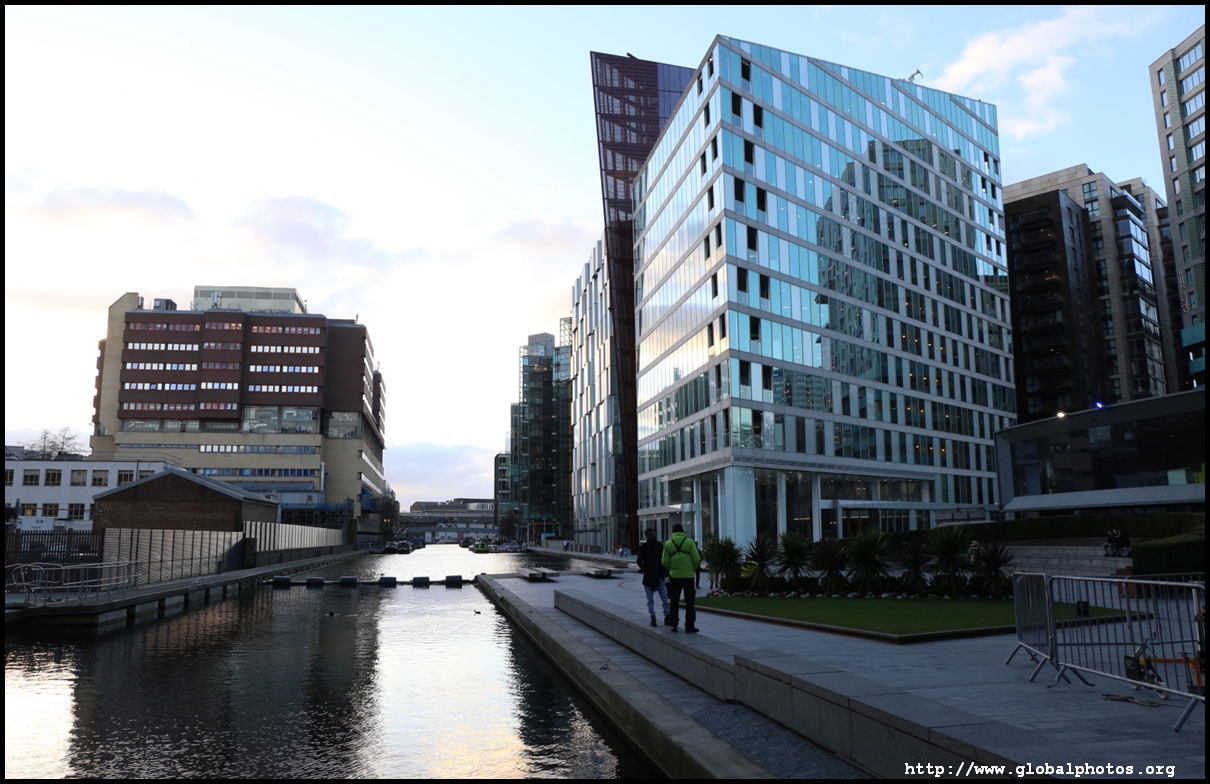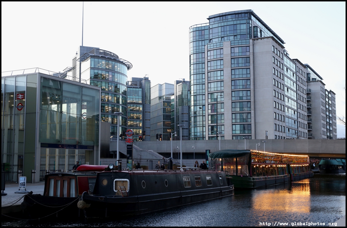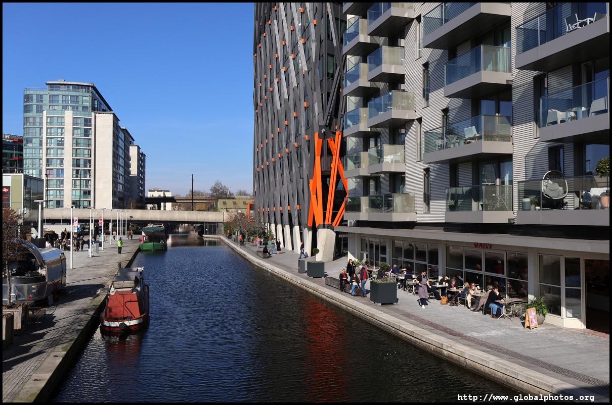 Paddington Basin is section of the Grand Union Canal that opened in 1801, facilitating trade between London and the Midlands. The railroad arrived in 1838 with Paddington being the Great Western Railway (GWR)'s terminus. However, as road traffic became more popular to move goods in recent decades, the canals and warehouses emptied out and the area became a wasteland.Change arrived in 1998 to redevelop the area. Merchant Square is the new neighbourhood of residences and offices to take advantage of the water views and easy access to Paddington station. These are located on the north side of the basin stretching west to east. My tour begins at the eastern end of Paddington Basin with modern tall towers and ends at Rembrandt Gardens, where grand mansions front a basin with many boats parked along the shore.