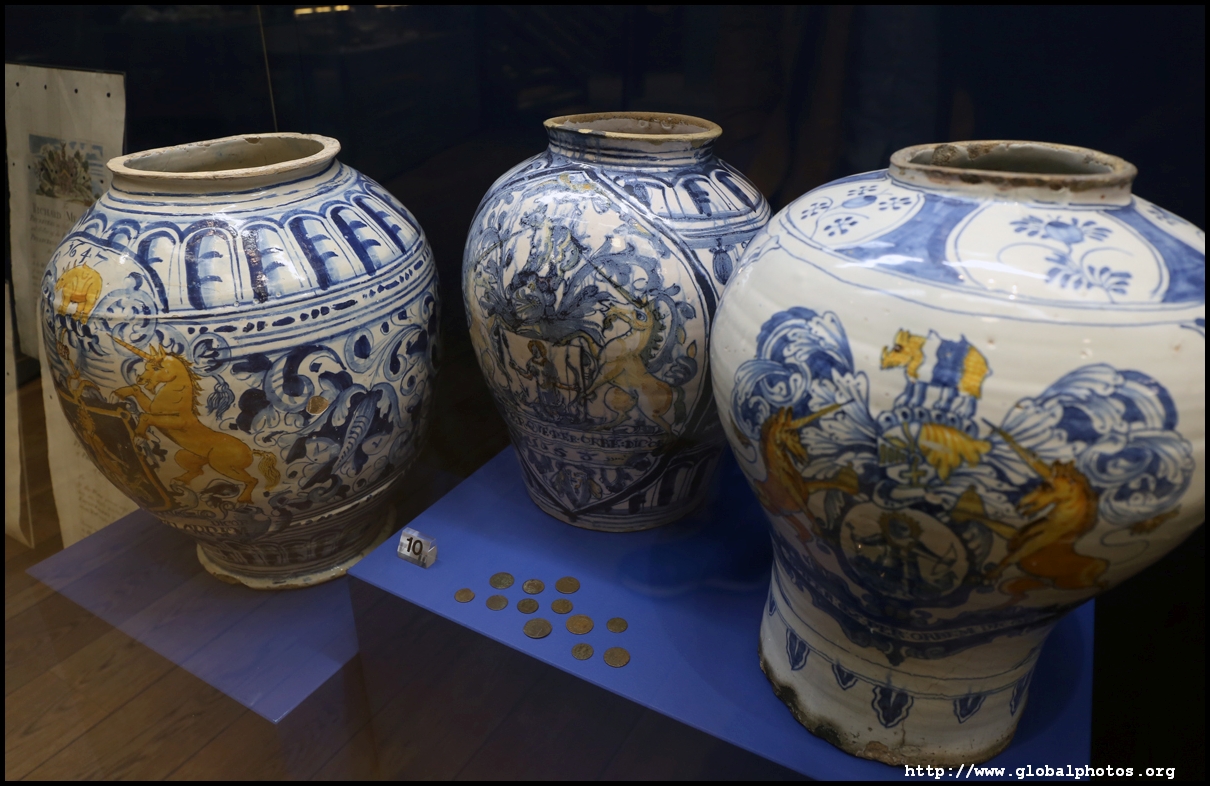 These Bohemian glass shop rounds from the 18th century contained various medicines such as oil of grayling to treat scaly skin, hyssop water to treat coughs and chest complaints, and prepared shells.
