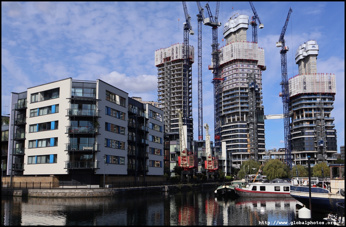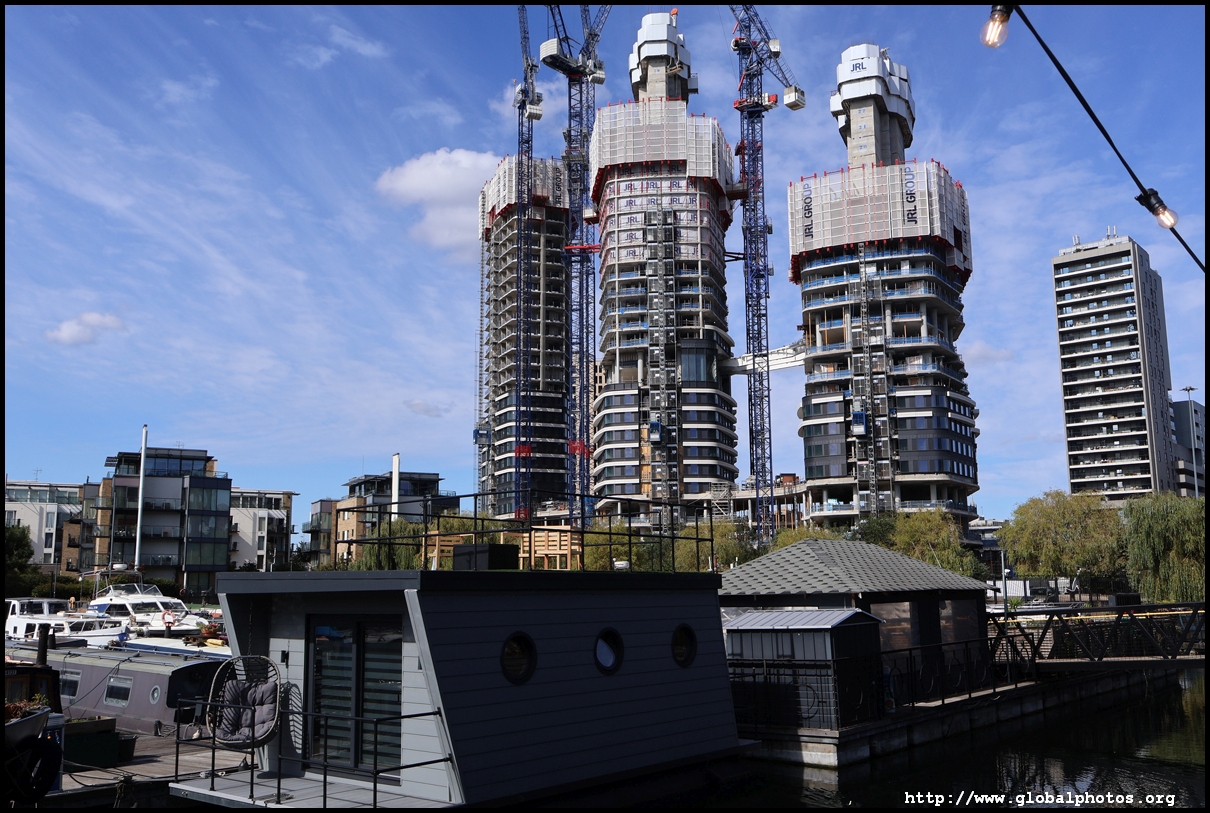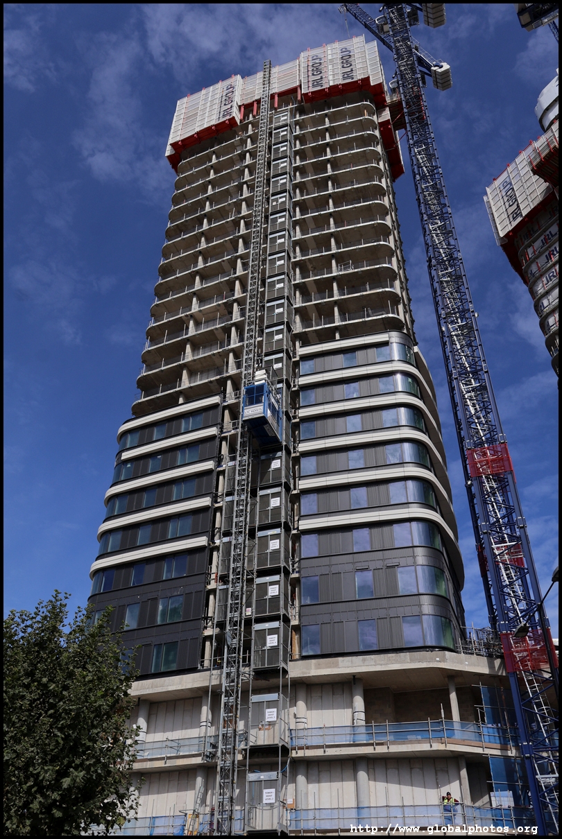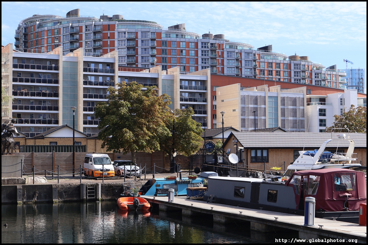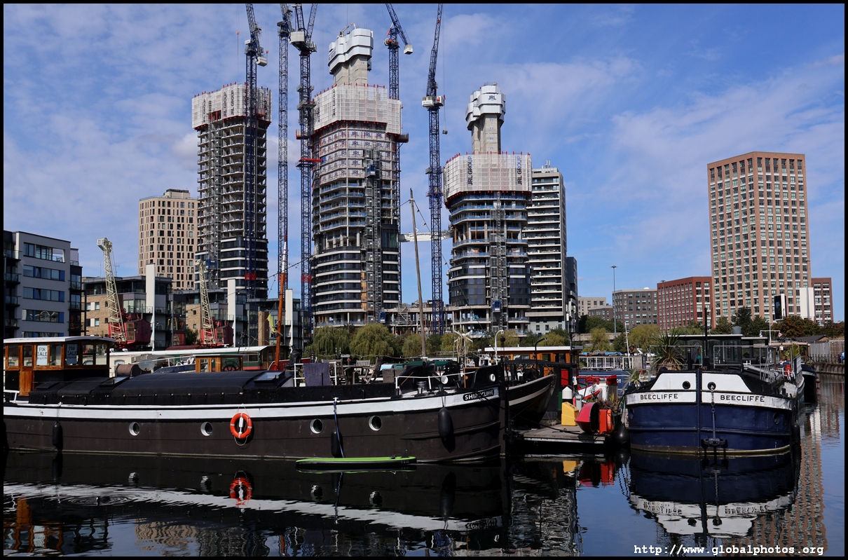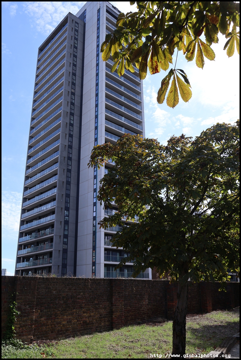 Within walking distance from Canary Wharf's residential and commercial towers, Poplar Dock was originally a reservoir used to manage the West India Docks' water levels. Coal was unloaded here from northeast England and onto other vehicles for distribution. Timber was also floated here to prevent them from drying up and cracking.In 1999, the dock was repurposed into a marina, and the surrounding areas have been regenerated into a quiet residential community. From Blackwall DLR station, cross the roundabout underground and you will arrive at a small park on Trafalgar Way. The rising towers are part of a student accommodation project at #2, which will consist of 3 towers rising 28, 36, and 46 floors offering about 1700 student units.