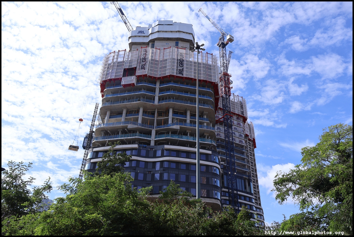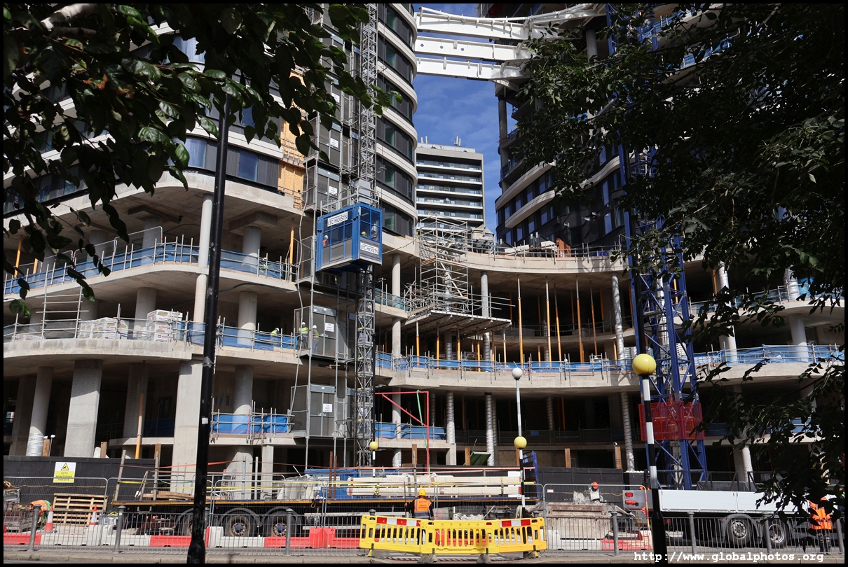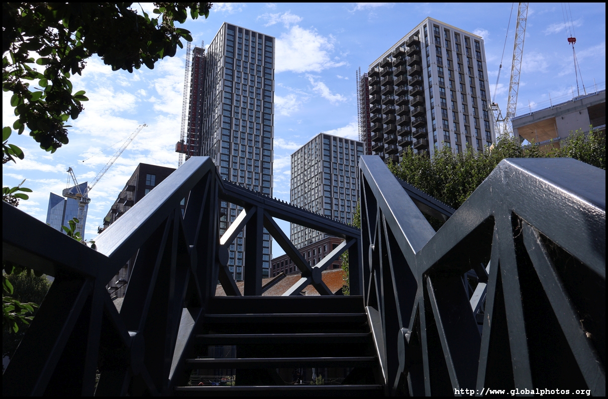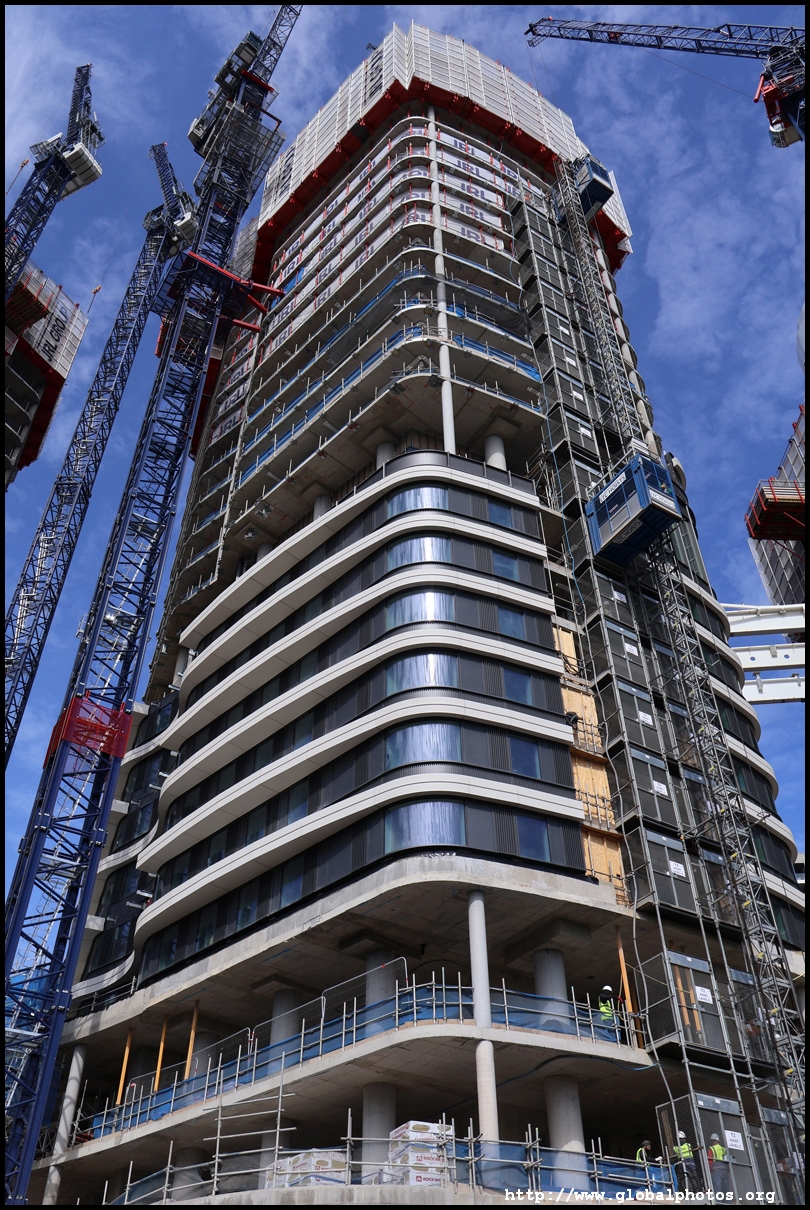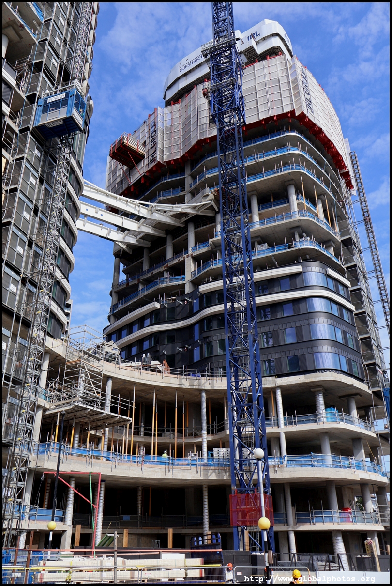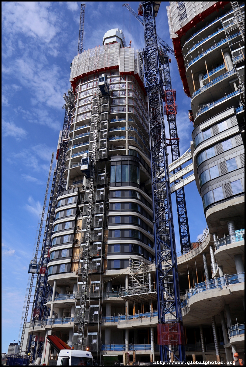 Within walking distance from Canary Wharf's residential and commercial towers, Poplar Dock was originally a reservoir used to manage the West India Docks' water levels. Coal was unloaded here from northeast England and onto other vehicles for distribution. Timber was also floated here to prevent them from drying up and cracking.In 1999, the dock was repurposed into a marina, and the surrounding areas have been regenerated into a quiet residential community. From Blackwall DLR station, cross the roundabout underground and you will arrive at a small park on Trafalgar Way. The rising towers are part of a student accommodation project at #2, which will consist of 3 towers rising 28, 36, and 46 floors offering about 1700 student units.