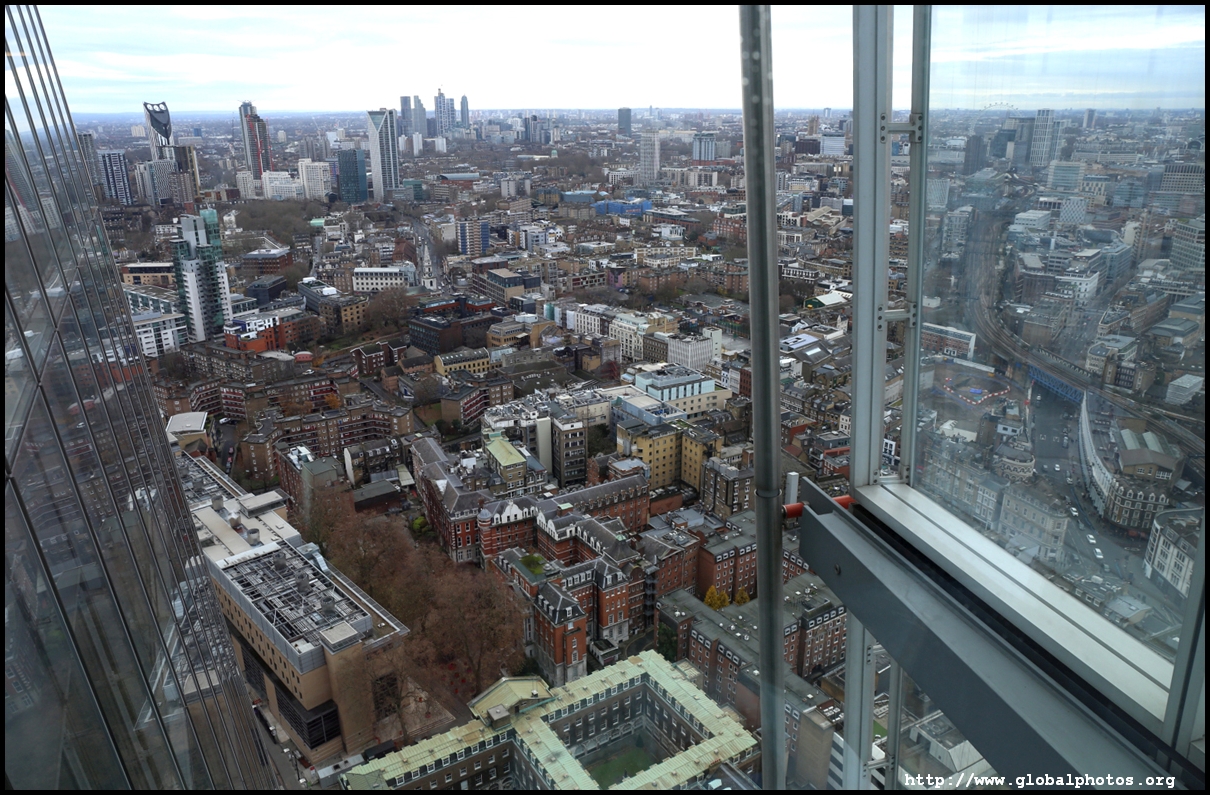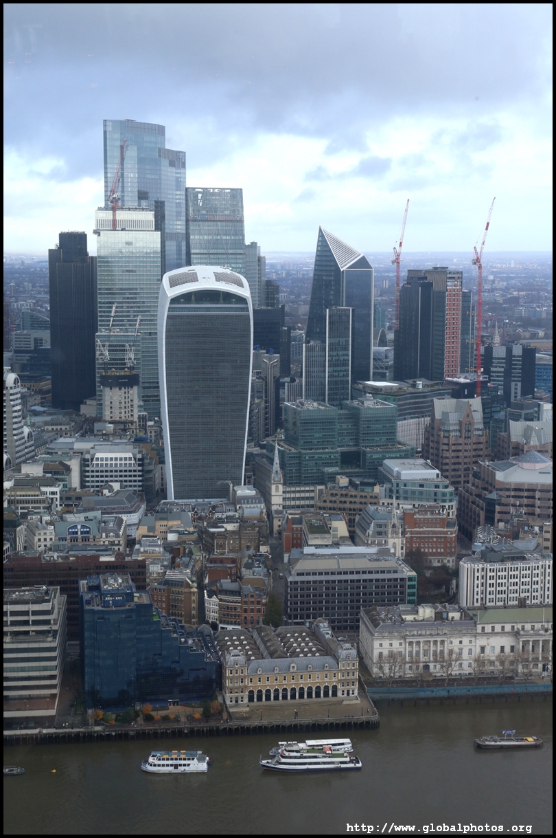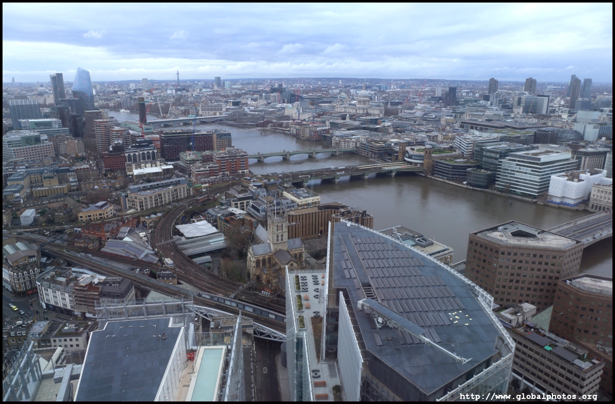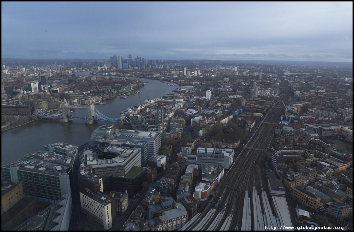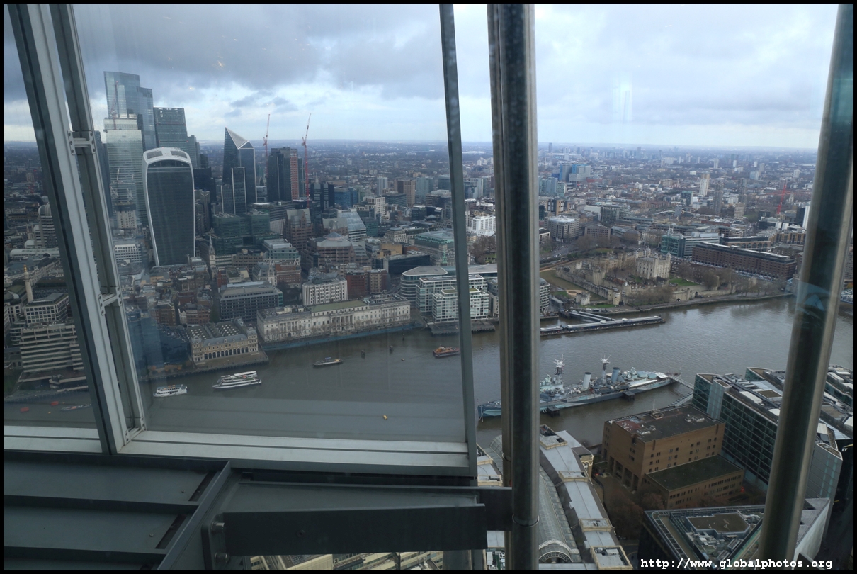 The Shard is located on top of London Bridge station and opened in 2012. Funded by the State of Qatar, Renzo Piano designed the architecture with inspiration from church spires and ship masts.The building has multiple uses, including 26 floors of offices, 3 floors of restaurants, 19 floors of hotel, 13 floors of residences, and London's highest observation deck on the 72th floor. The Shangri-La Hotel occupies the middle section from the 34th to 52nd floors with 202 rooms and several restaurants. I picked the highest one, Gong, which serves Japanese cuisine and is the highest hotel bar in Western Europe. The restaurant's tables face The City and east towards Canary Wharf. At these heights, views in any direction are great.
