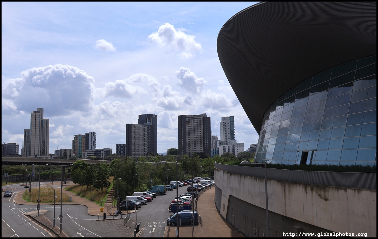 The Aquatics Centre features a 50m competition pool and a 25m diving pool underneat a 3000 ton wave-like steel roof measuring 160m x 80m. It has a sustainability feature where the pool water is used to flush the toilets.