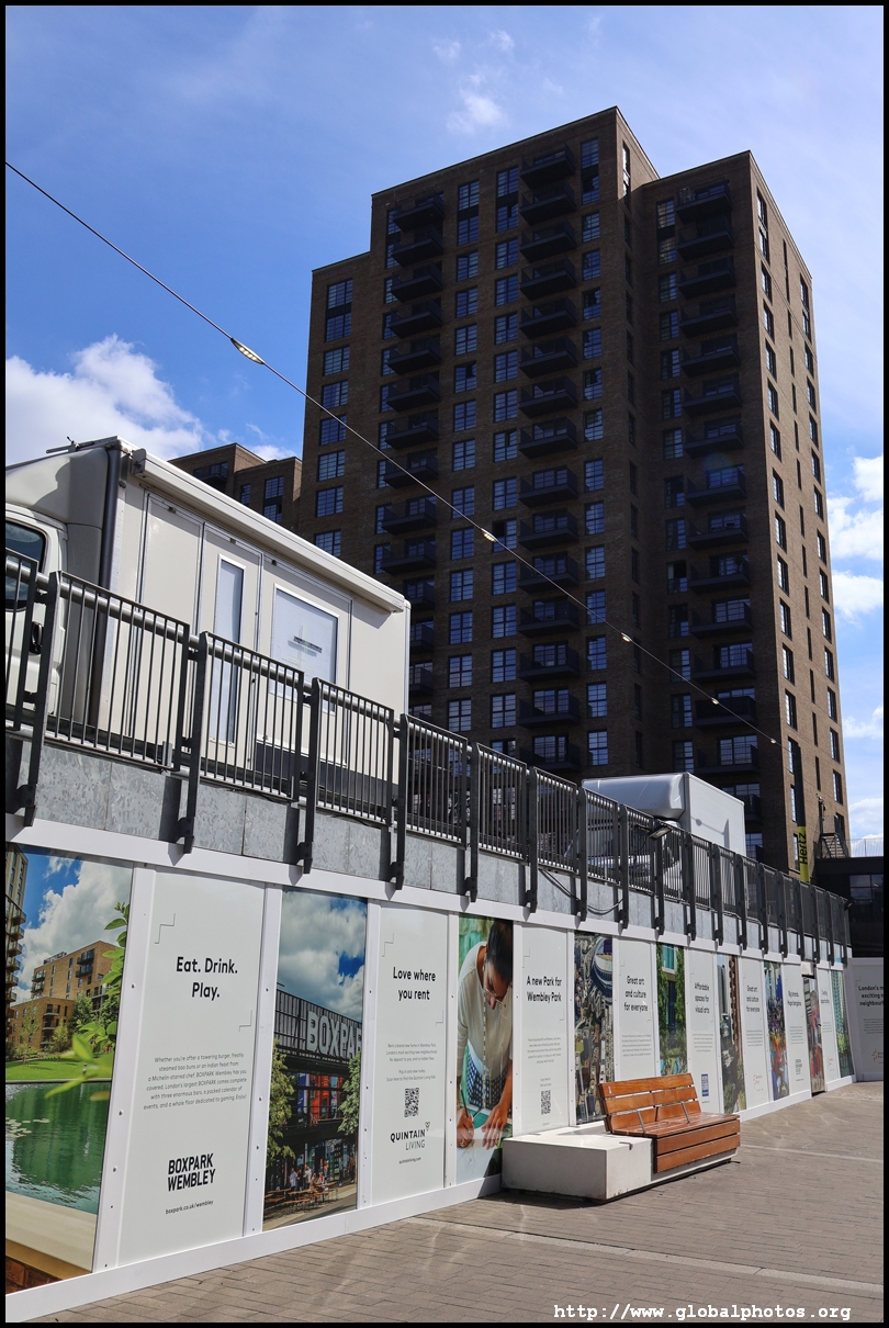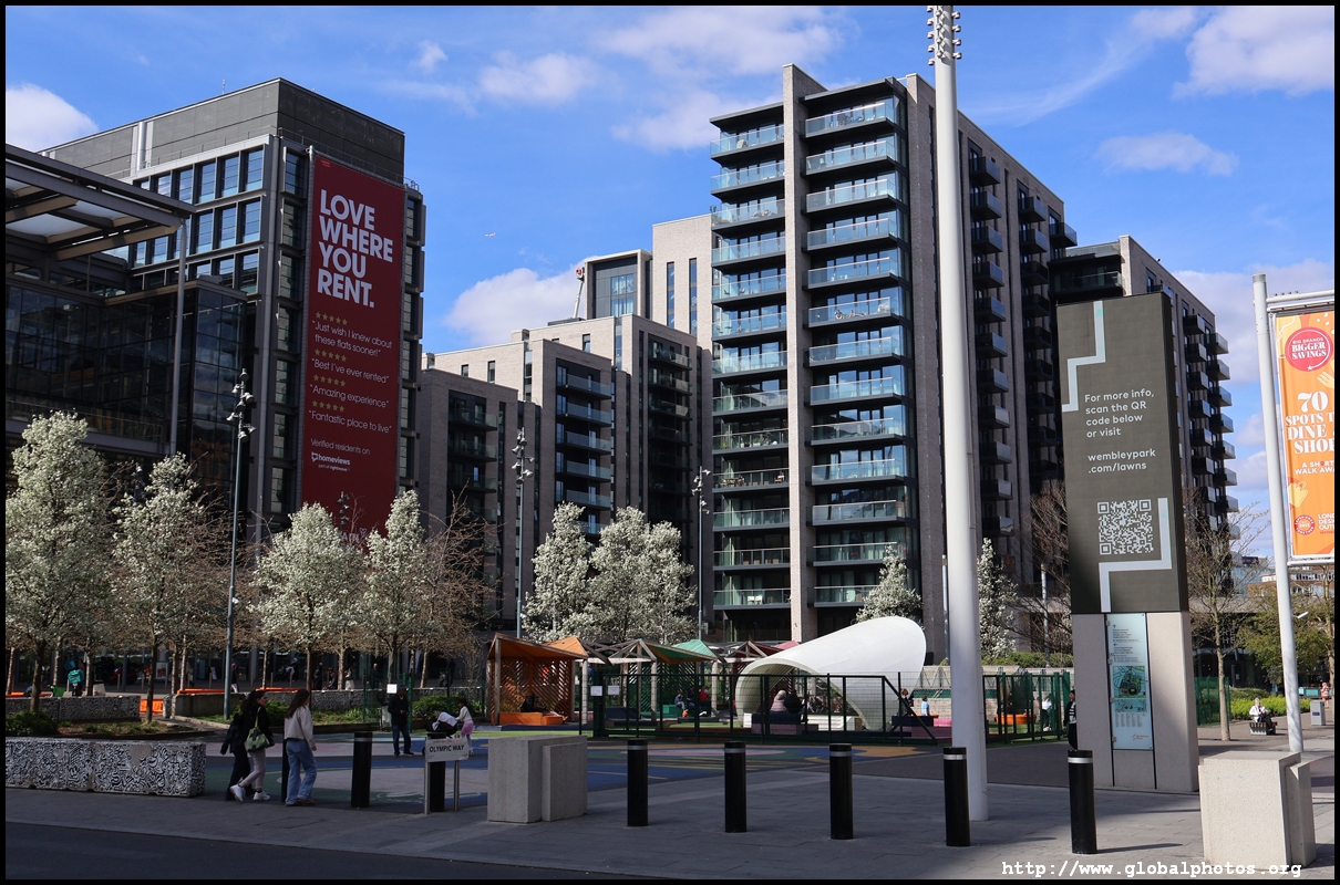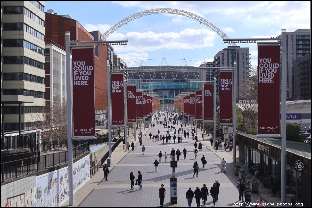 The area around Wembley Stadium is one of the country's largest regeneration areas. It is part of the overall Wembley development plan, which will deliver over 15,000 new homes. The plan's beginings go back to 2002 when the stadium was demolished. The Wembley Park area includes an outlet mall, hotels, civic centre, food market, and residential buildings clustered around the sports facilities.Olympic Way is the grand boulevard leading from the Underground station to the stadium with a vista over the development.