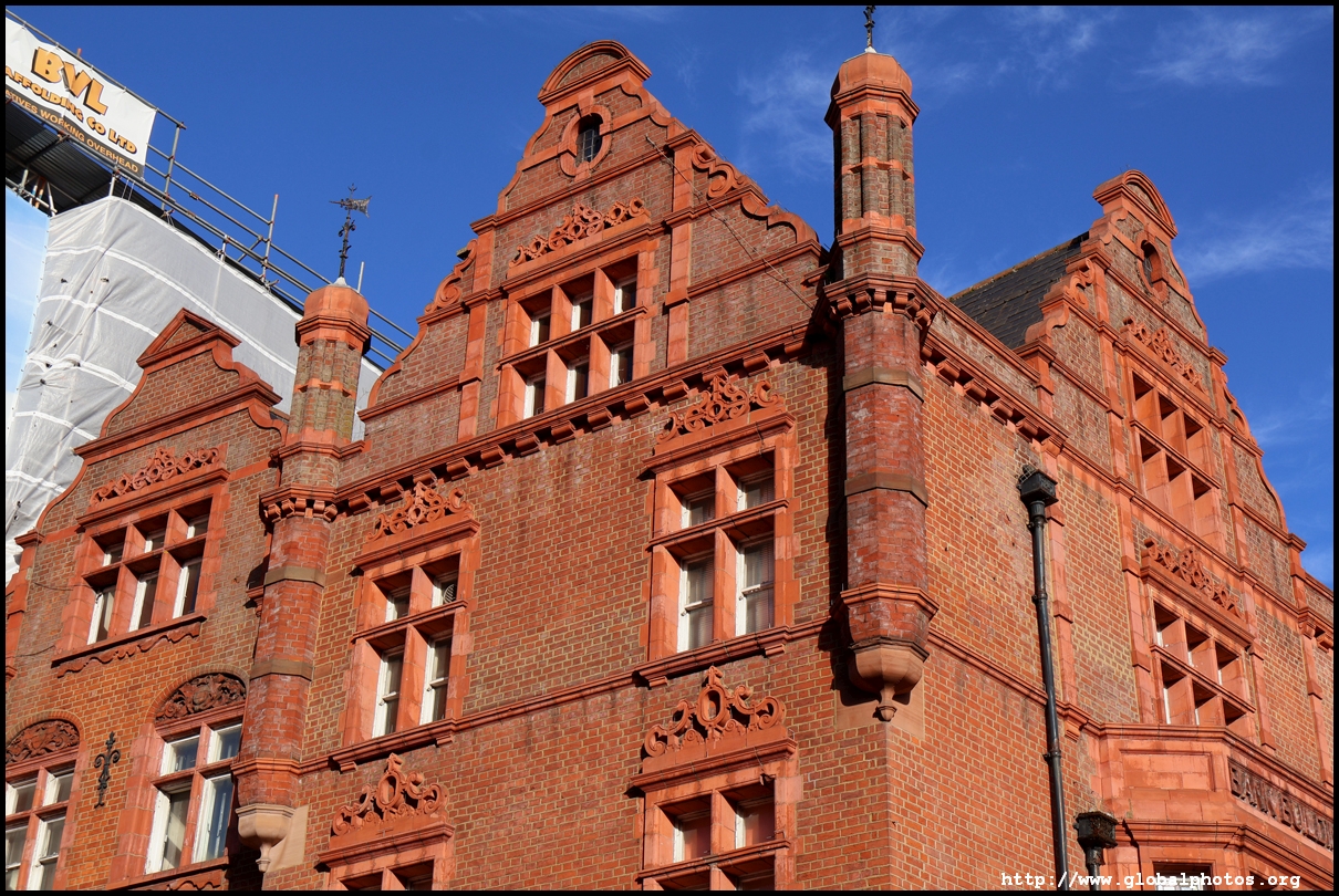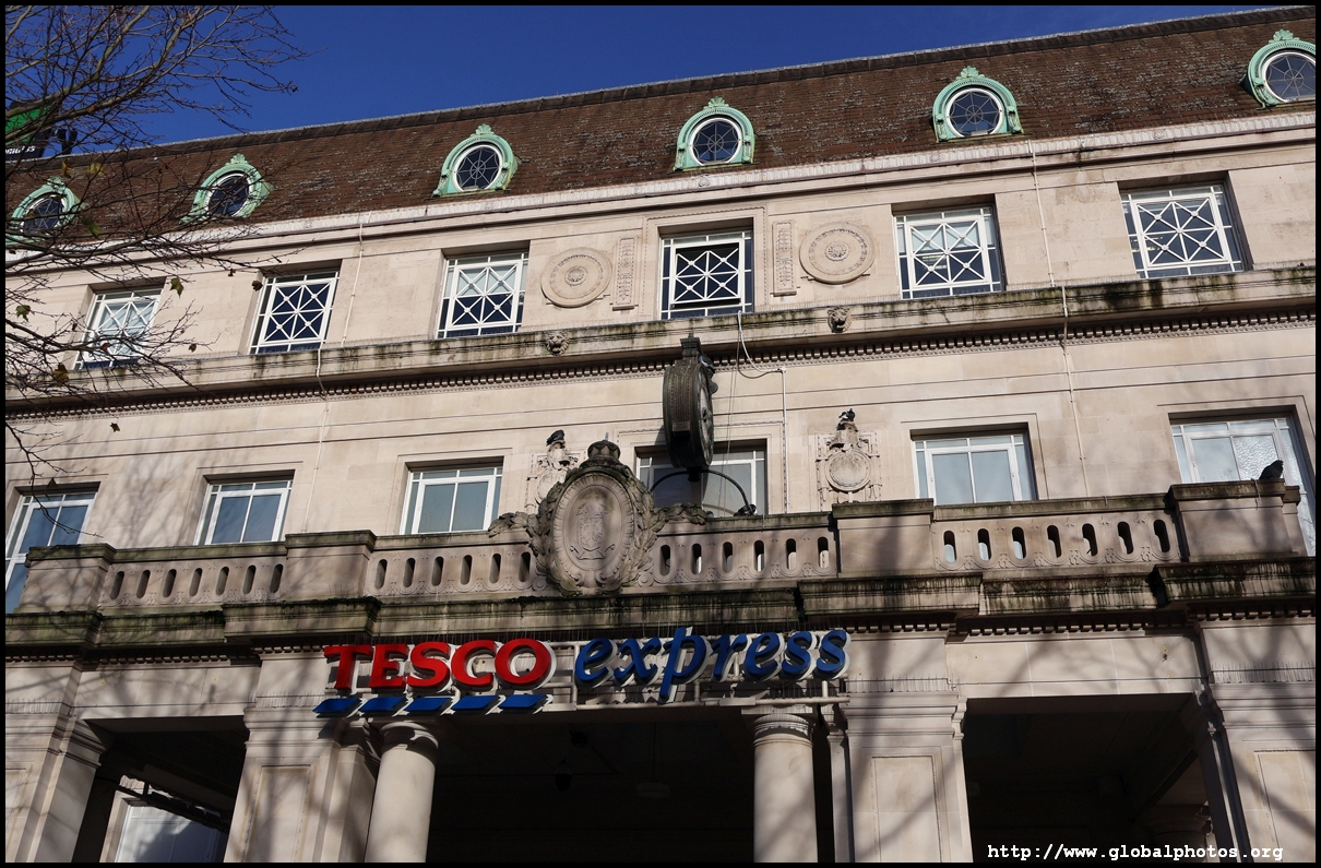 The Town Hall was built in 1928-31 with Portlan stone and now bears a big chain supermarket sign on it.