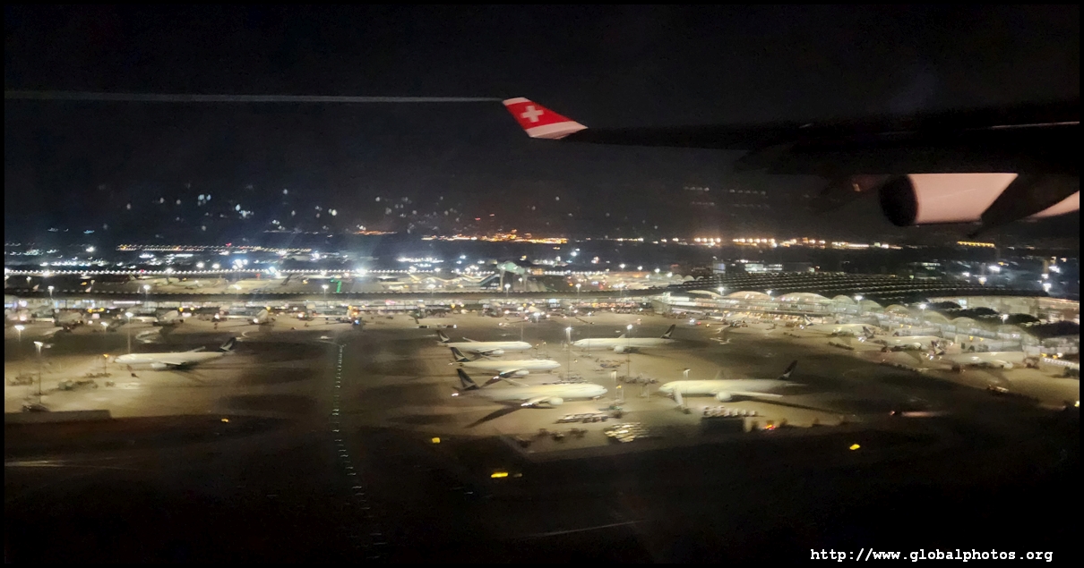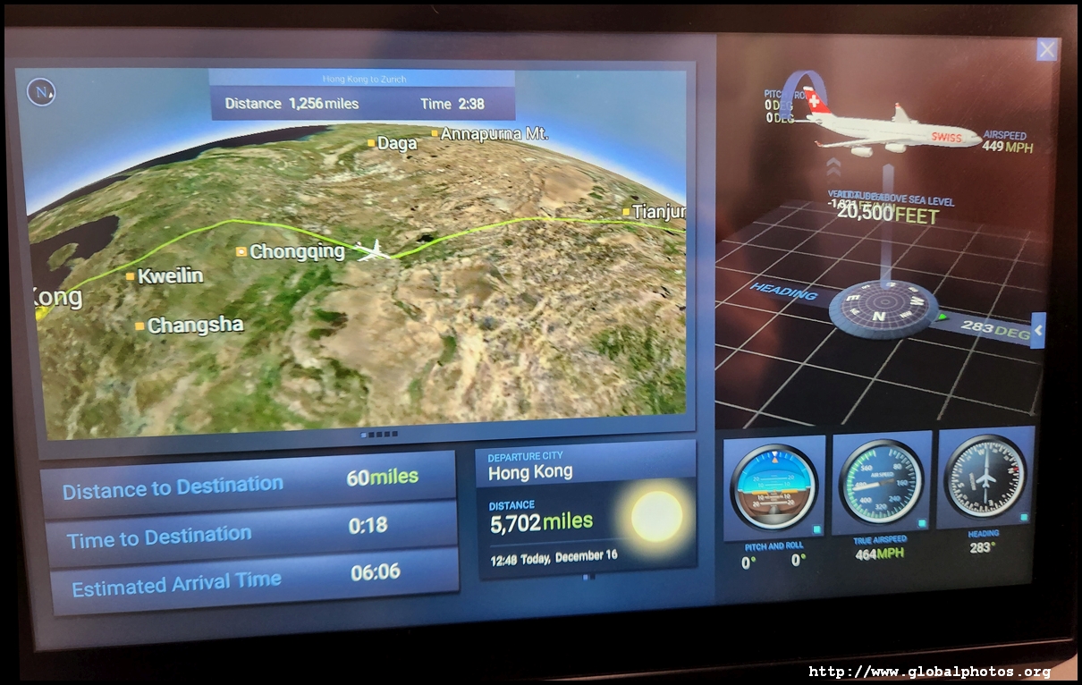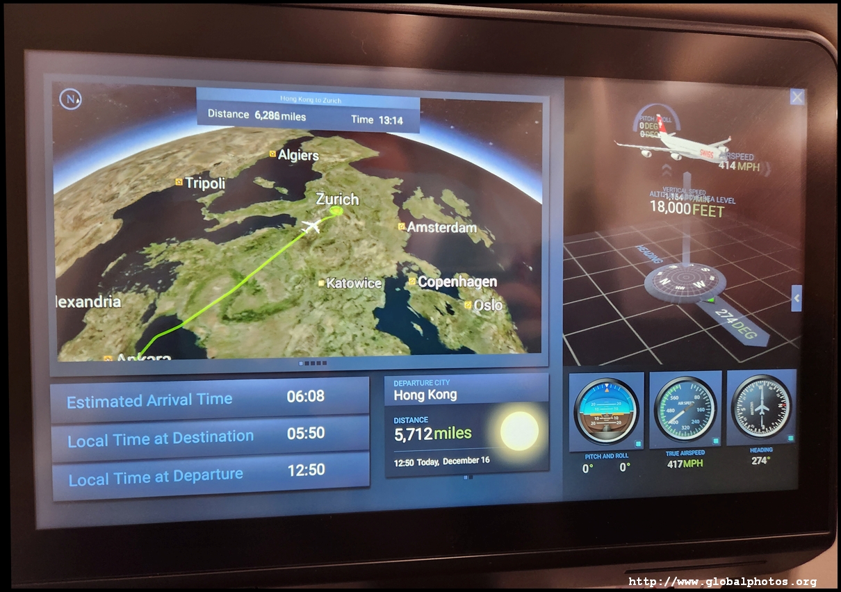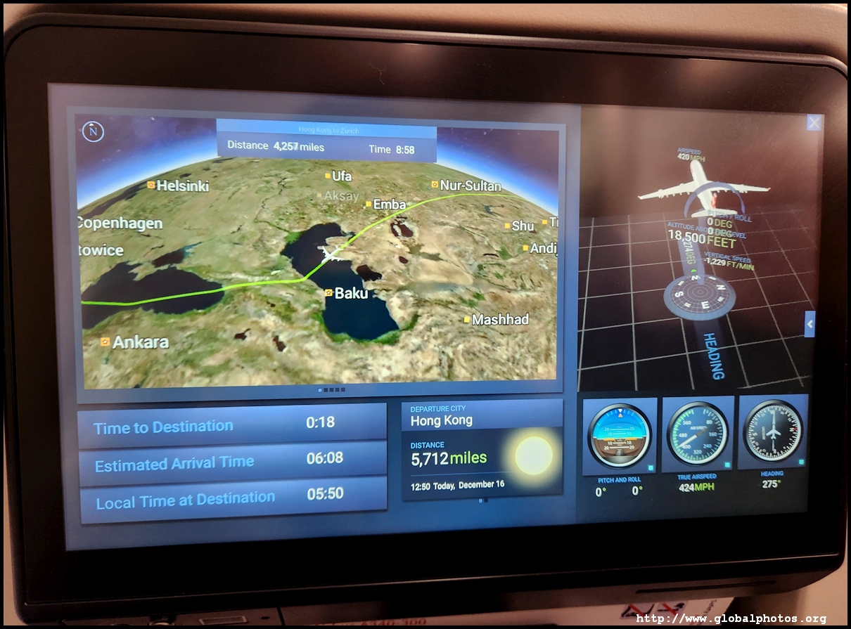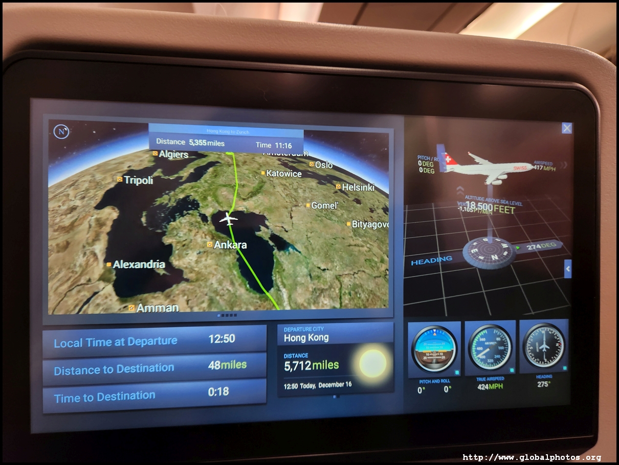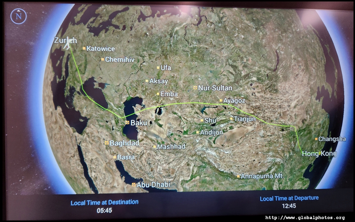 We pushed back 13 minutes late at 11:03pm and took off towards the east. The flight path was a bit odd as we veered south to avoid flying over Kowloon, then looped back north once we were east of the suburbs. With Russian airspace closed, we would fly part way through China and the Central Asian states, then go south and around Caucauses and avoiding the Ukraine conflict to reach Zurich.