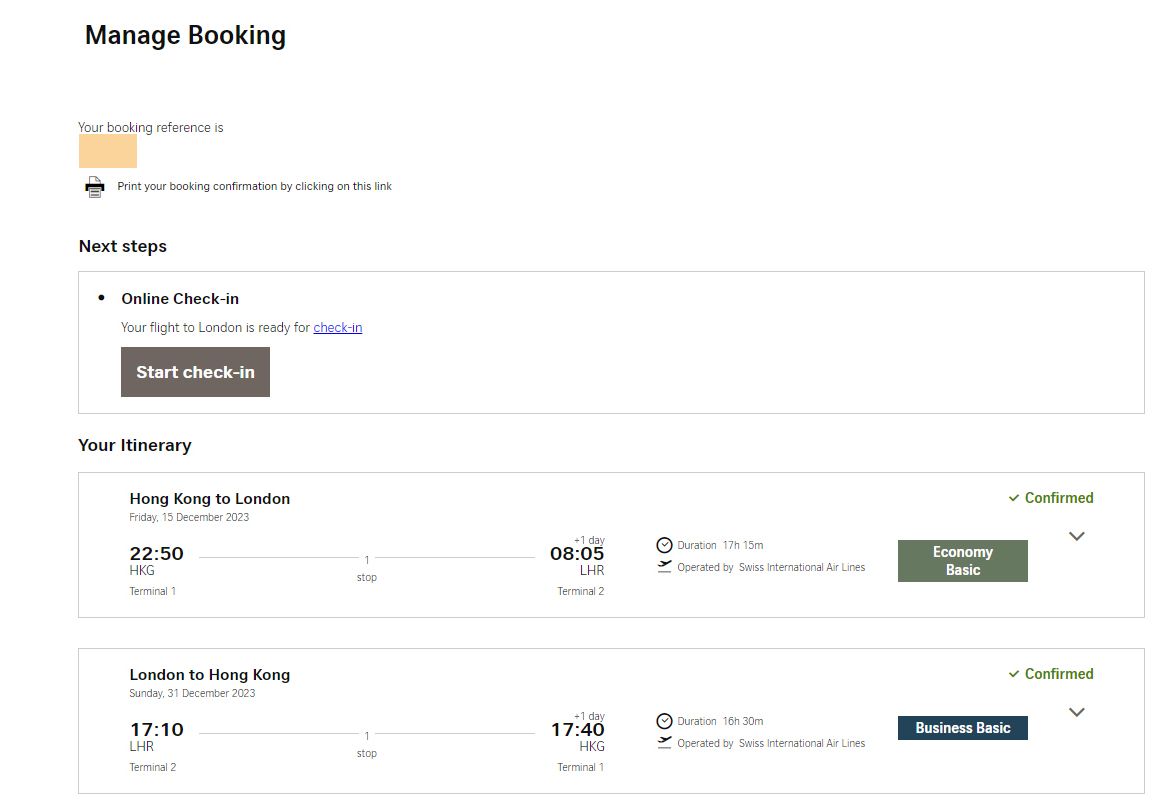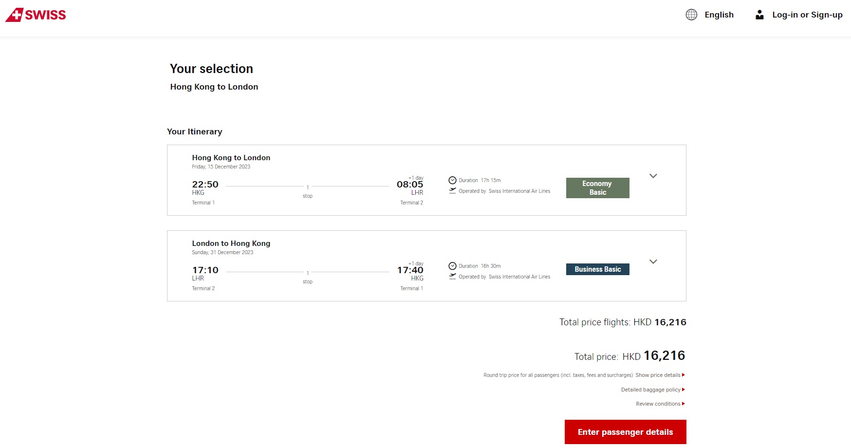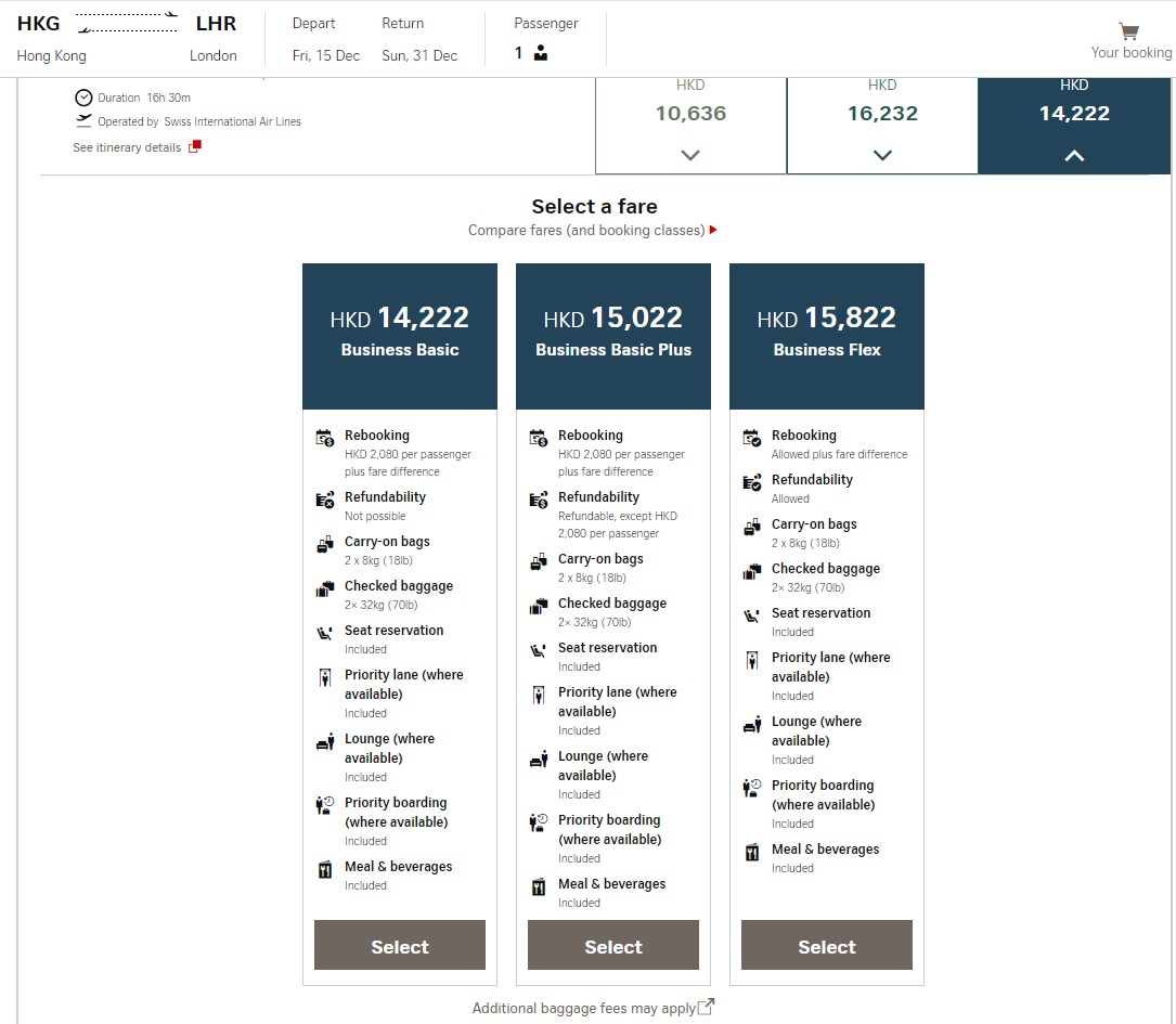 15 December 2023The world of aviation fare pricing turns up some anomalies every now and then. No, this is not an error fare, but during my research for Christmas in London, I noticed Swiss had some interesting pricing combinations. First, the outbound was a steal at only HKD $1554 with a transit in Zurich, which is a very manageable small airport and worlds better than Frankfurt. I still fondly remember the horrors of rushing from one end of Frankfurt's airport to the other to catch my connection. With a checked bag, it was only another HKD $440 more.