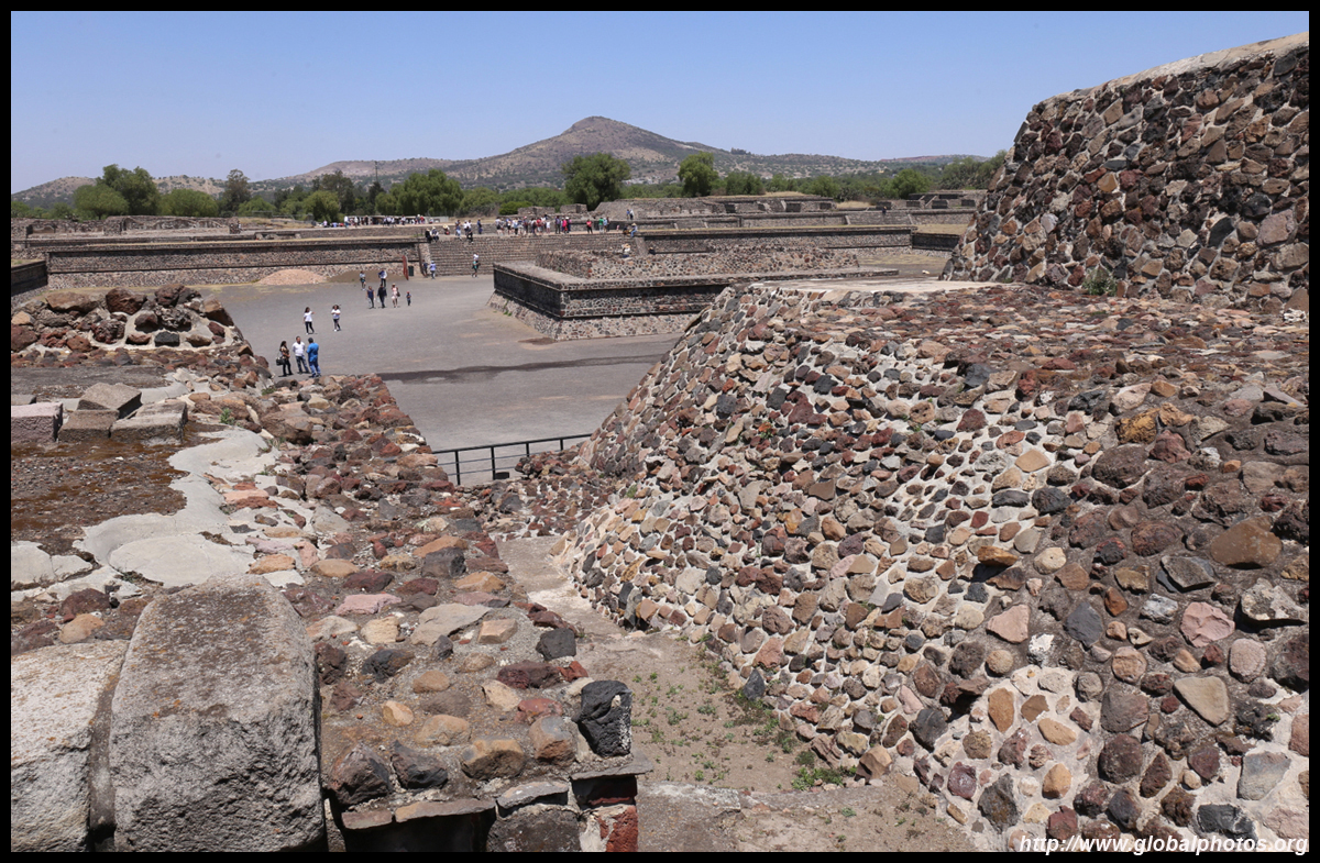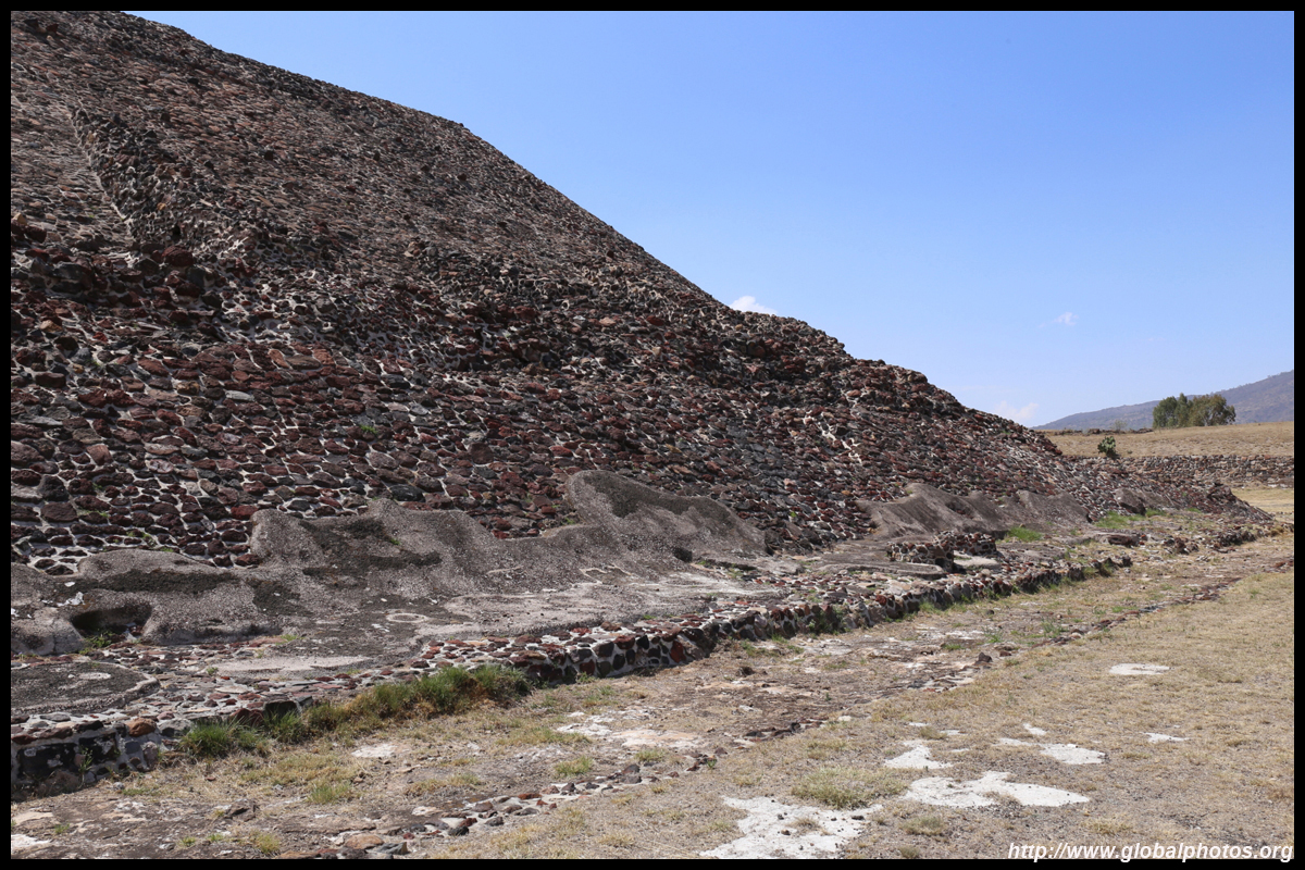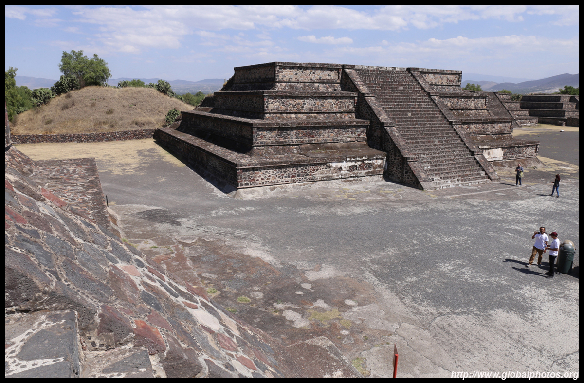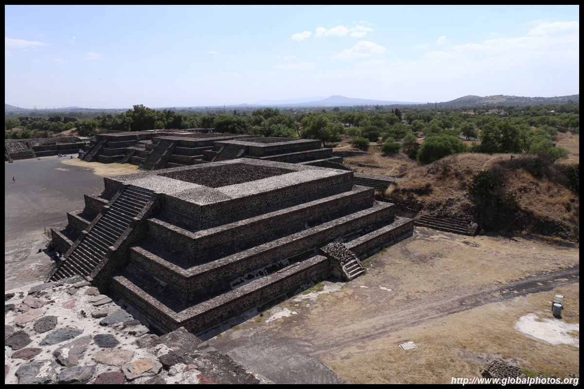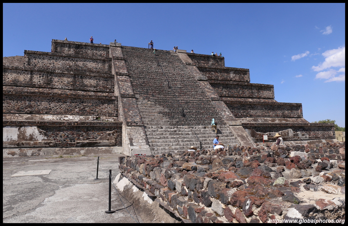 The Piramide de la Luna marks the end of the causeway and a long walk under the sun. Although a shorter pyramid, due to its higher elevation, the top is actually level with the Piramide del Sol.