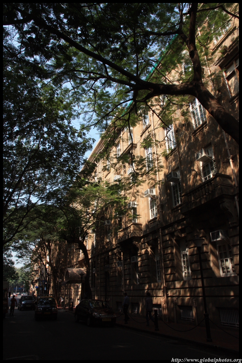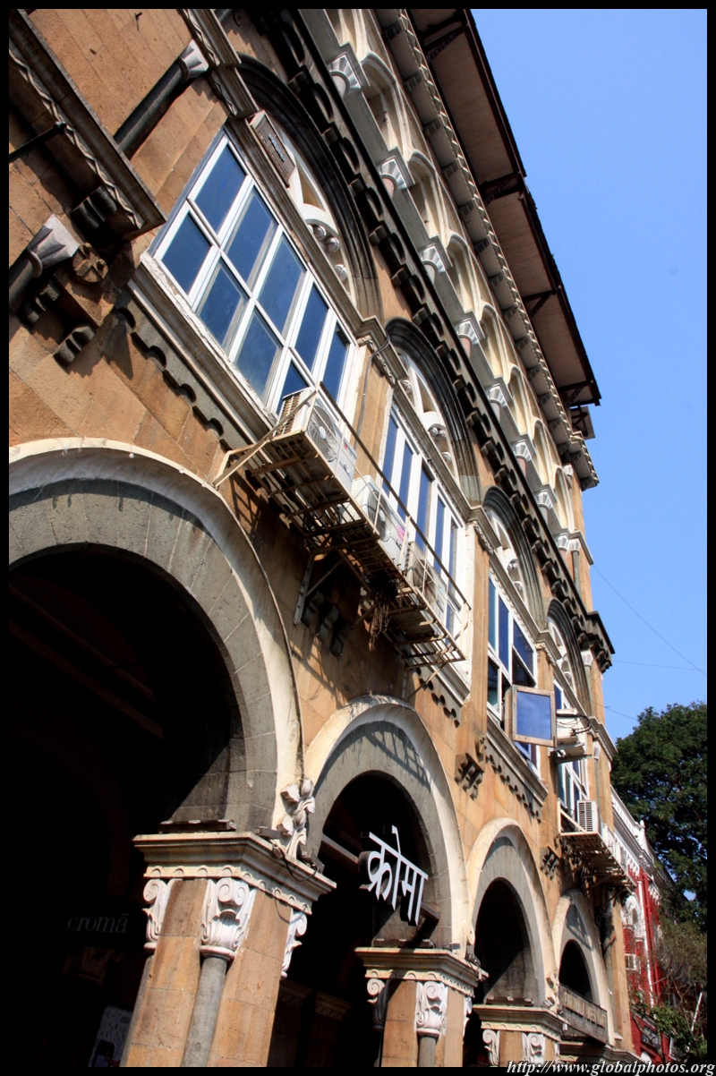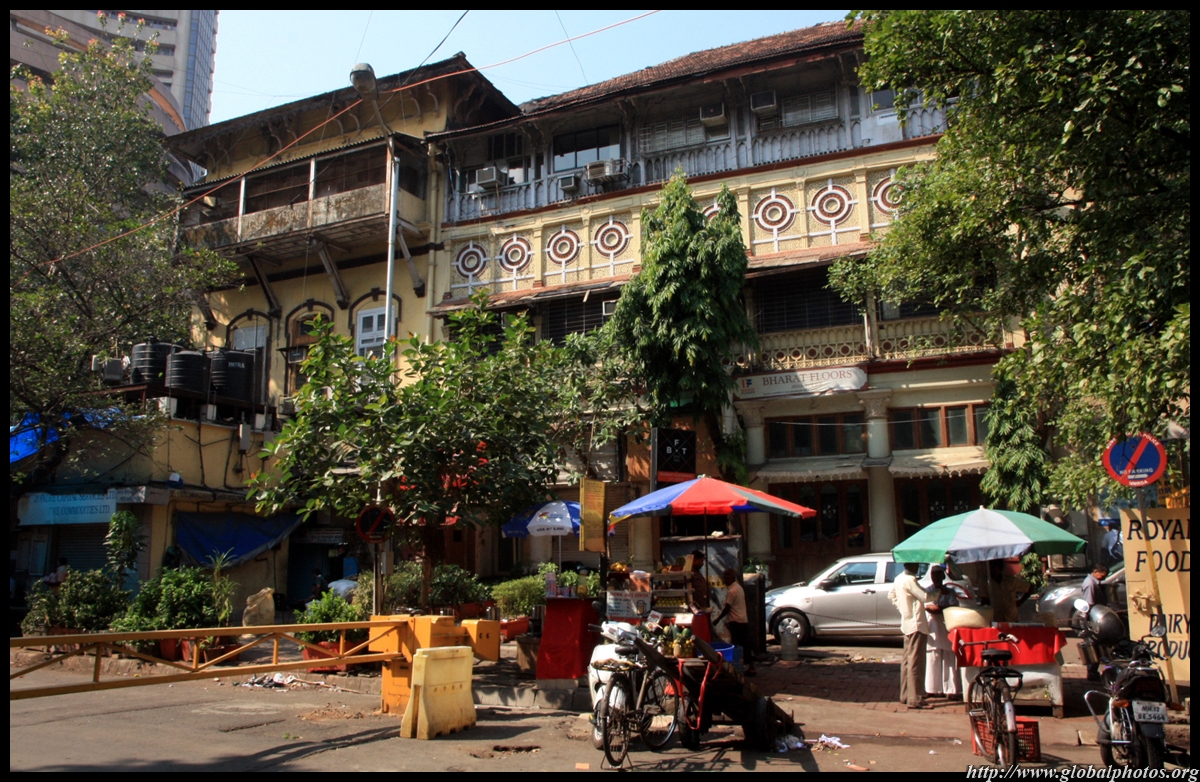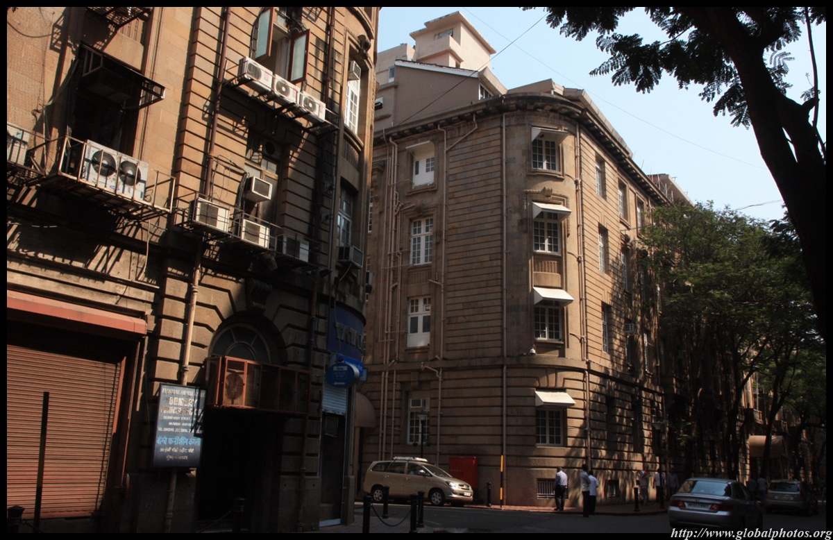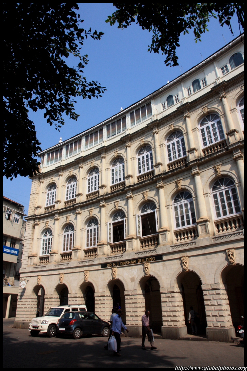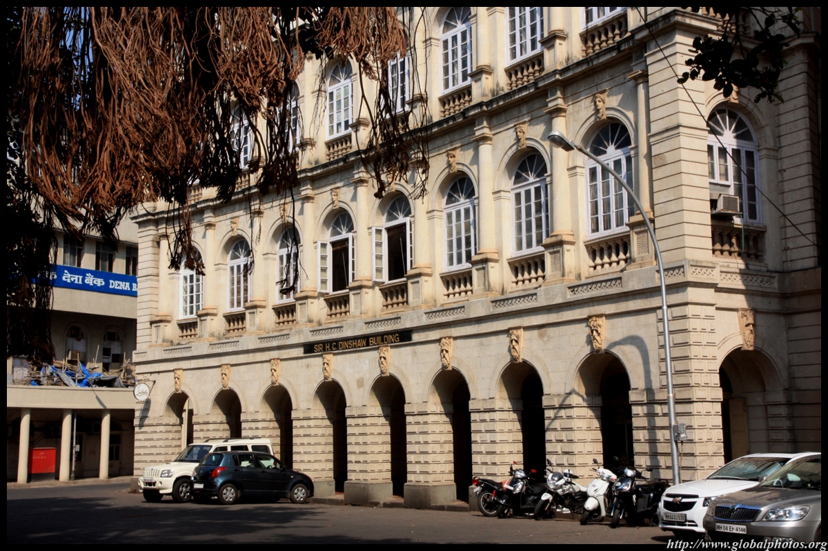 D Naoroji Road used to run parallel to the ramparts and was widened in 1865 to connect the public buildings near Flora Fountain with Victoria Terminus. On the western side of the street are well-laid-out buildings while the eastern side shows a more organic, chaotic side of the city. These buildings on the western side were built under strict design controls in 1896, with mandatory arcades and government approval of the designs.