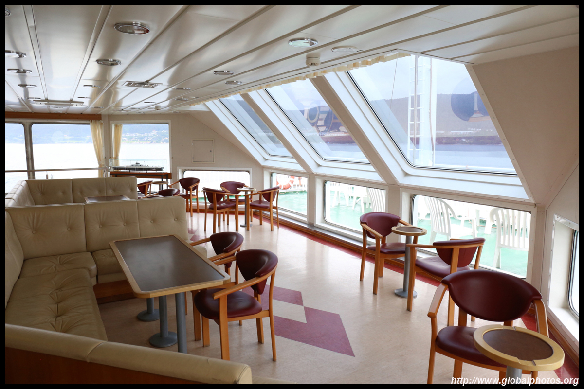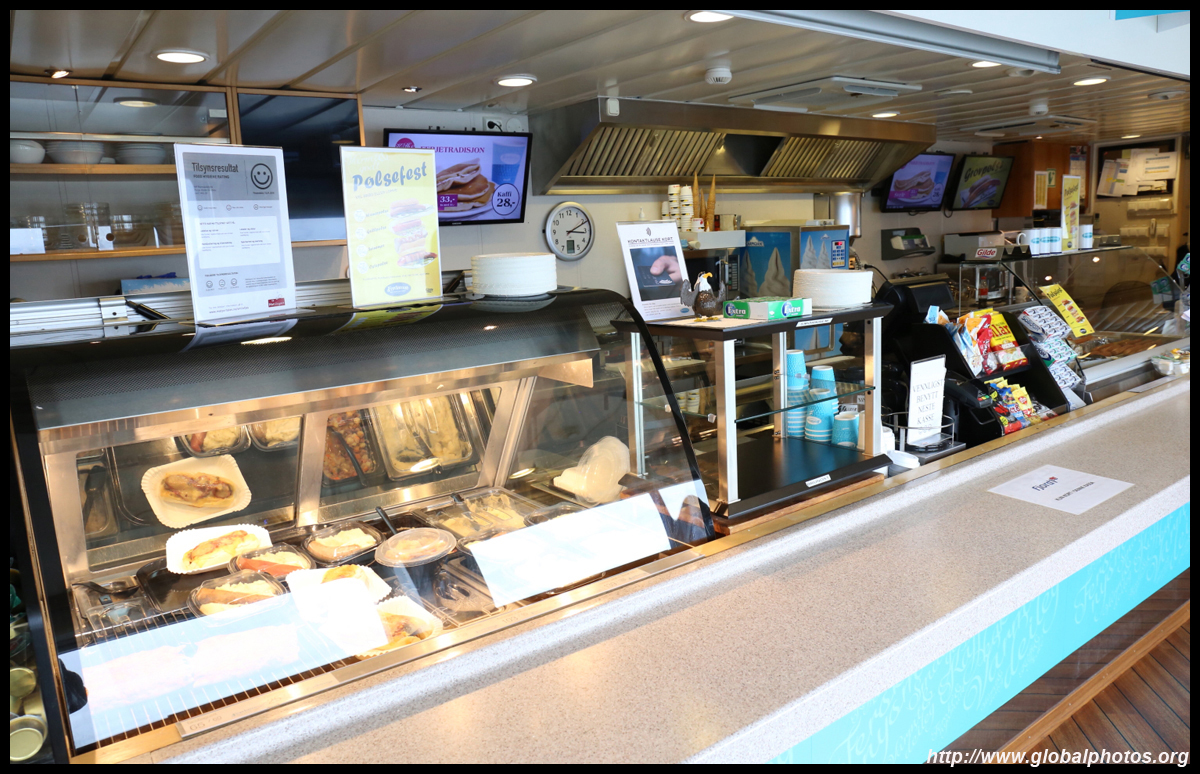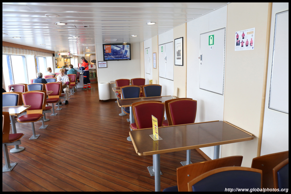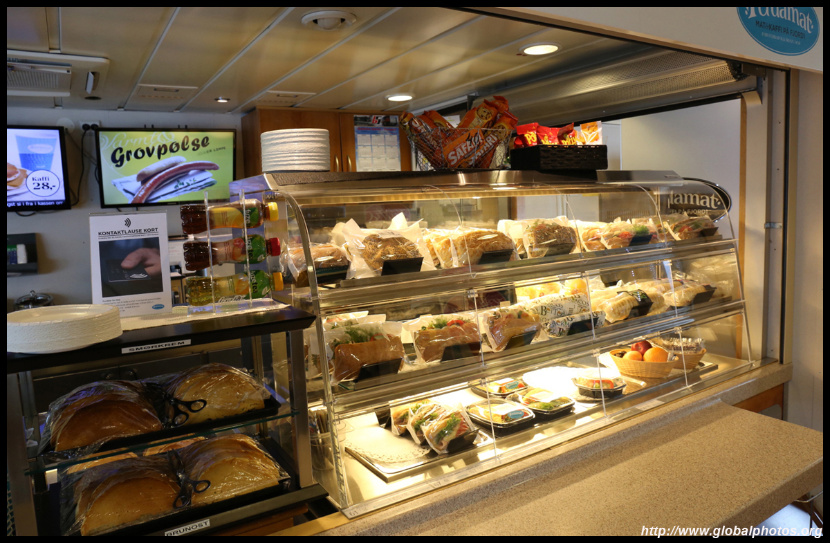 Norway's car ferries can offer a lot of nice amenities on board. This one has a large lounge area where you can grab a bite and enjoy the scenery. You are not trapped in your car at all.