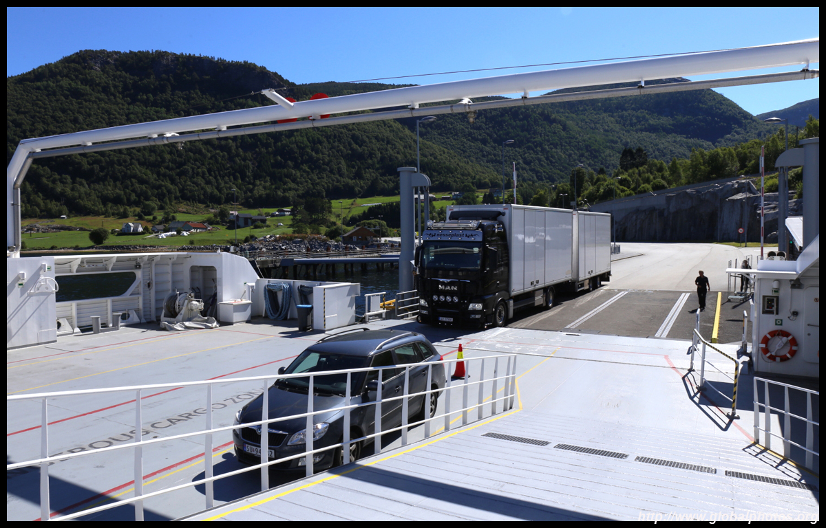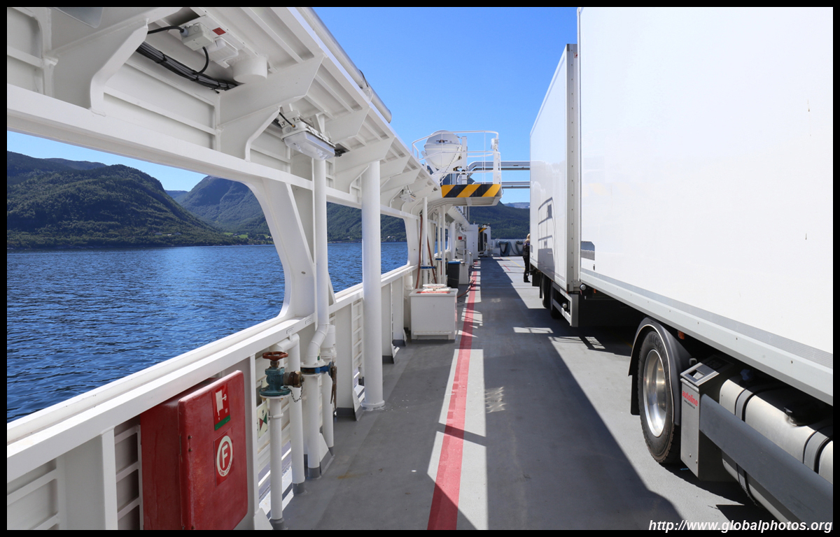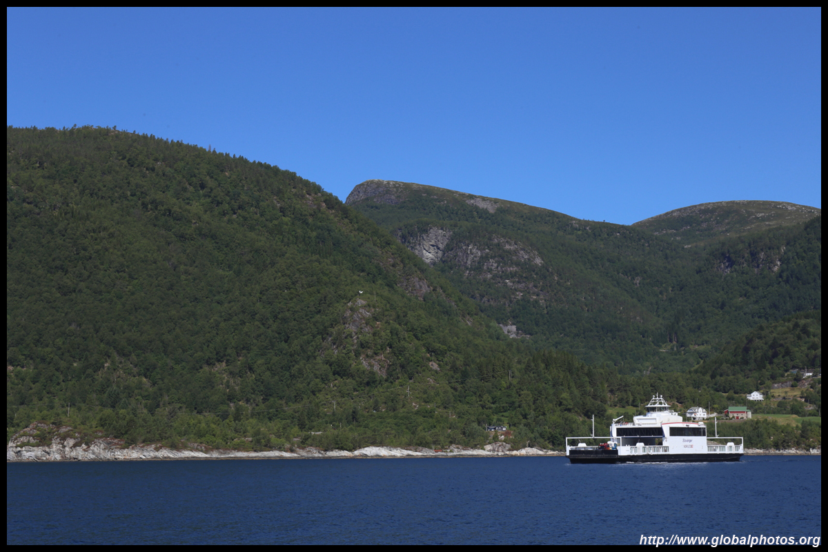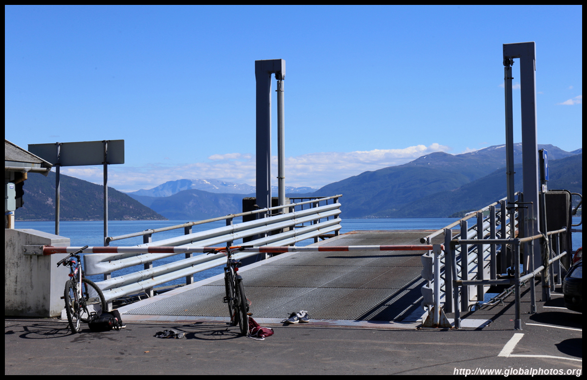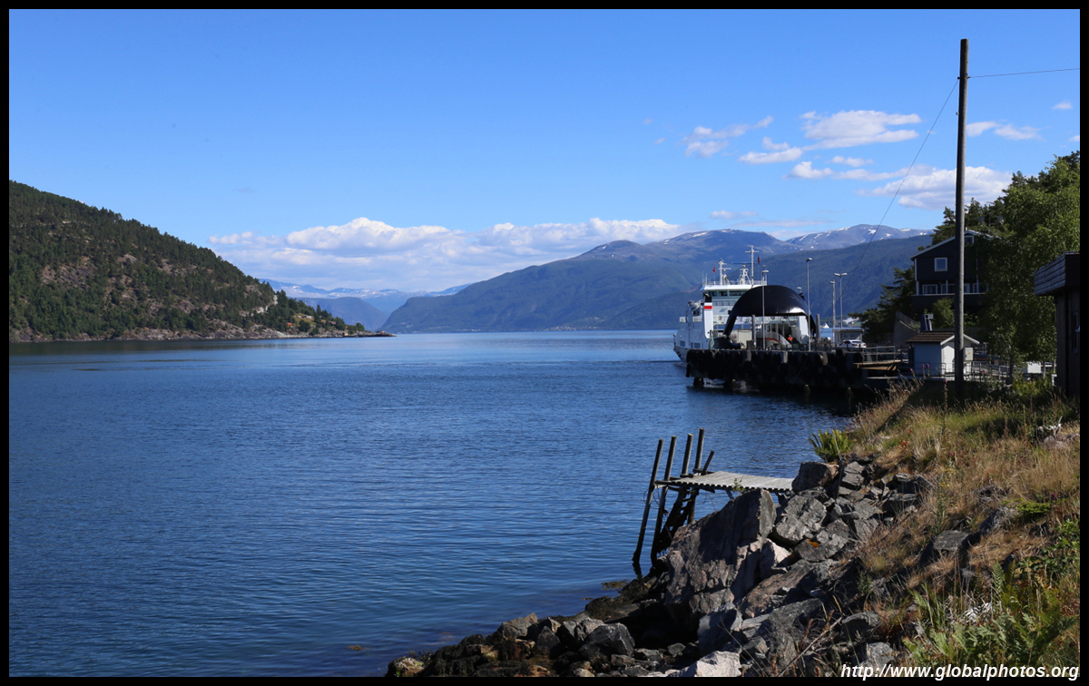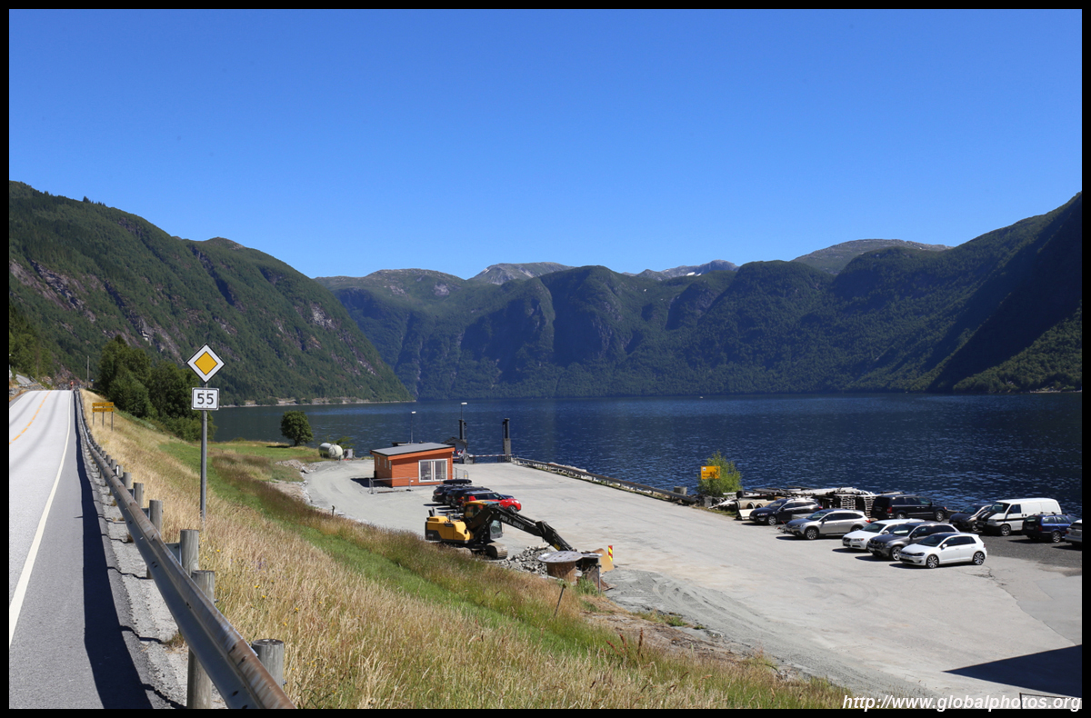 The road turns into a ferry at Ytre Oppedal. Many highways in the country pass through bodies of water, and regular ferries transport both vehicles and people across, where the road resumes.