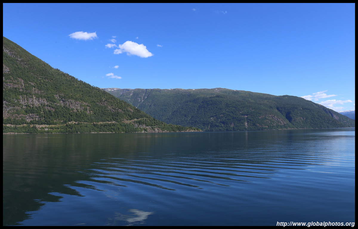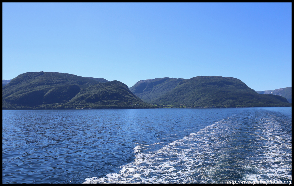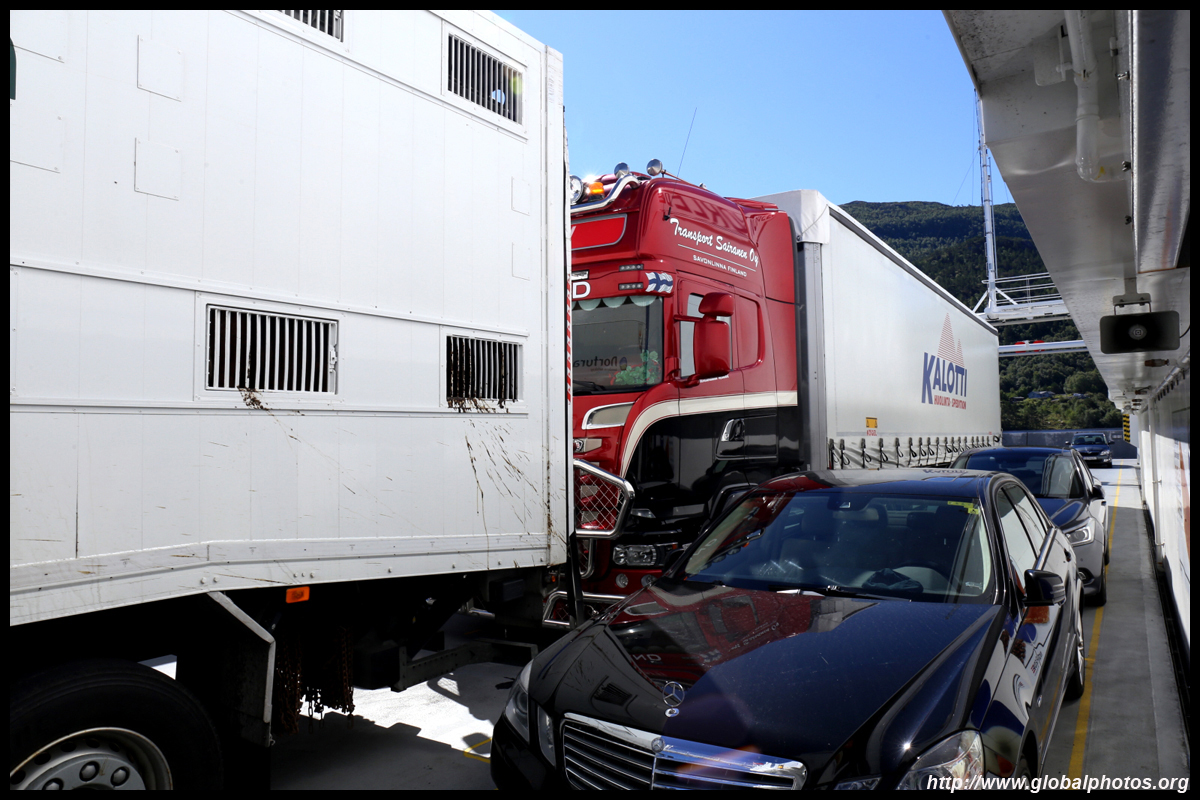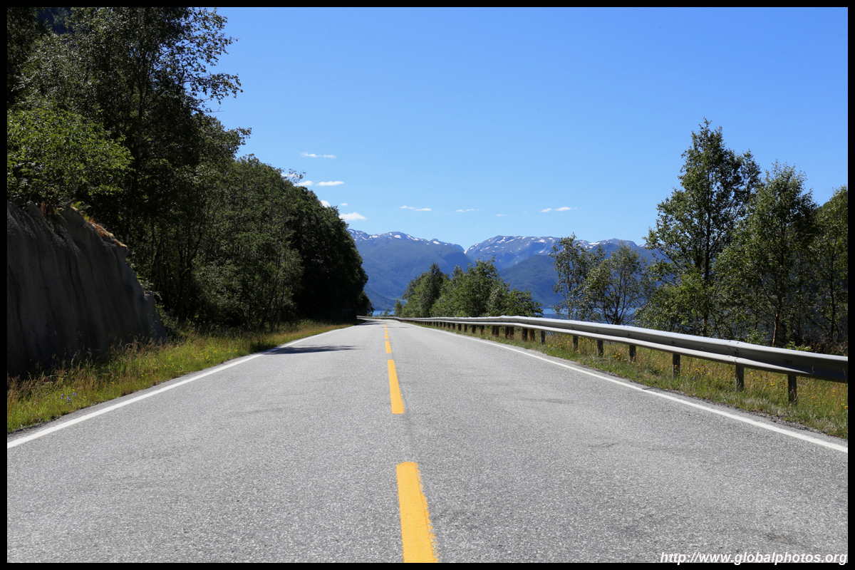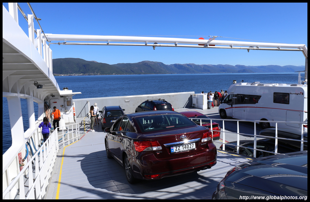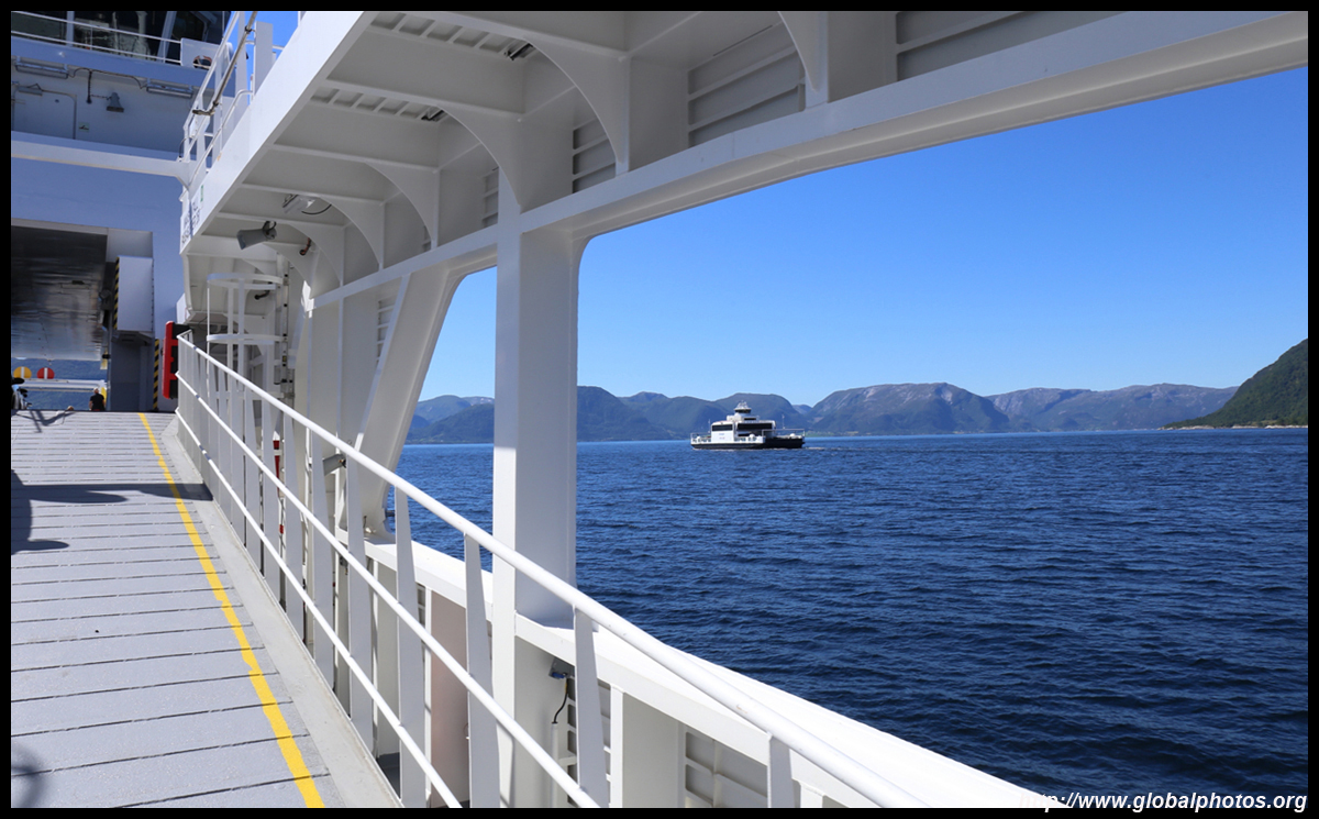The road turns into a ferry at Ytre Oppedal. Many highways in the country pass through bodies of water, and regular ferries transport both vehicles and people across, where the road resumes.