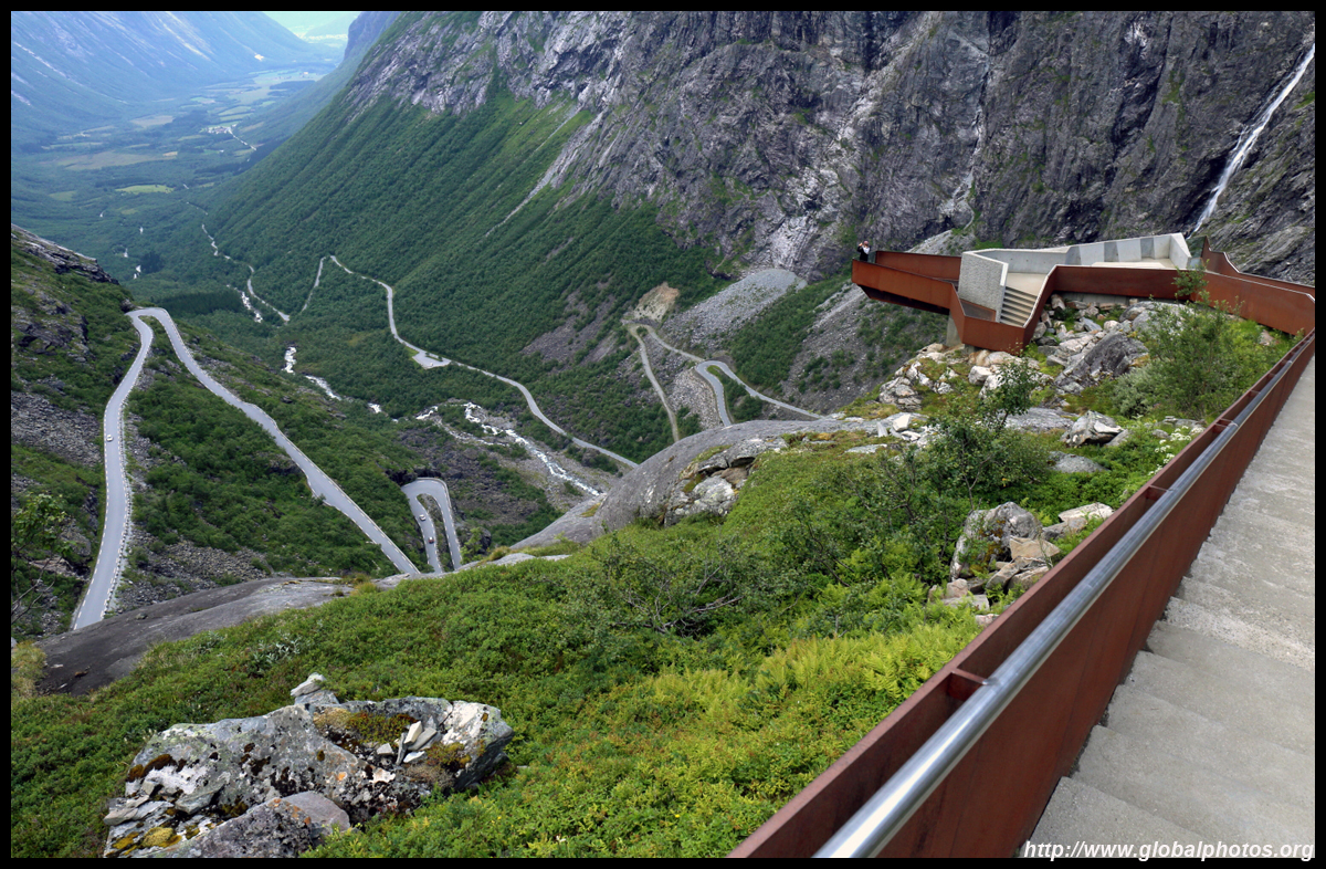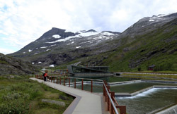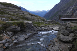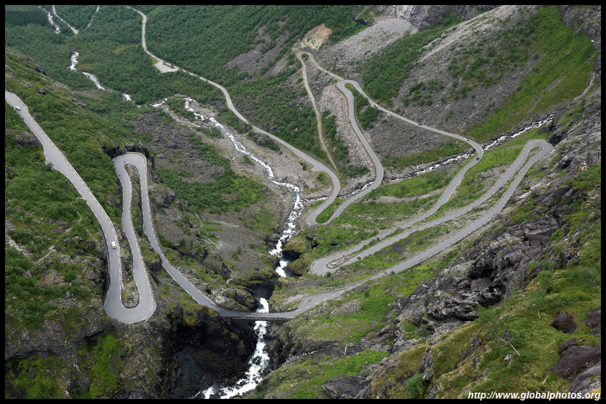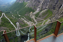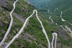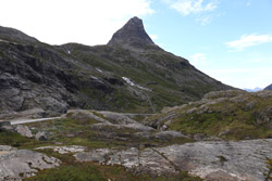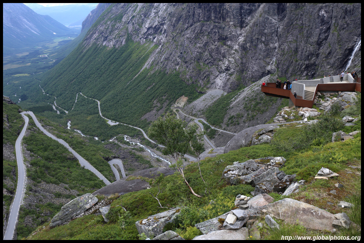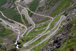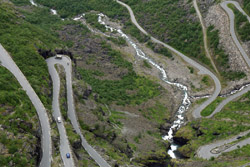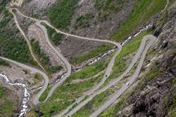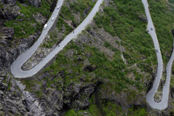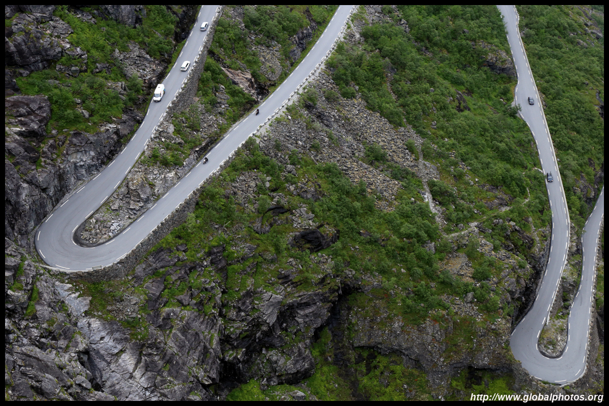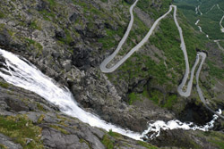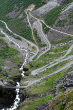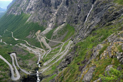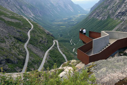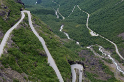 Setting off from Stryn, it is already a long day sightseeing at the Geirangerfjord. However, with the summer midnight sun, you likely can continue past Geiranger to 1 more major attraction in the area, Trollstigen. After the Eagle Road, continue north along the 63, which will dip into the sea at Eidsdal for a short ferry crossing. The 63 resumes on the other side of the coast towards the viewpoint.