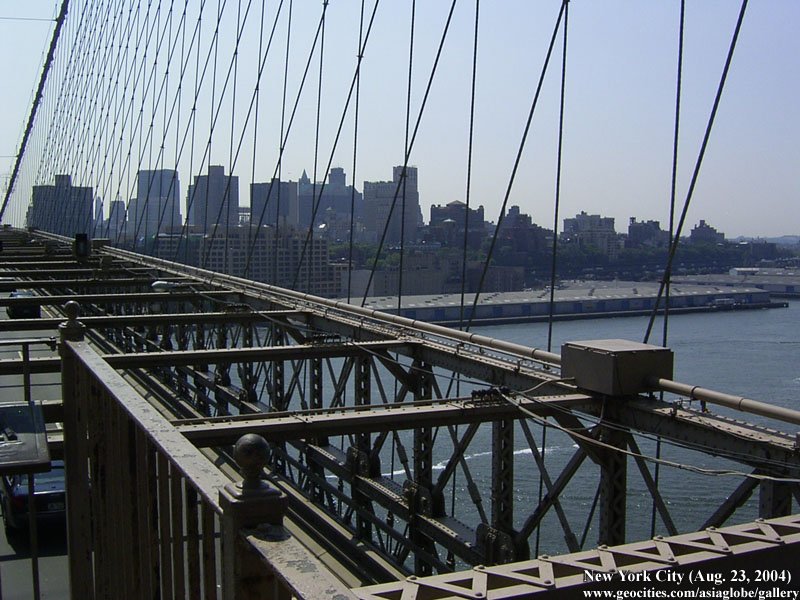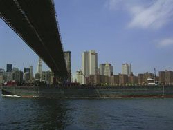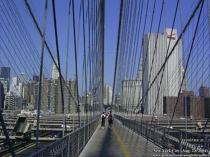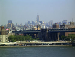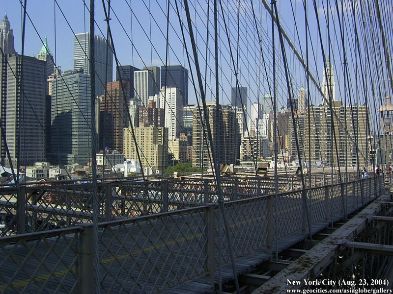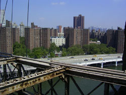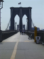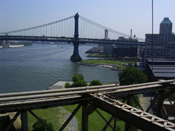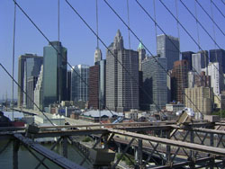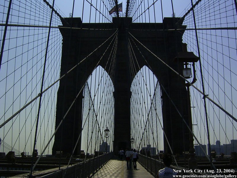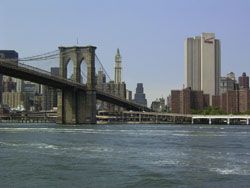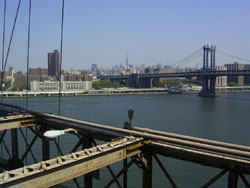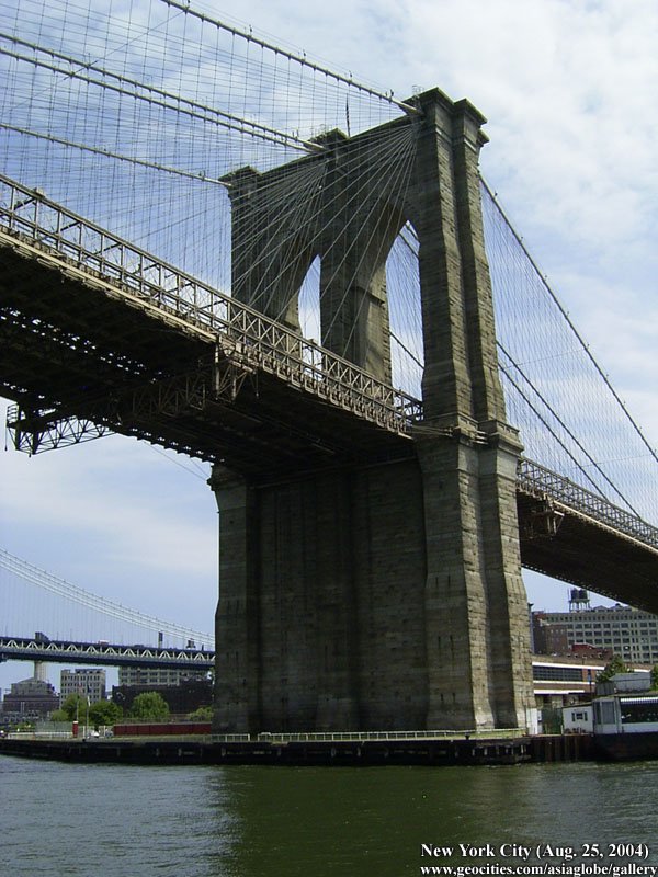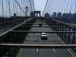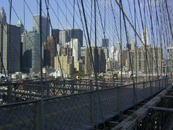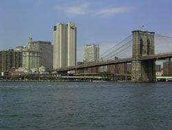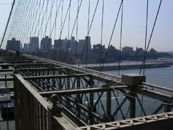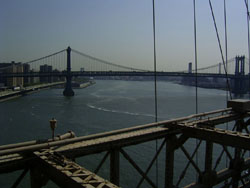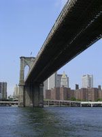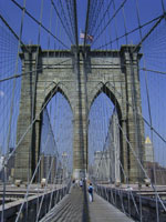 Designed by the brilliant engineer John Augustus Roebling (1806-1869) and completed by his equally ingenious son Washington Roebling (1837-1926), this elegant structure was, at the time of its completion in 1883, the longest suspension bridge in the world. Anchored across the lower East River by two neoGothic towers and a delicate lacework of steel-wire cables, the soaring lines of the Brooklyn Bridge have inspired countless architects, engineers, painters and poets to pursue their own expressions of creative excellence, among them Frank Lloyd Wright, Hart Crane, Walt Whitman, Georgia O'Keefe, Joseph Stella, John Marin and Lewis Mumford.