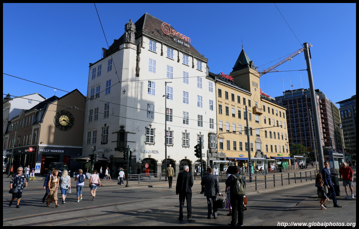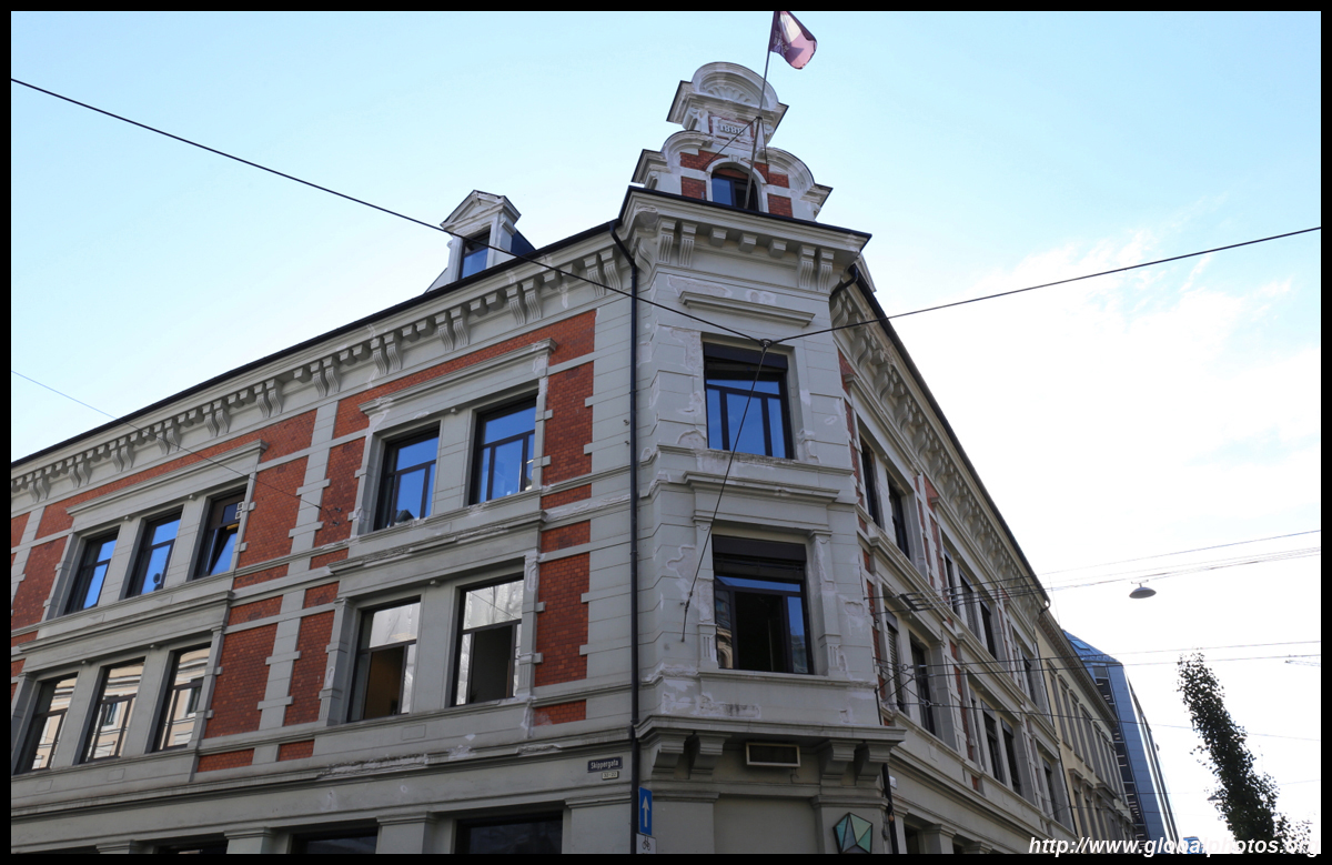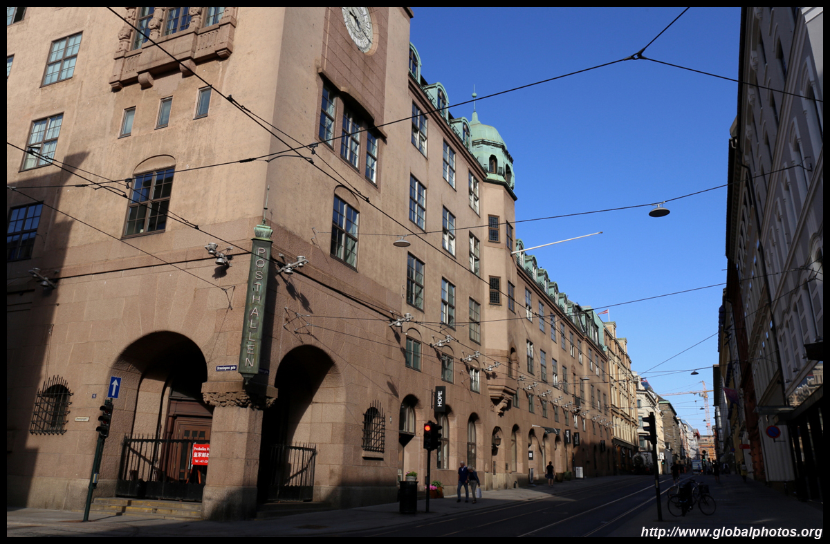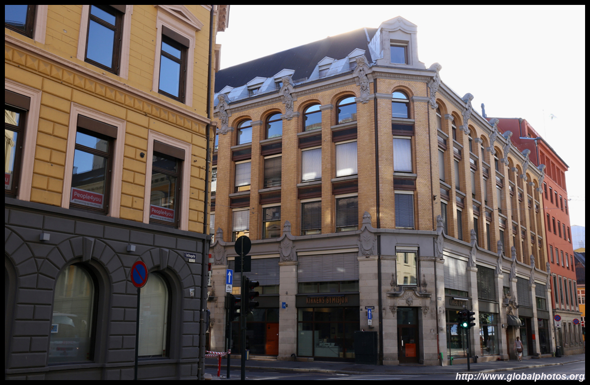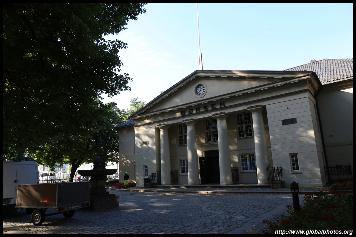 Oslo Bors, the stock exchange, occupies a historic building near the harbour. The surrounding streets are lined with similar-height buildings. They are not particularly grand, but are clearly part of an organized city plan.