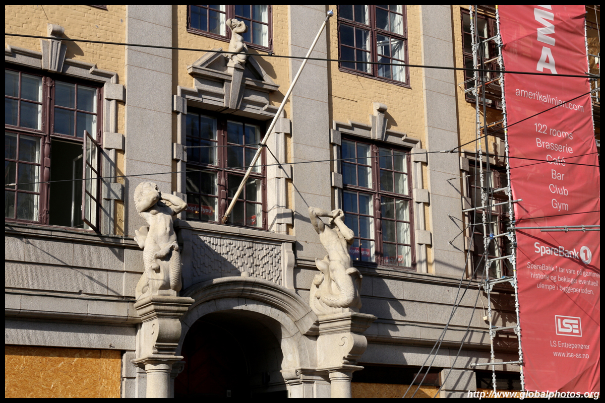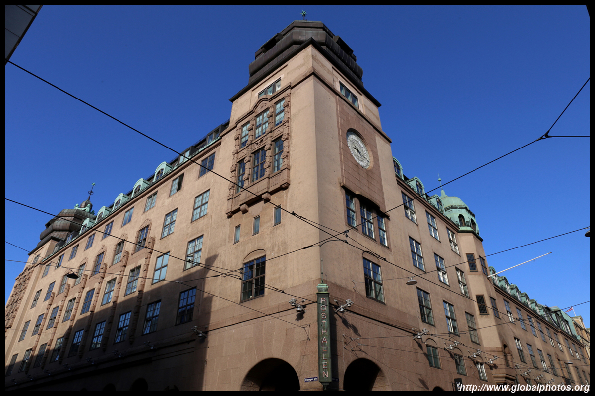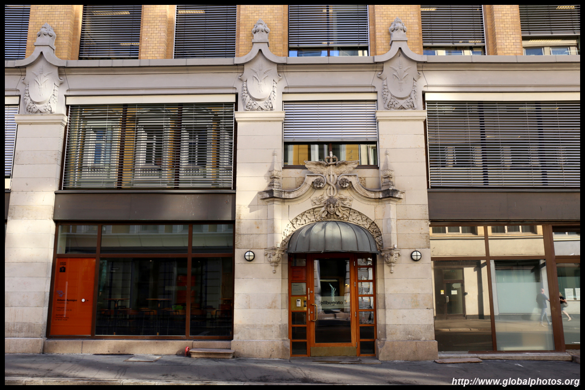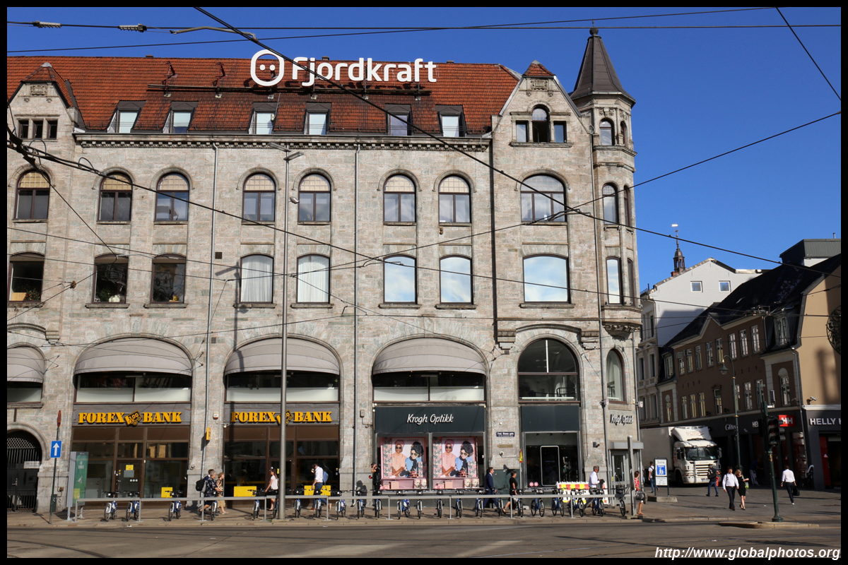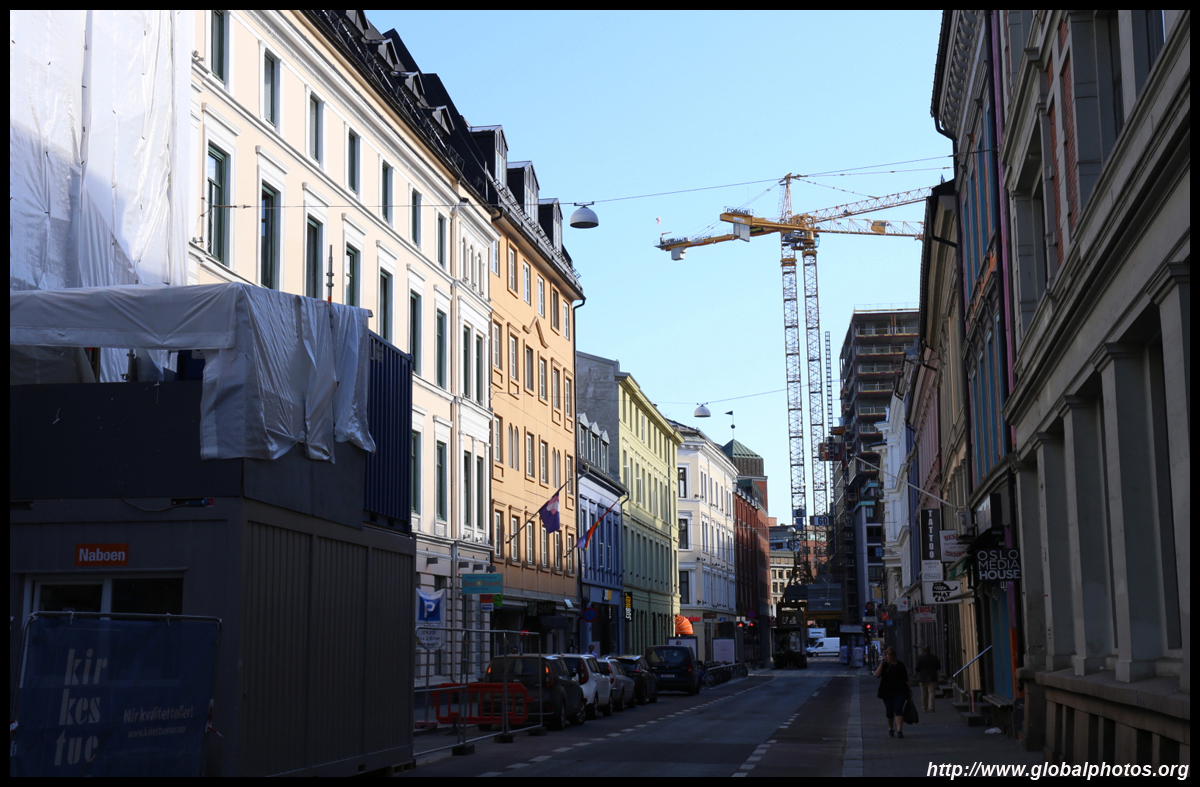 Oslo Bors, the stock exchange, occupies a historic building near the harbour. The surrounding streets are lined with similar-height buildings. They are not particularly grand, but are clearly part of an organized city plan.