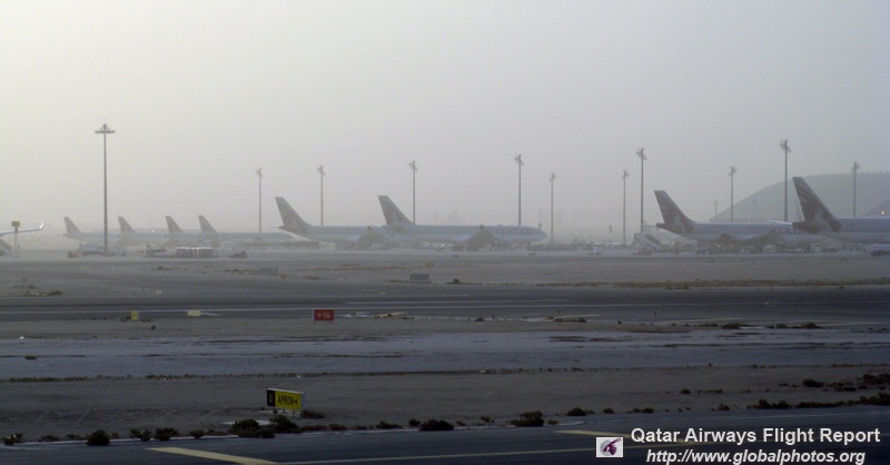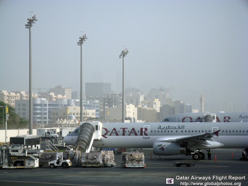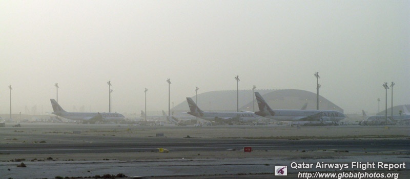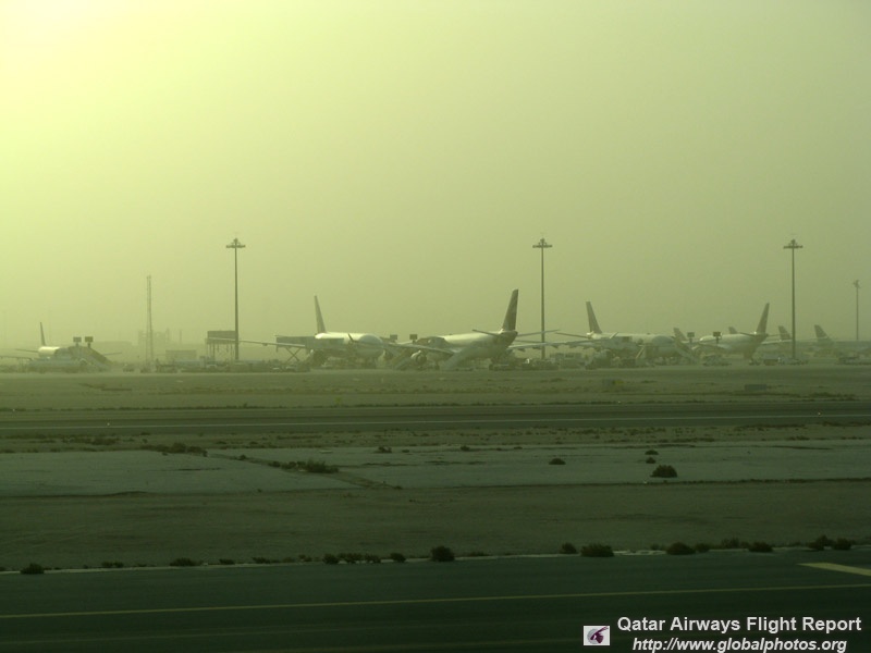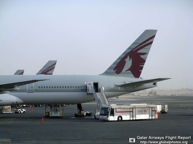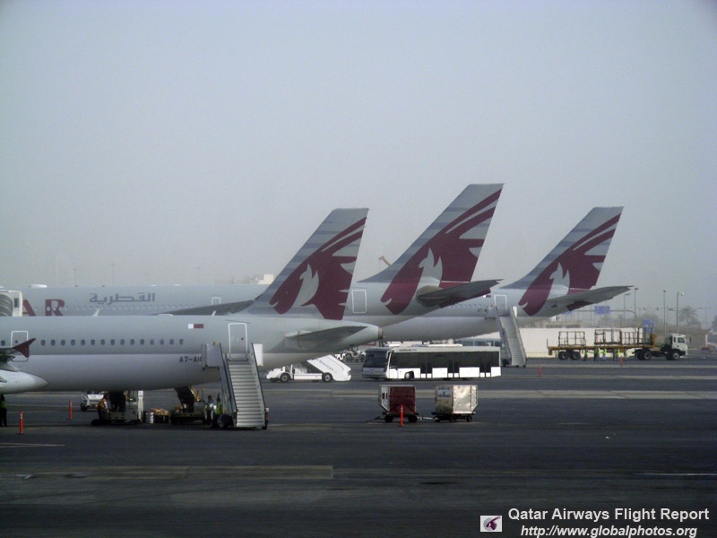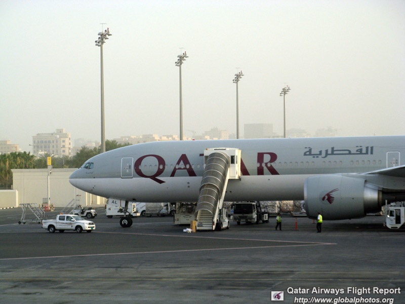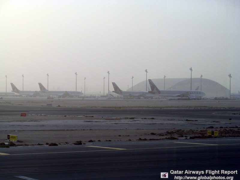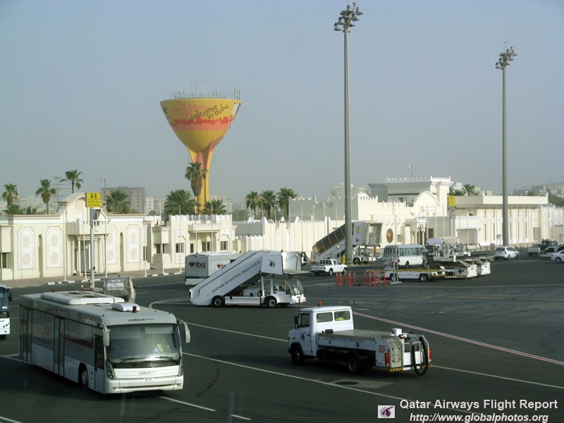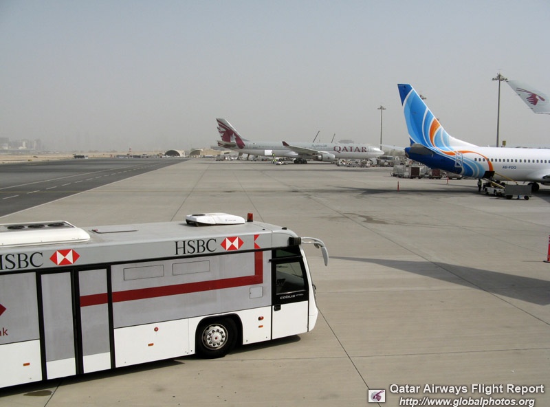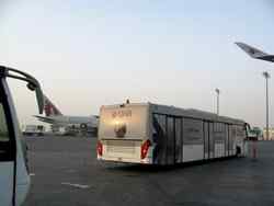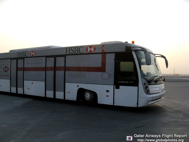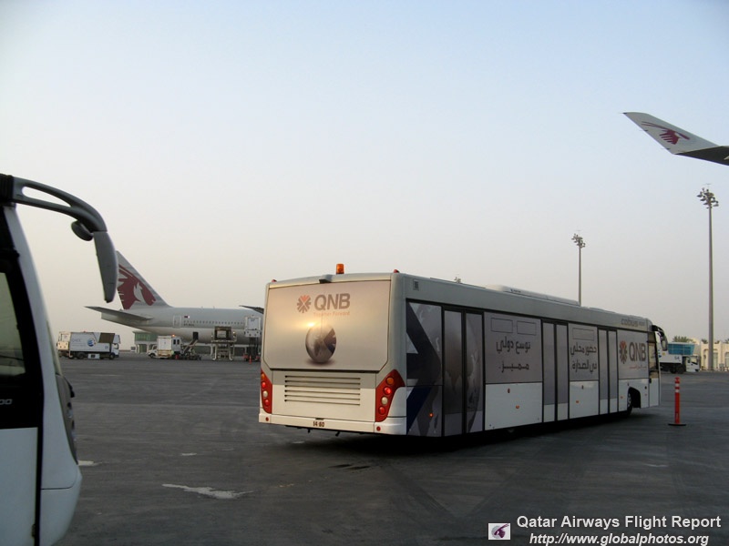 The red-eye flight was full with many seats taken by packaged tours. Upon arrival in Doha in the early morning, passengers had to take to the stairs to board buses for the terminal.