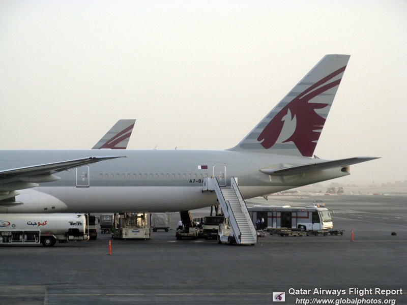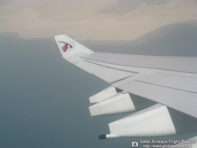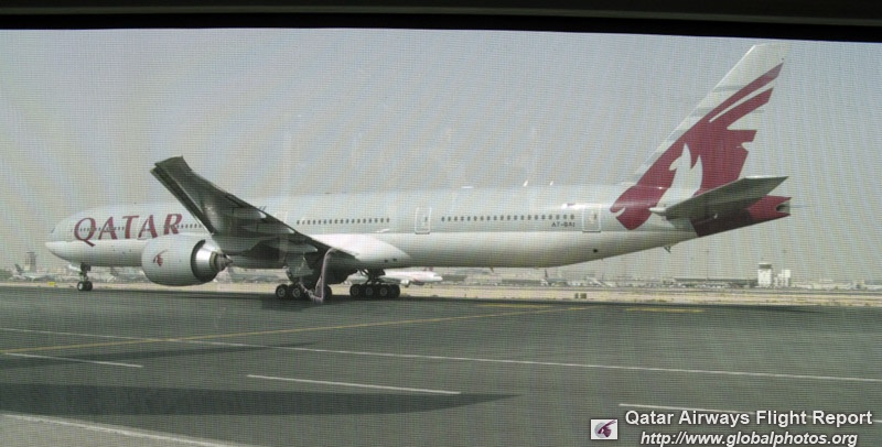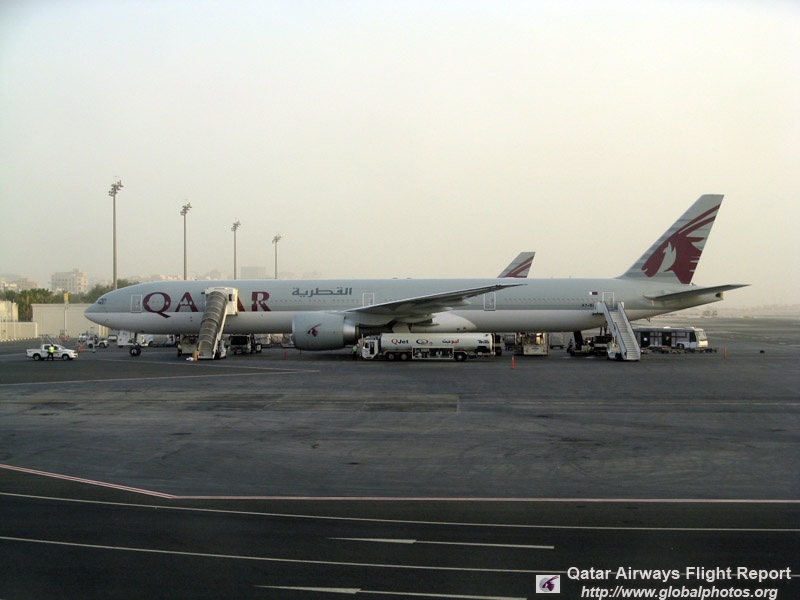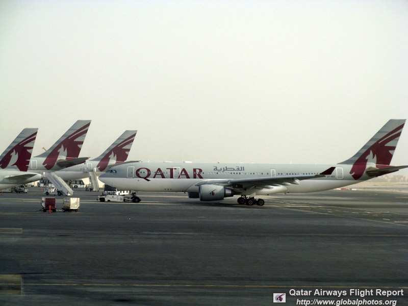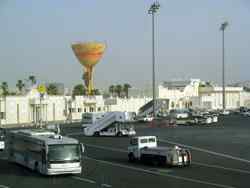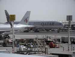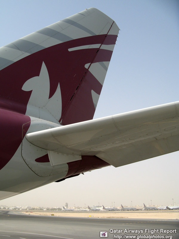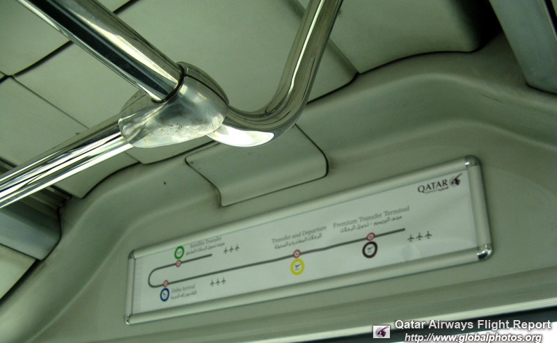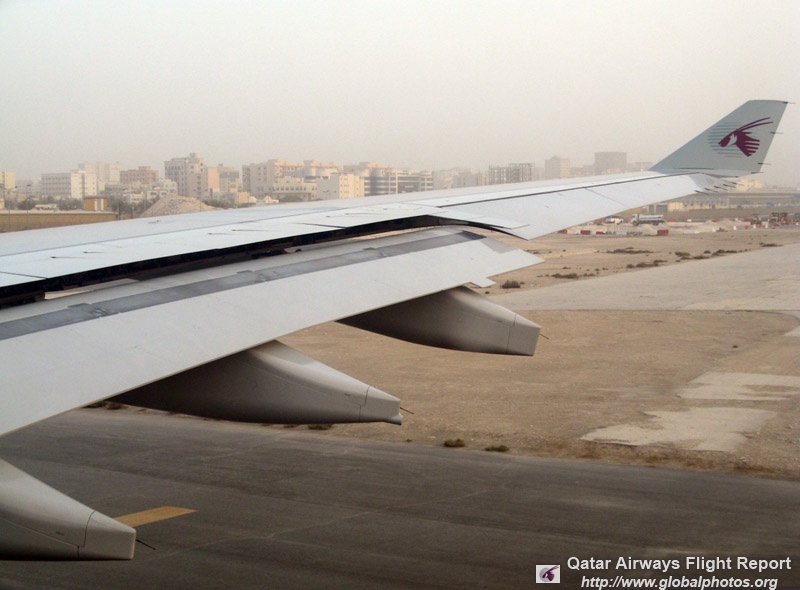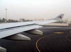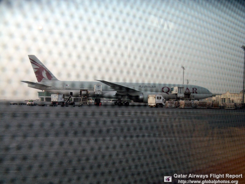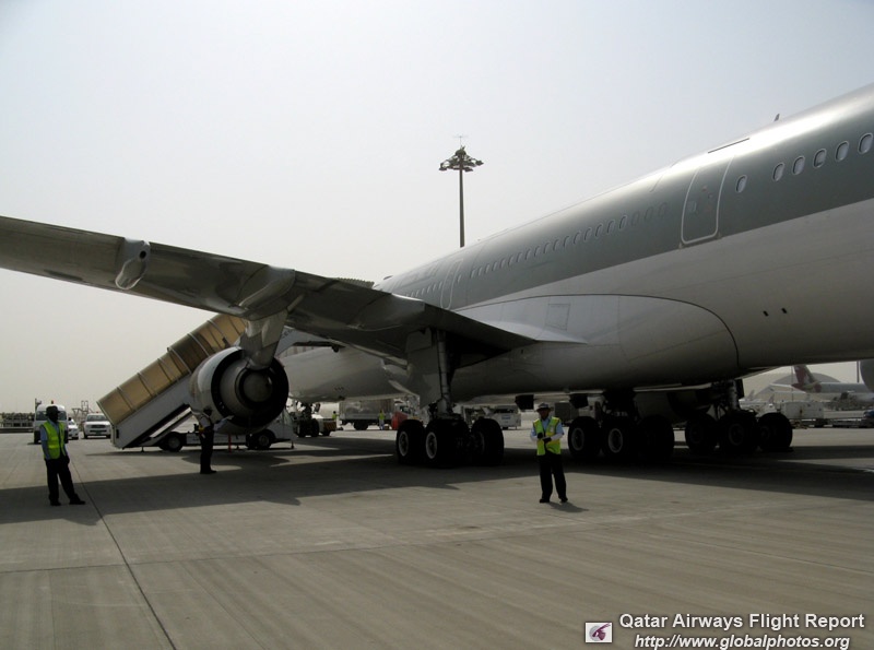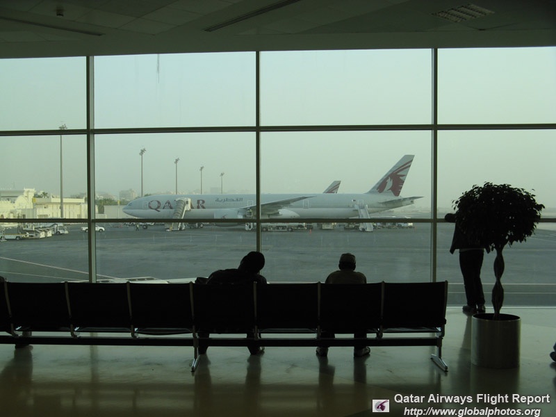 The red-eye flight was full with many seats taken by packaged tours. Upon arrival in Doha in the early morning, passengers had to take to the stairs to board buses for the terminal.