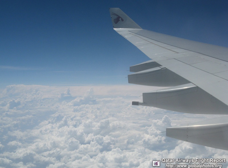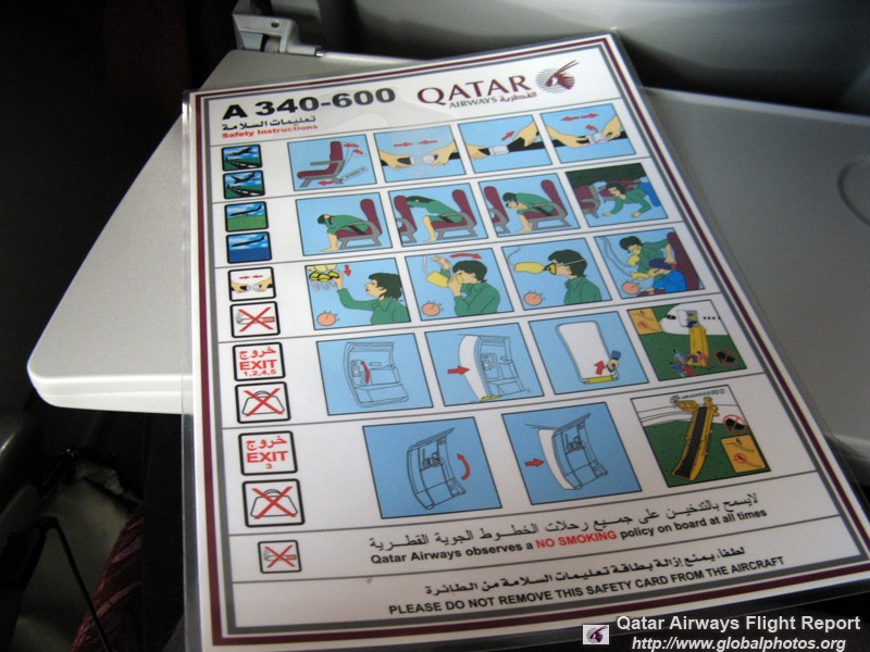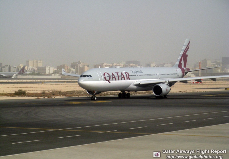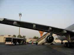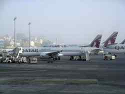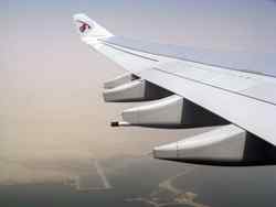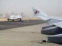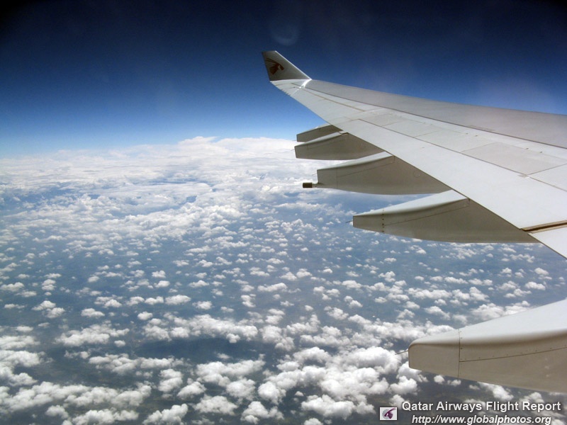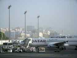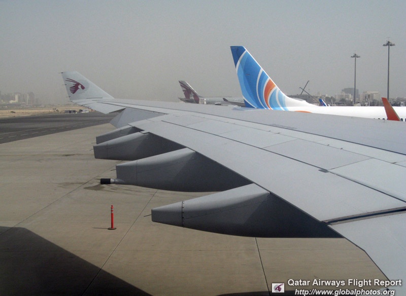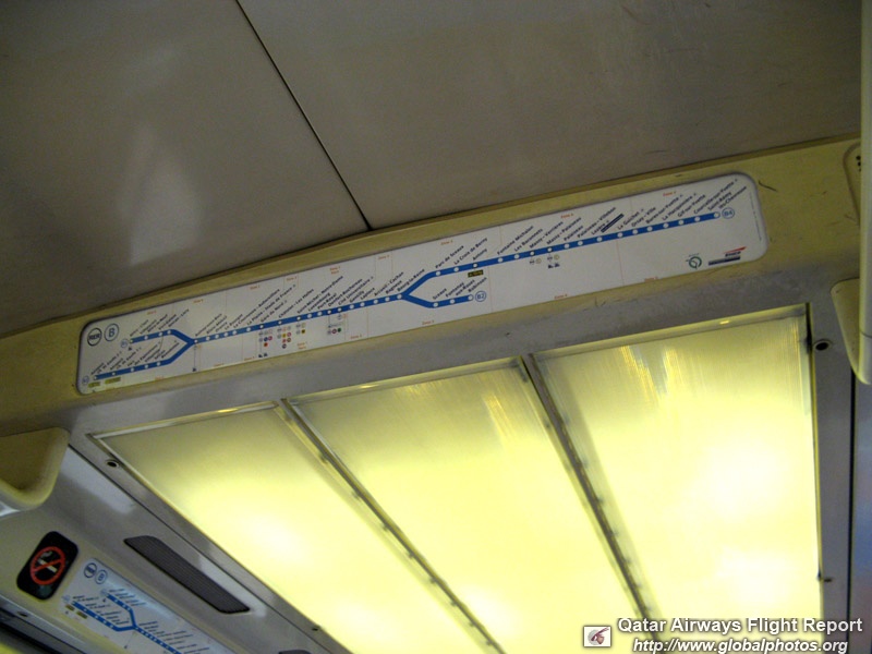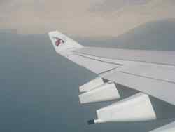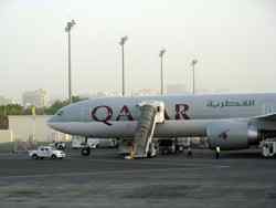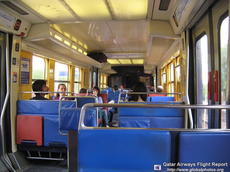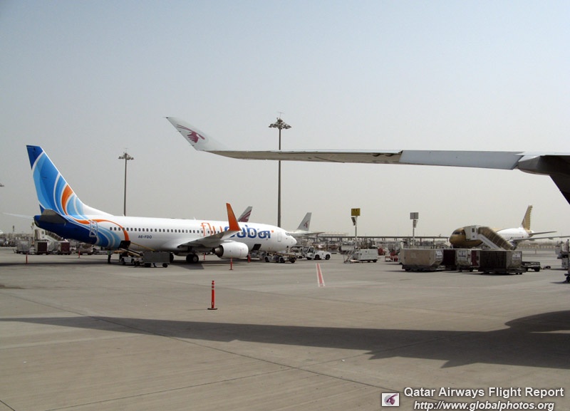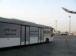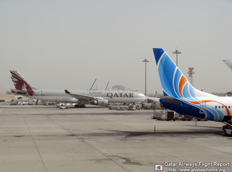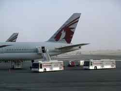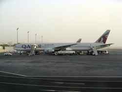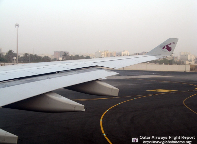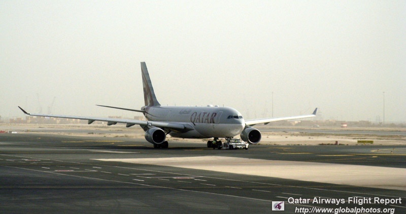 The red-eye flight was full with many seats taken by packaged tours. Upon arrival in Doha in the early morning, passengers had to take to the stairs to board buses for the terminal.