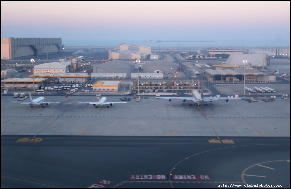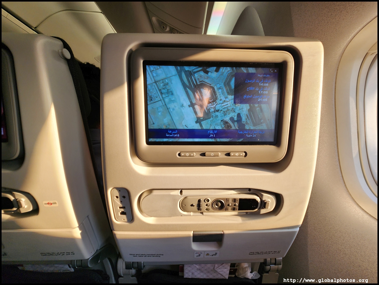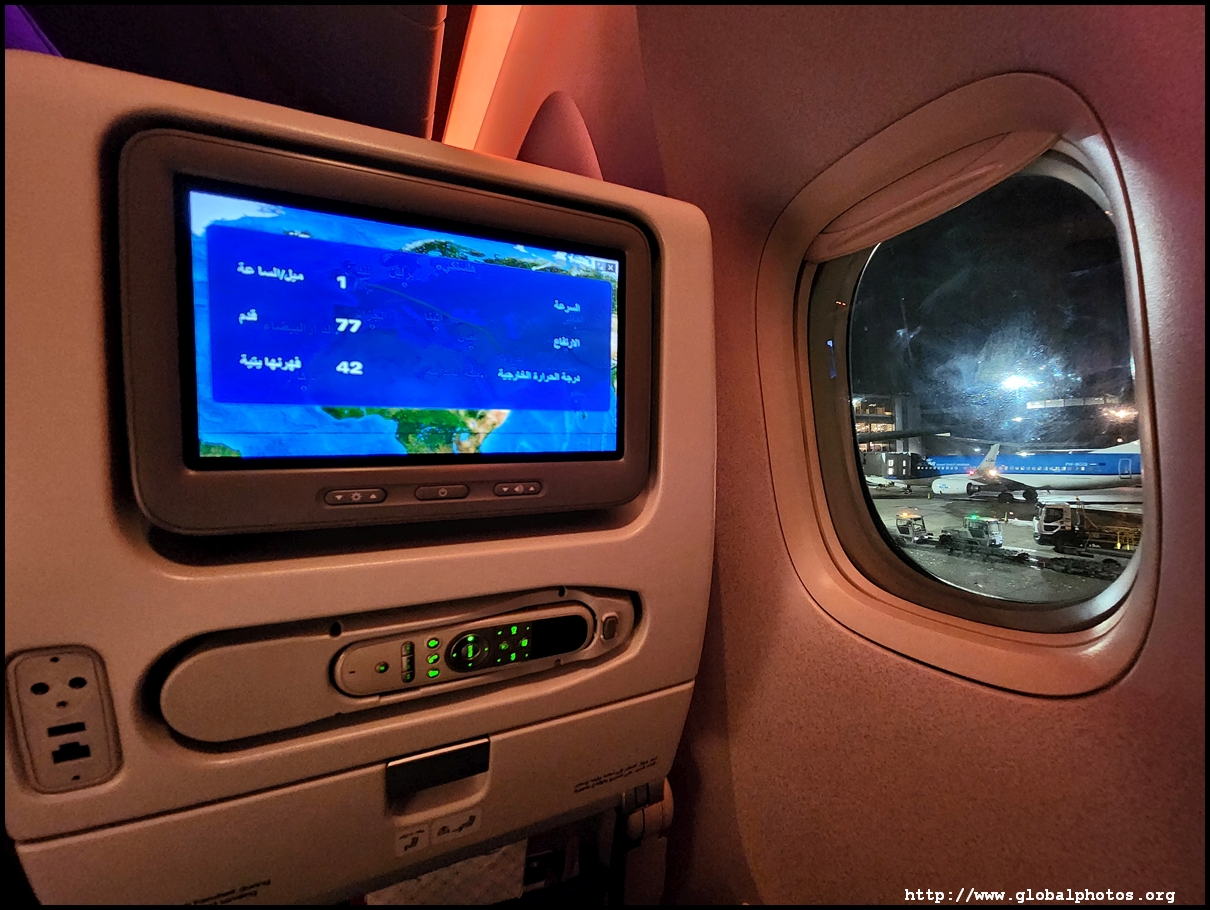 This airport is quite big with many piers. I was looking for the Singapore Jewel-looking section, but didn't have enough time in the end to venture so far. Instead, I hovered around the shops near my gate to see what local specialties they've got. There were plenty of dates on offer, a customary welcome treat across this part of the world. Meanwhile, plane spotting was so-so as this is really a Qatar Airways hub. There was a huge crowd around my A-gate already and they were starting to board zone 1 - the back of the plane. Today's 777 has a huge Economy cabin with almost 400 seats in a high-density configuration. There are 3 big sections and I was right at the back. It was a busy flight but not totally full and I managed to have an empty middle seat, which the aisle passenger quickly and greedily splashed his stuff over thinking he owns the plane. I quickly browsed the IFE system, which is quite a lot better than BA's offering with a decent amount of international content, including a Hong Kong show. The headphones are a little better than BA's disposable ones from the discount store. We managed to push back a few minutes early at 5:20pm and quickly taxied into position for take-off 15 minutes later. Unfortunately, I could only get a right window seat, which was pretty much sea-view into the sunset as the city was off to the left although there were some quick views of the skyline as we left the gate.