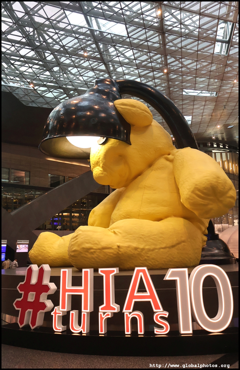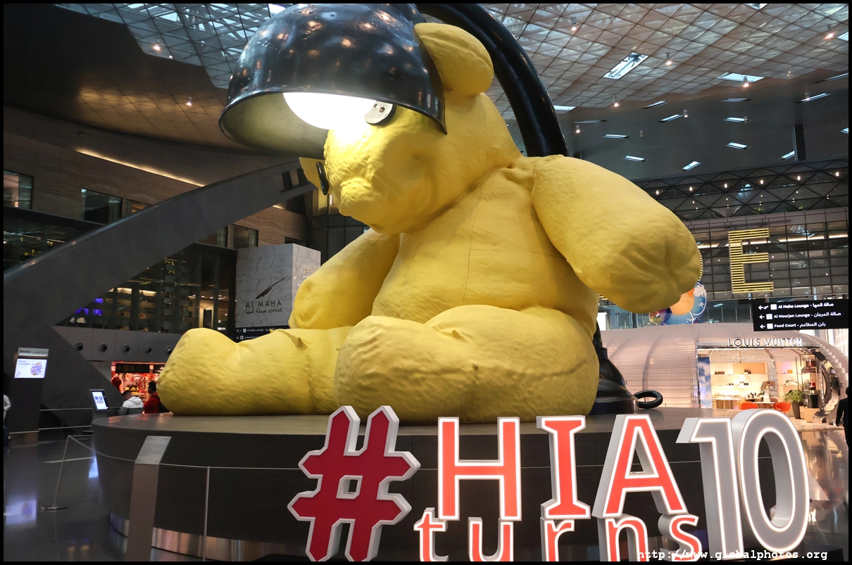 This airport's architecture is quite sleek and doesn't feel crowded as most people are transiting and never make it outside the restricted area. The departures area is roomy and beautiful. Luckily, I was flying with a light hand-carry only today and there was barely a line to check in. 90 minutes before departure, I was all set to head to London, although I noticed on the boarding pass that boarding begins an hour before departure, so I didn't have much time to explore. Security and immigration went smoothly. I exited the formalities into a shopping mall with the famous bear, now with an additional tag to celebrate the aiirport's 10th birthday. There are so many shops and restaurants here to keep a long transit enjoyable. I've seen some of these in London such as Yo Sushi and Comptoir Libanais. While most shops and restaurants in Doha were shut during Ramadan until sunset, it was business as usual air-side. I initially had quite a lot of difficulty finding food during the day in the city as even convenience stores at metro stations were shut and only saw a very scarce few restaurants kept open for take-out only in West Bay.