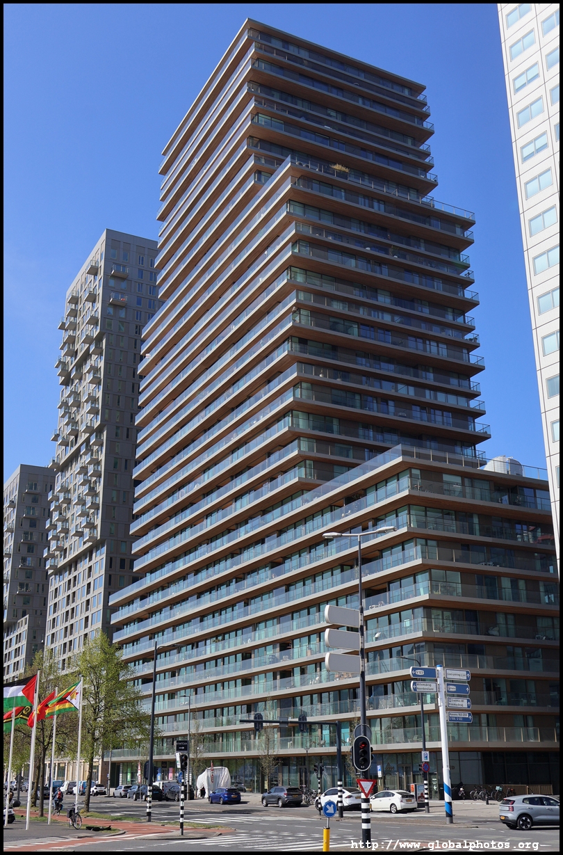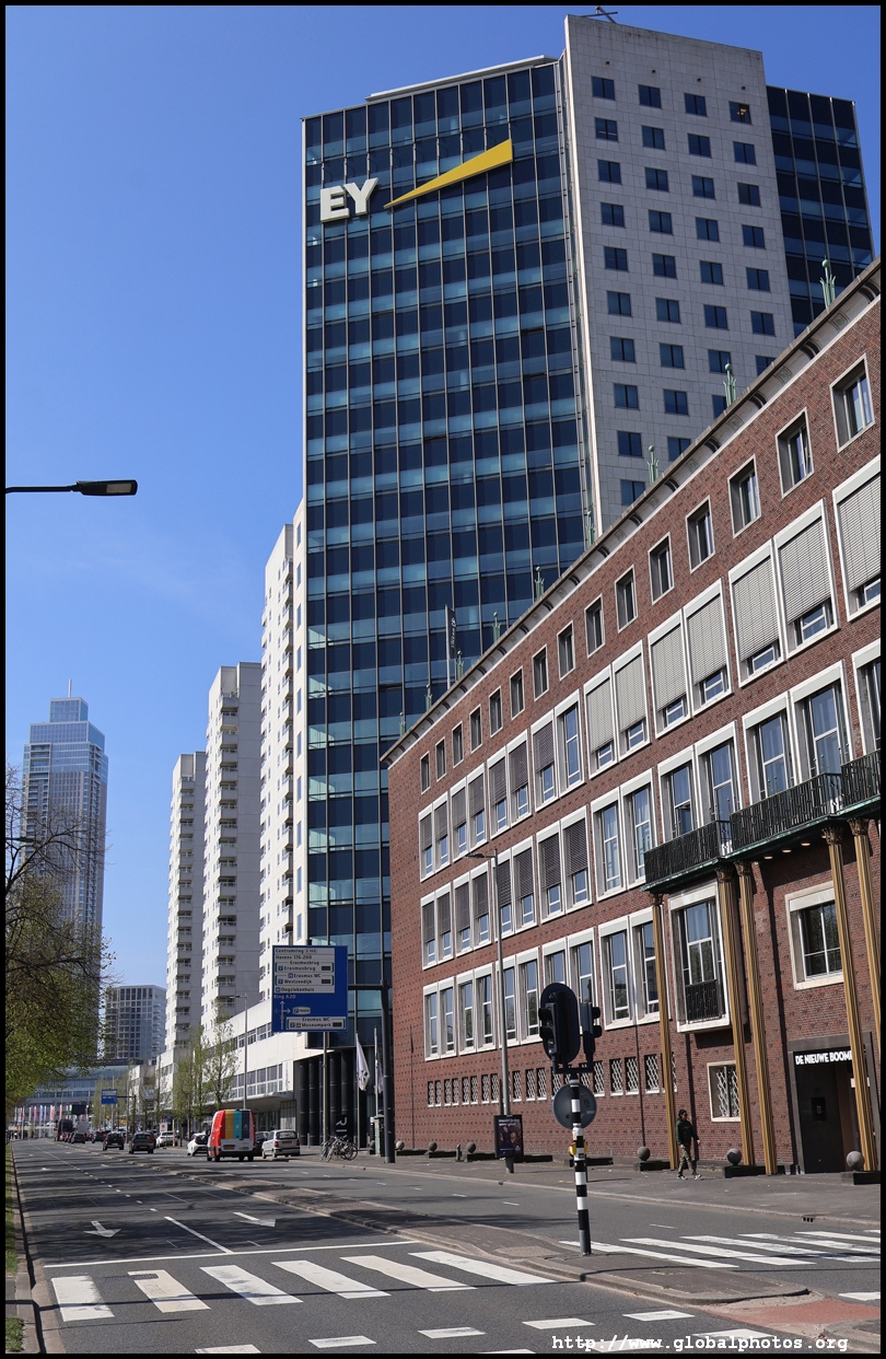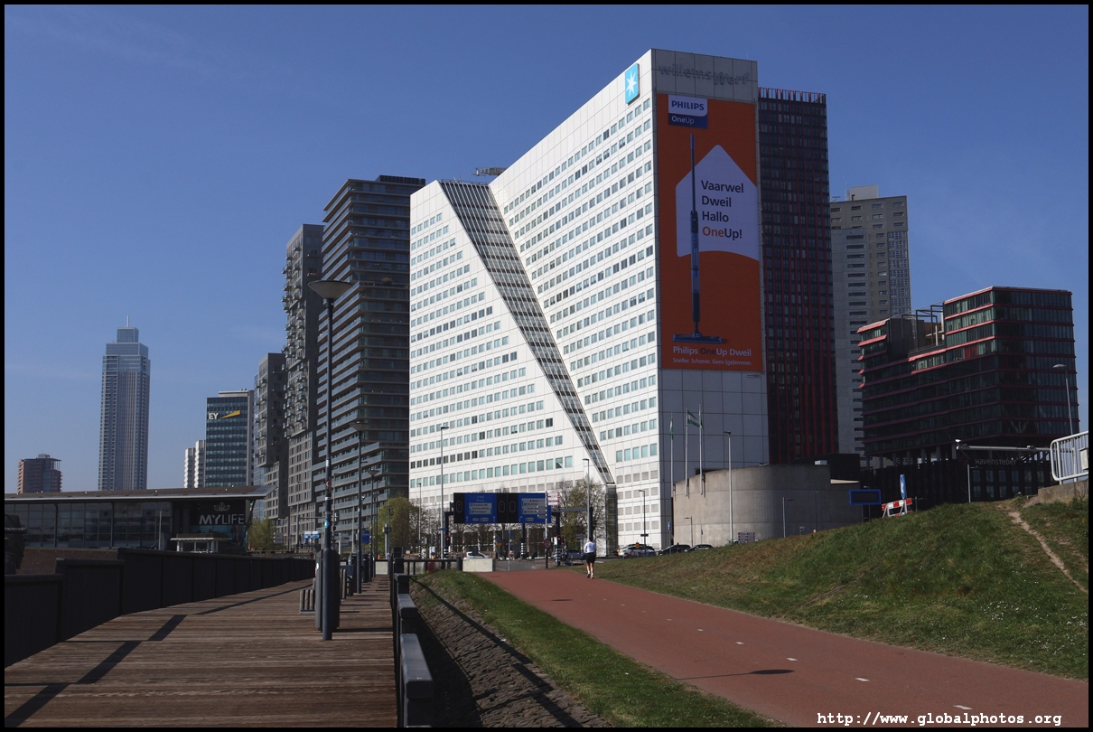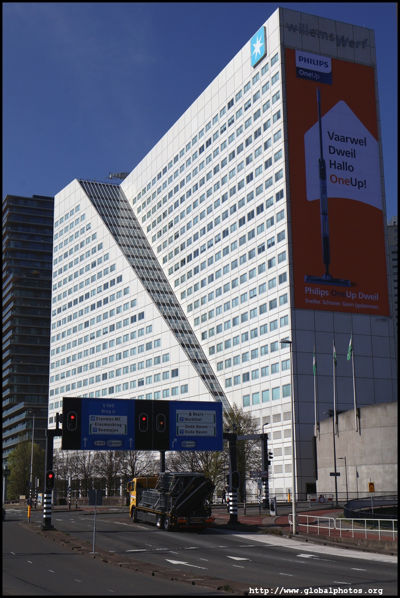 Rotterdam's city centre was almost entirely destroyed during bombings in 1940. As part of redevelopment efforts, new skyscrapers rose along the Boompjes boulevard waterfront.Starting from the Witte Huis, one of few survivors from the bombing, I headed west along the waterfront promenade. The first major building is the Willemswerf, an office building completed in 1989.