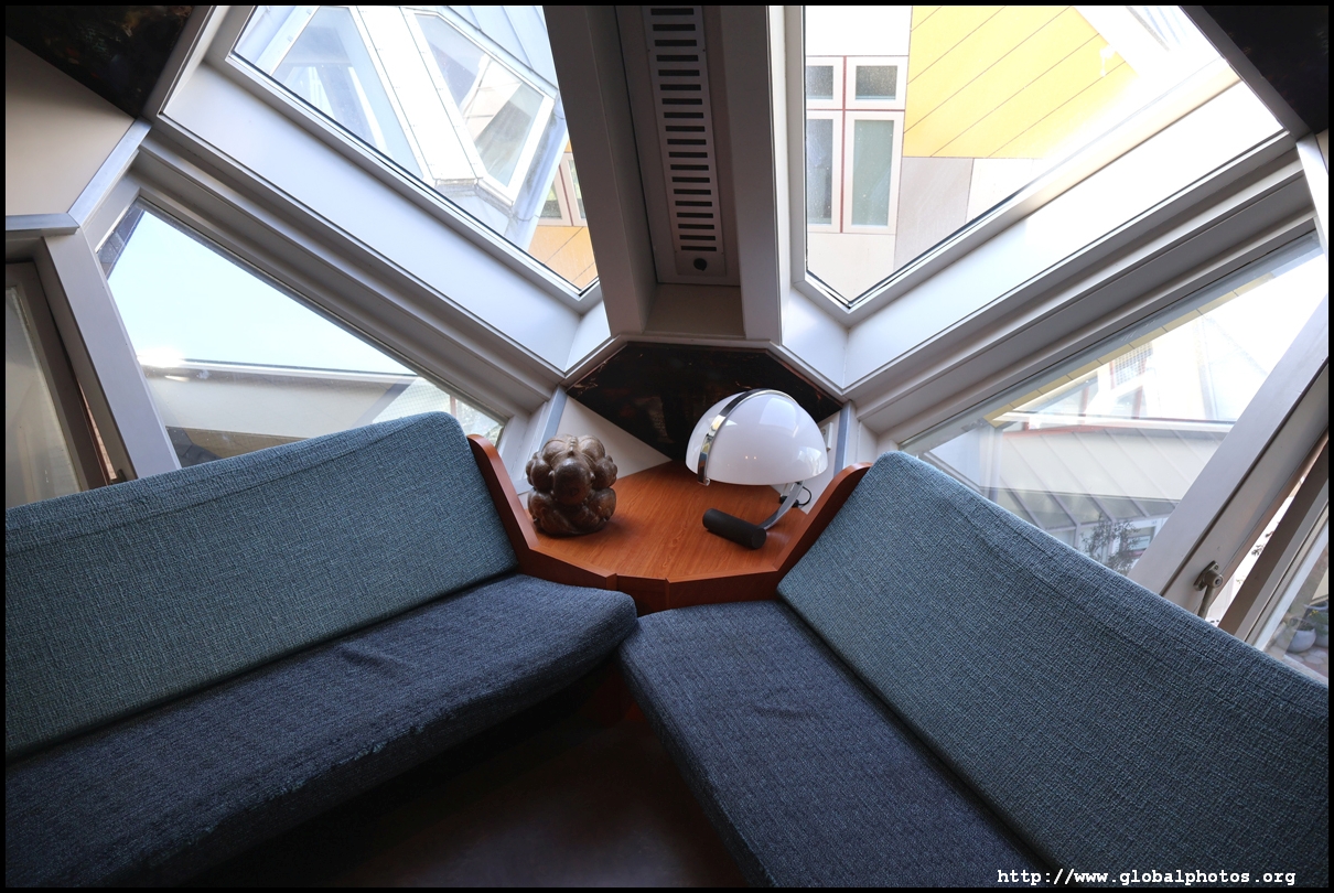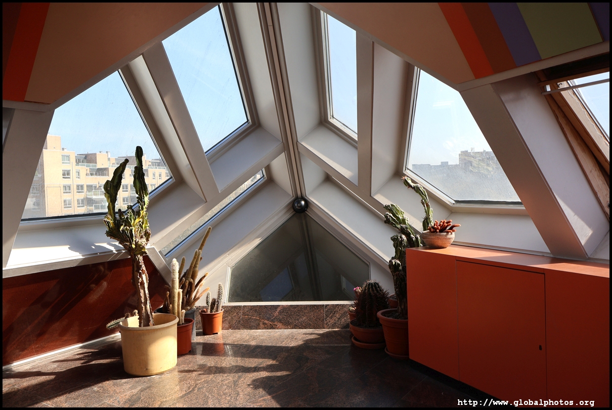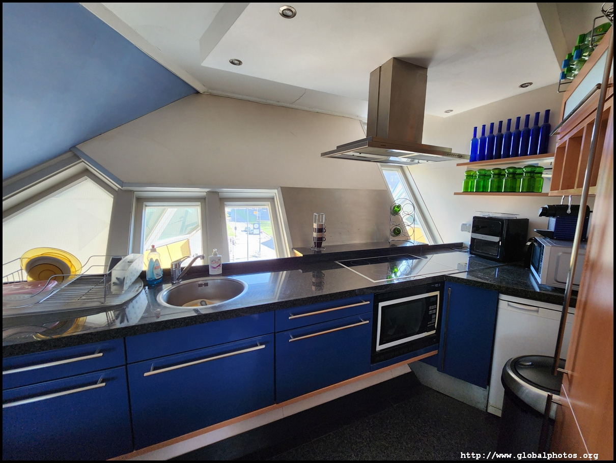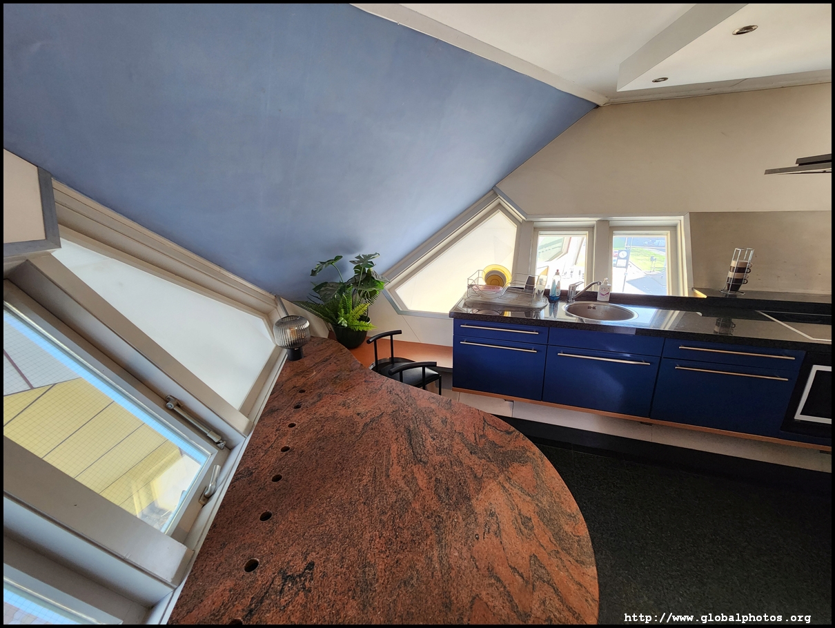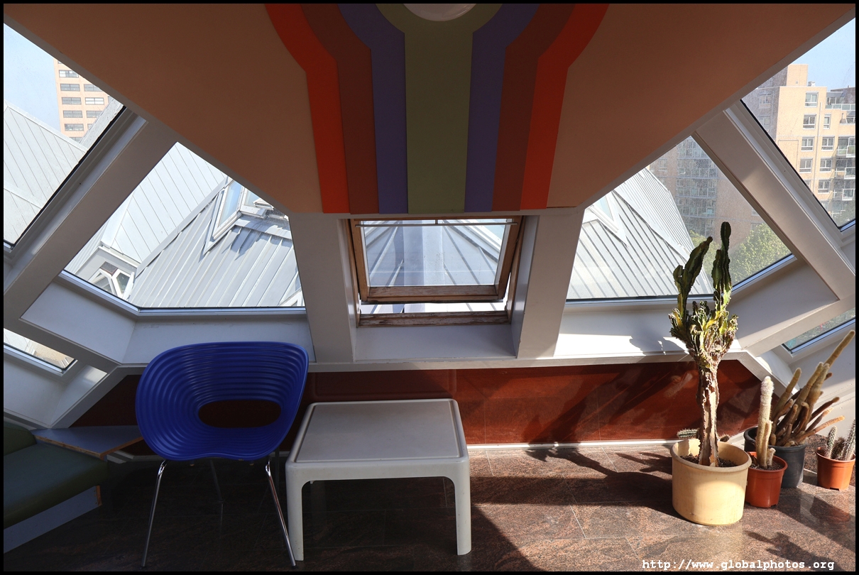 Oddly intriguing from the outside, the Cube House is a set of residential buildings made of cubes angled at 53.5 degrees resting on concrete pillar trunks. Designed by Piet Blom, they first appeared in the mid-1970s near Eindhoven and arrived in Rotterdam in the 1980s. This "forest" of treehouses are placed on top of a busy avenue below, connecting the new housing projects in the Old Harbour with the city.A typical apartment consists of 3 floors. The lower floor consists of the living space with kitchen with downward-facing windows that interact with the street below. Heading up the narrow and steep staircase, you reach the second floor, where there are bedrooms and a toilet. The top floor is a pyramid with plenty of windows that look out onto your neighbours' roofs, and can be flexibly adapted into a lounge or bedroom. It is possible to enter an apartment museum for 3 euros, a price that hasn't changed over the years. First impressions are not good as it feels claustrophobic to climb up the narrow and steep staircase to the lower floor. It also feels very dark due to the windows' angle downwards. Things don't get better upstairs with sharp corners and low ceilings. It's very easy to bump your head due to the irregular layout inside the inverted cube. The final staircase leads to a super hot greenhouse because all the windows face the sun and there are plenty of them. Natural lighting is not an issue here but it is darker than usual on the other 2 floors where you spend most of the time despite it being a sunny day outside.