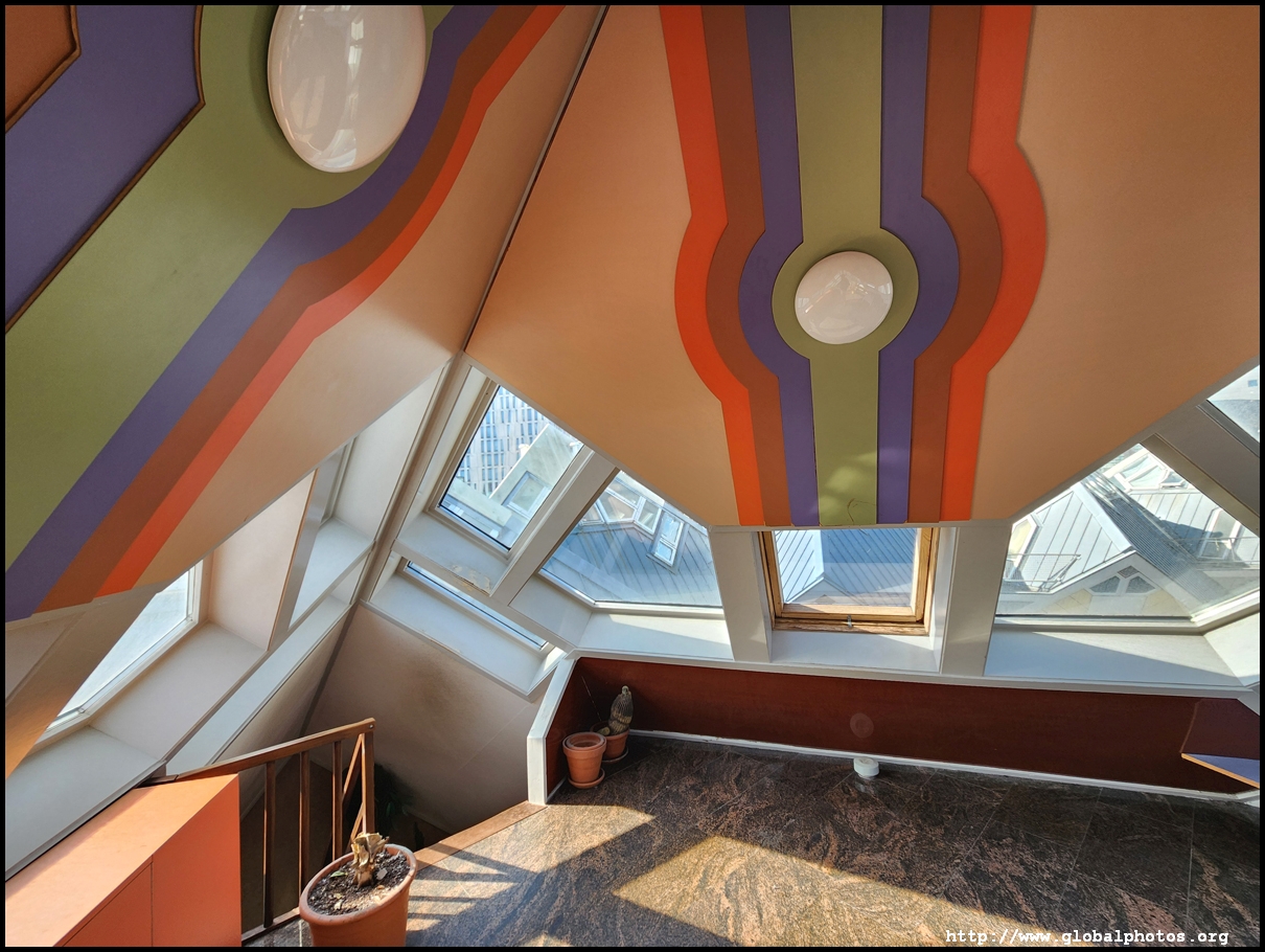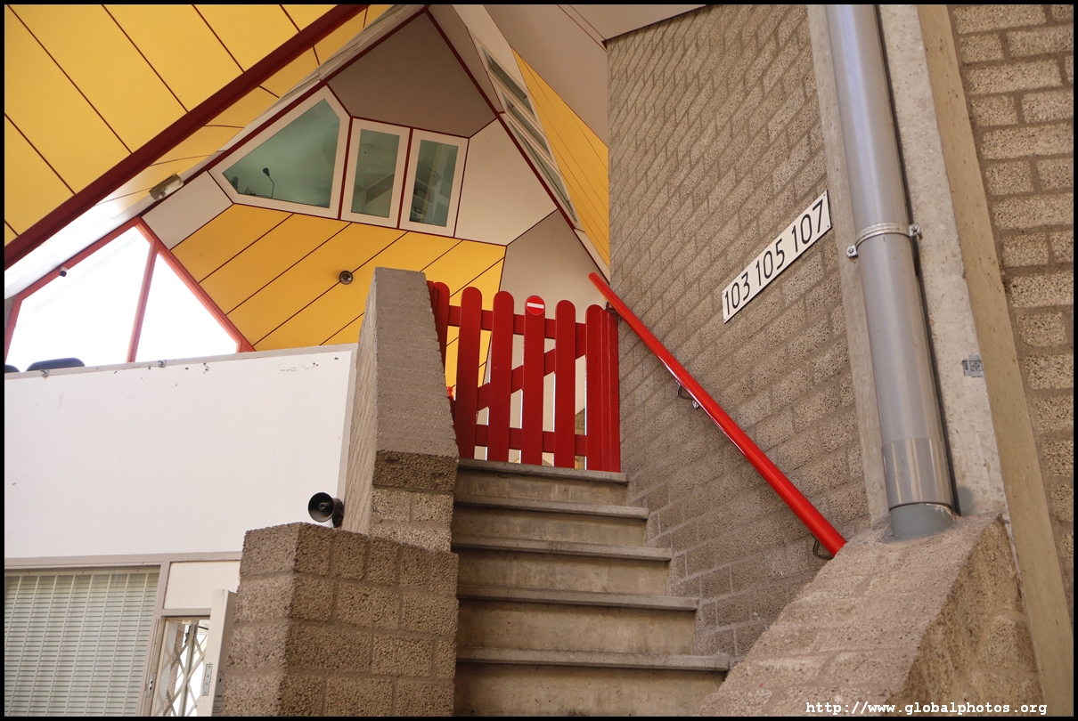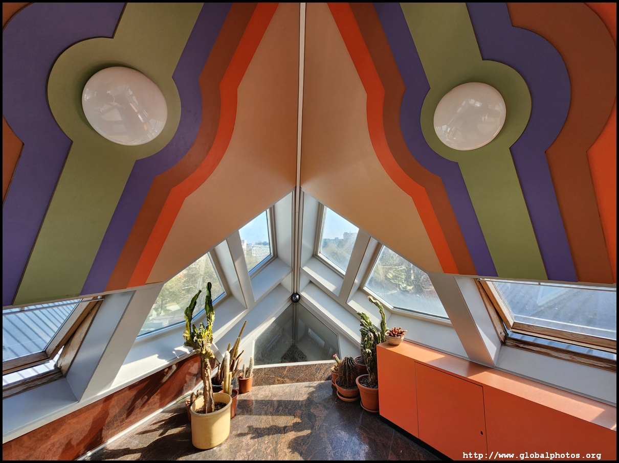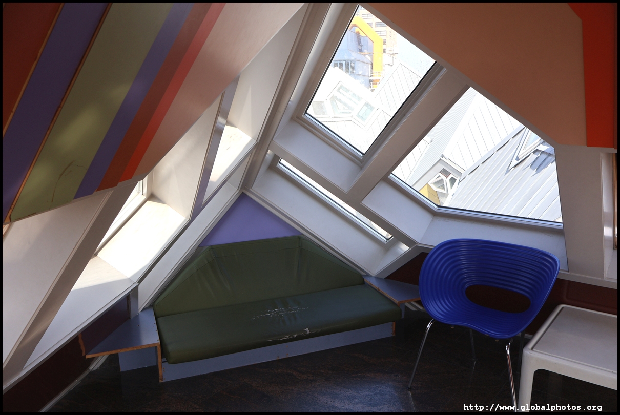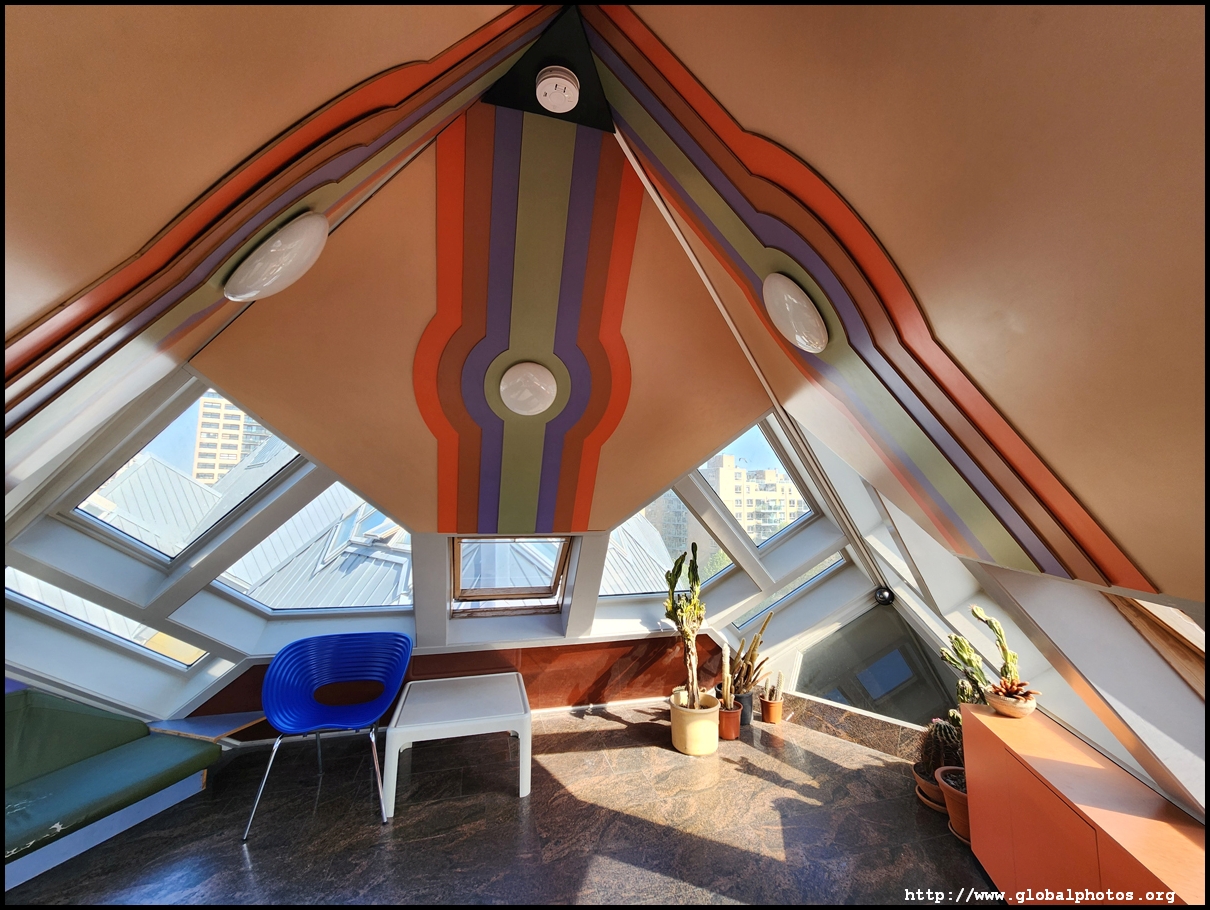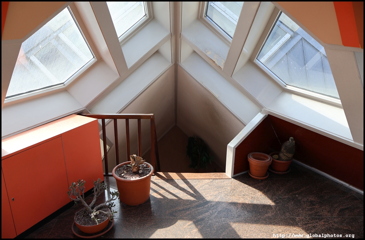 Oddly intriguing from the outside, the Cube House is a set of residential buildings made of cubes angled at 53.5 degrees resting on concrete pillar trunks. Designed by Piet Blom, they first appeared in the mid-1970s near Eindhoven and arrived in Rotterdam in the 1980s. This "forest" of treehouses are placed on top of a busy avenue below, connecting the new housing projects in the Old Harbour with the city.A typical apartment consists of 3 floors. The lower floor consists of the living space with kitchen with downward-facing windows that interact with the street below. Heading up the narrow and steep staircase, you reach the second floor, where there are bedrooms and a toilet. The top floor is a pyramid with plenty of windows that look out onto your neighbours' roofs, and can be flexibly adapted into a lounge or bedroom. It is possible to enter an apartment museum for 3 euros, a price that hasn't changed over the years. First impressions are not good as it feels claustrophobic to climb up the narrow and steep staircase to the lower floor. It also feels very dark due to the windows' angle downwards. Things don't get better upstairs with sharp corners and low ceilings. It's very easy to bump your head due to the irregular layout inside the inverted cube. The final staircase leads to a super hot greenhouse because all the windows face the sun and there are plenty of them. Natural lighting is not an issue here but it is darker than usual on the other 2 floors where you spend most of the time despite it being a sunny day outside.