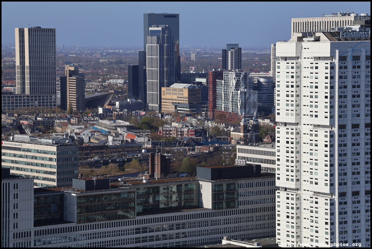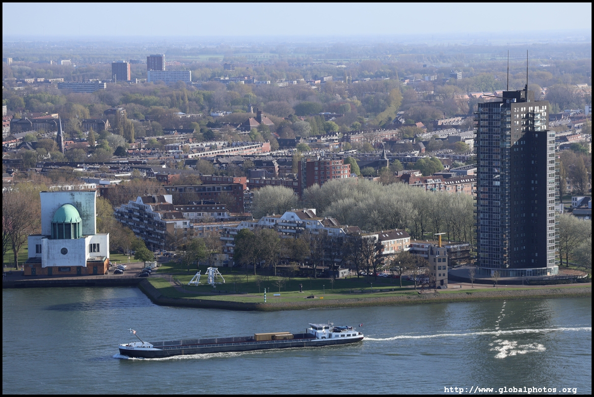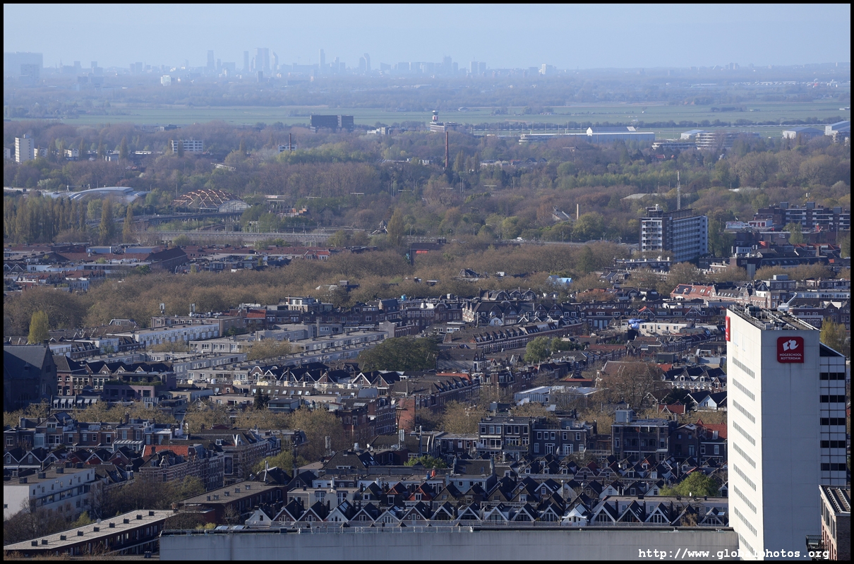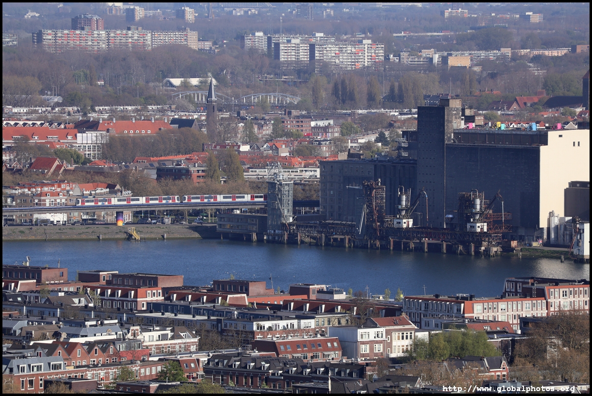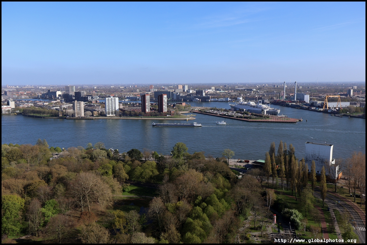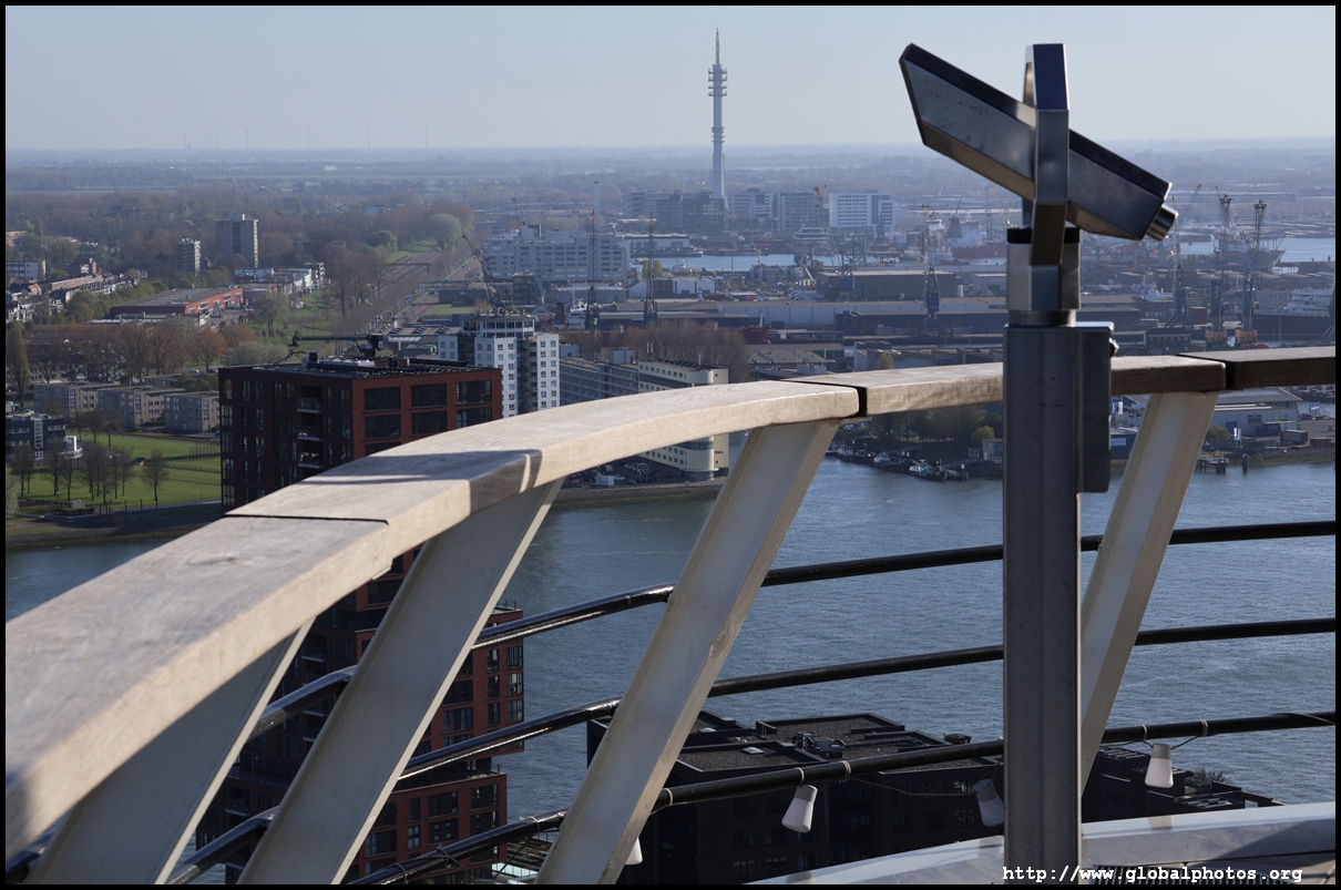 The tower is just across the highway from Het Park, a nice urban oasis along the Nieuwe Maas river. On the other side of the river towards the south are plenty of residential developments around Rijnhaven, Maashaven, and further beyond. To the west, the residential communities slowly fade away and the massive port takes over all the way to the North Sea. In 2024, Rotterdam's port throughput exceeded 435 million tonnes, including 13.8 million container TEU, ranking it the largest in Europe. To the north, I can make out The Hague's skyline in the distance. The metro's line E connects both cities together, with a journey time of about half an hour from Centraal station.