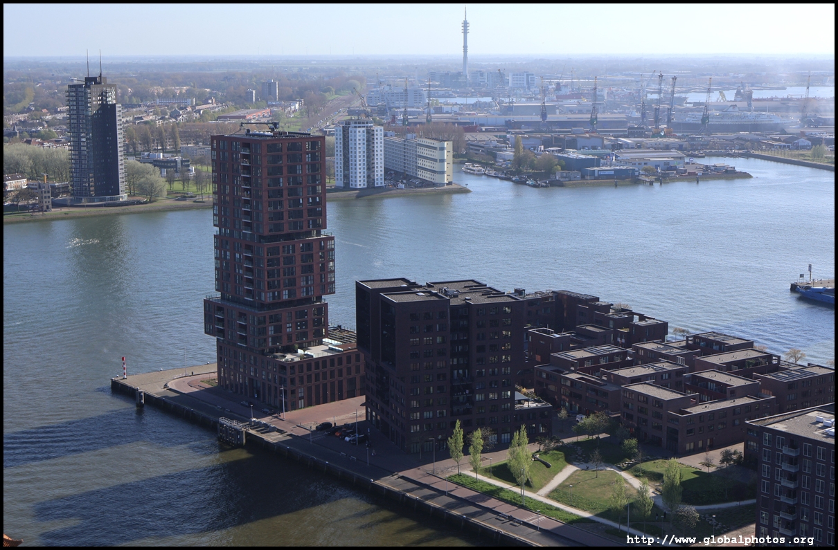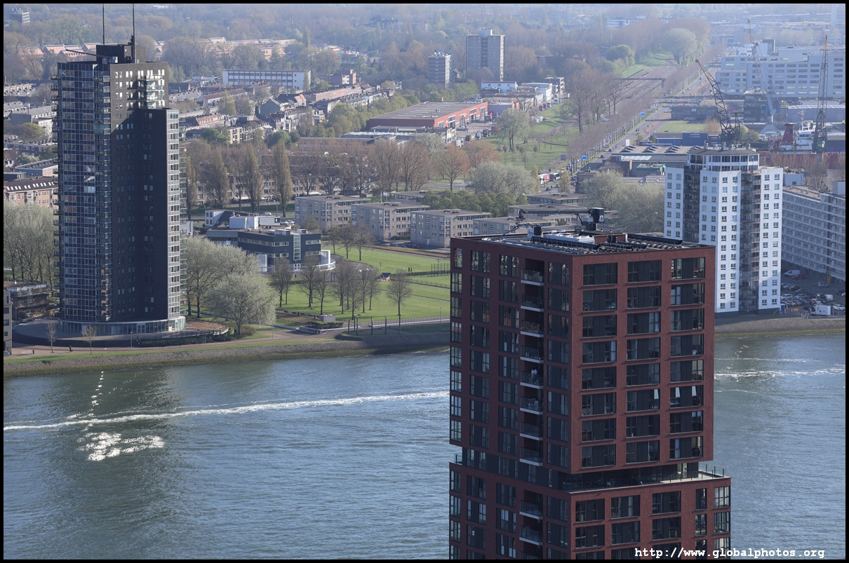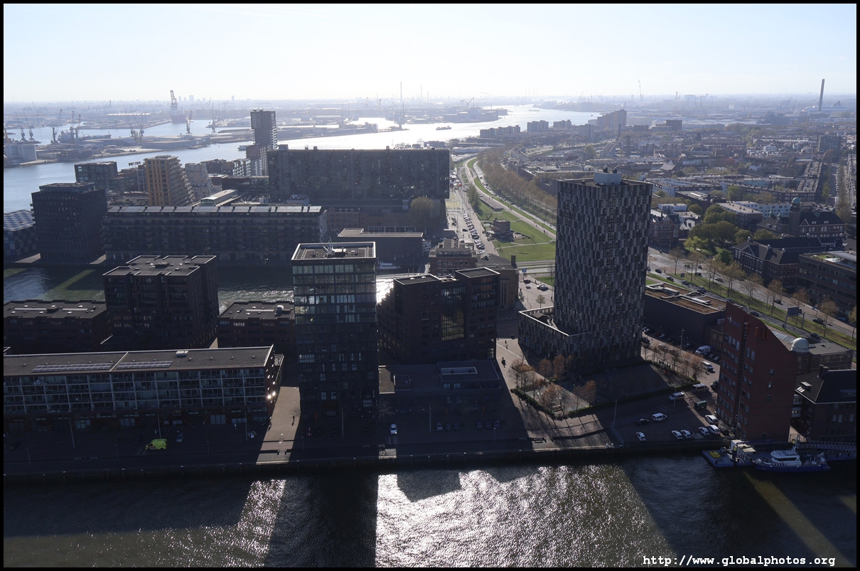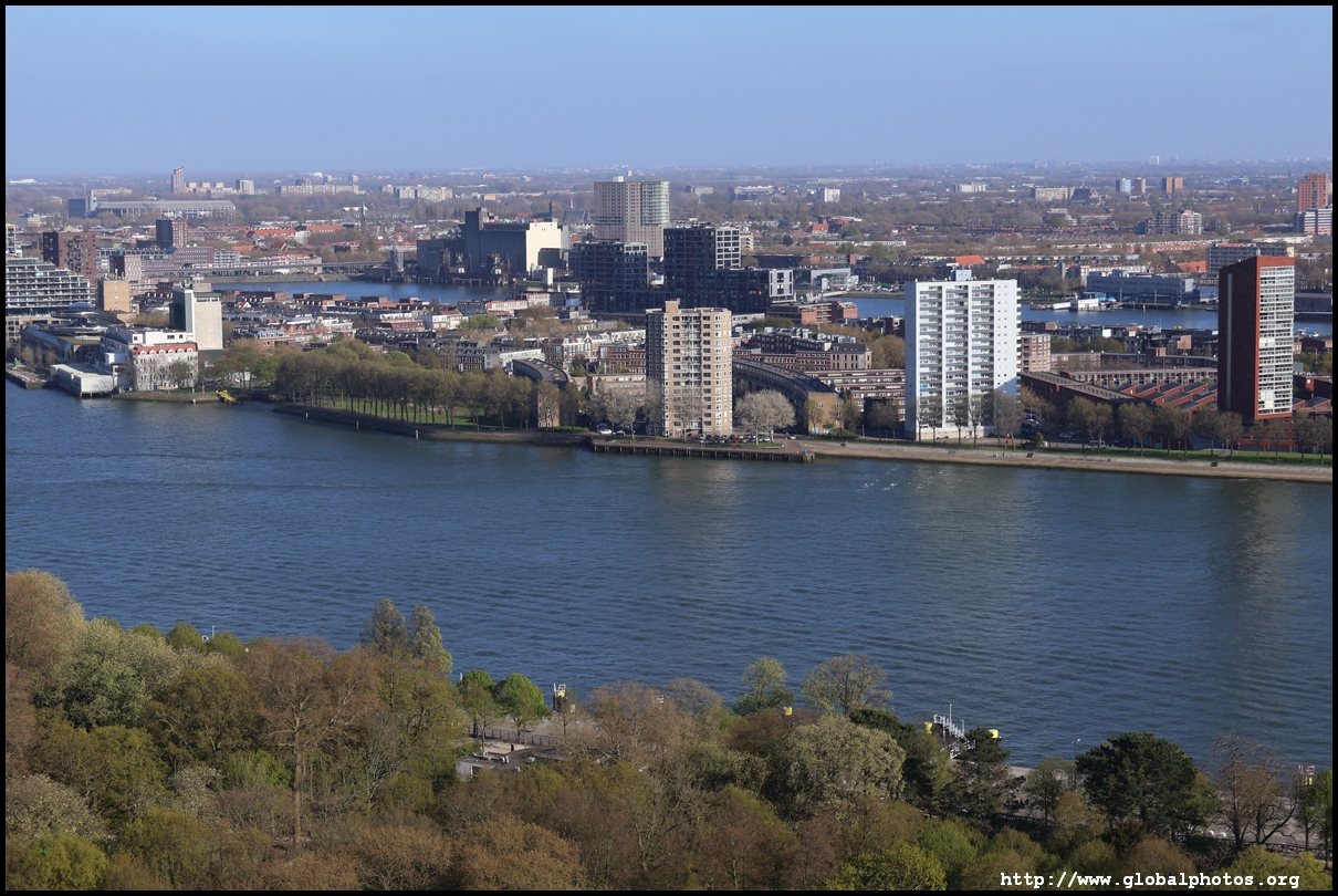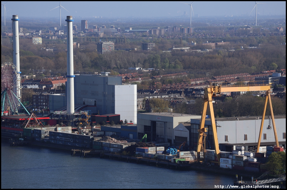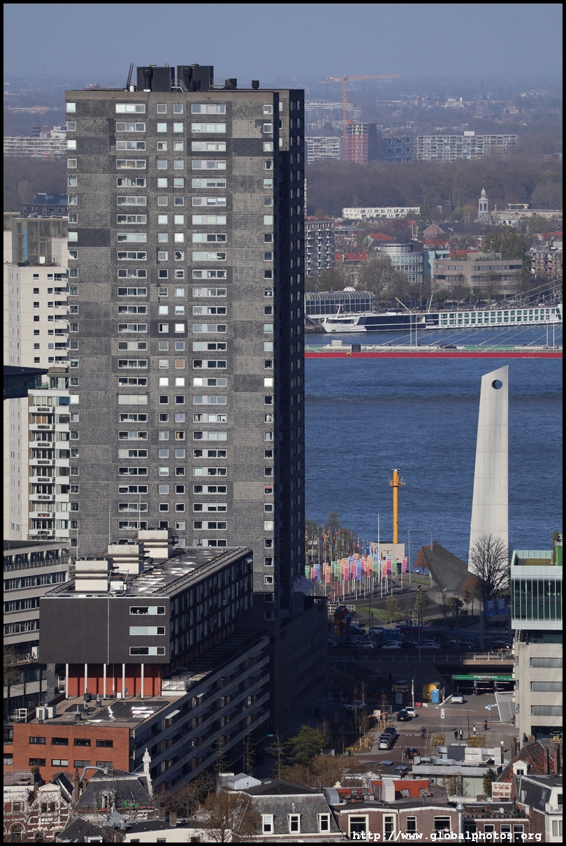 The tower is just across the highway from Het Park, a nice urban oasis along the Nieuwe Maas river. On the other side of the river towards the south are plenty of residential developments around Rijnhaven, Maashaven, and further beyond. To the west, the residential communities slowly fade away and the massive port takes over all the way to the North Sea. In 2024, Rotterdam's port throughput exceeded 435 million tonnes, including 13.8 million container TEU, ranking it the largest in Europe. To the north, I can make out The Hague's skyline in the distance. The metro's line E connects both cities together, with a journey time of about half an hour from Centraal station.