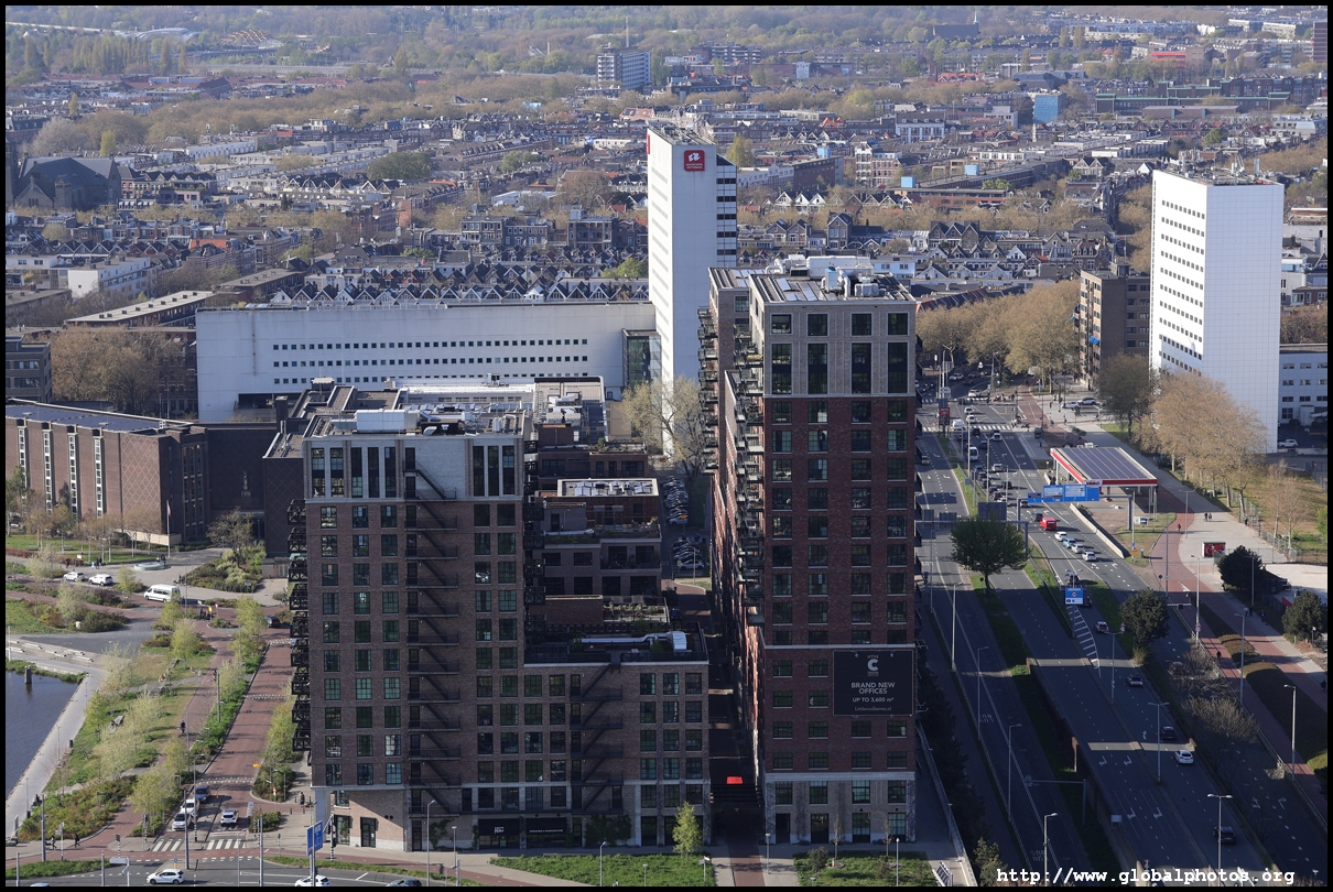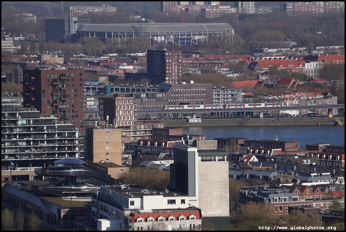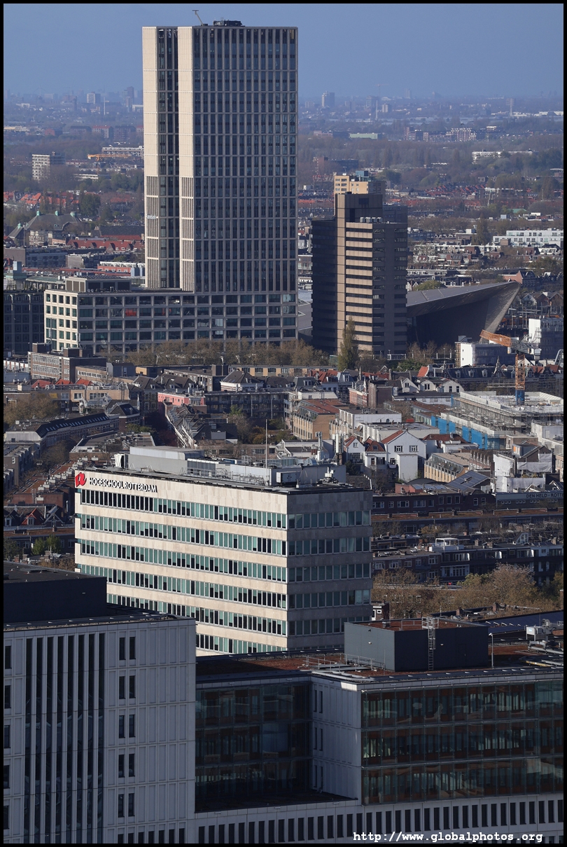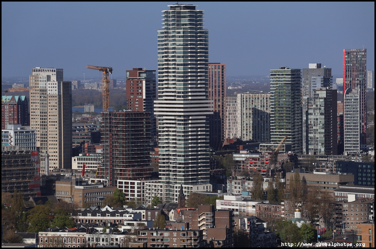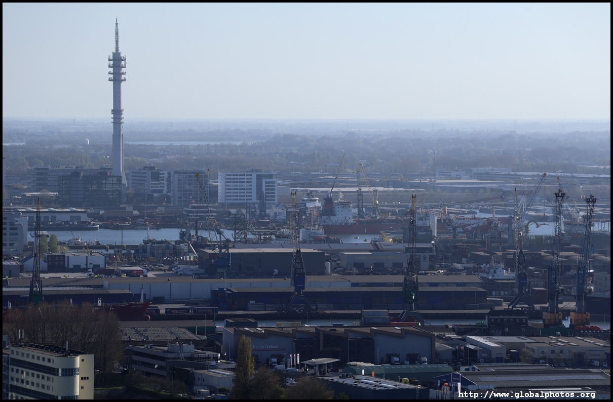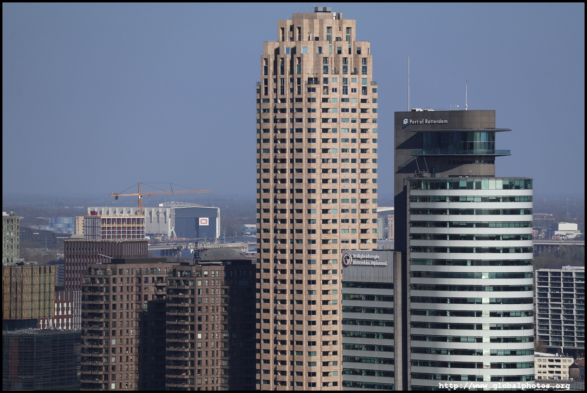 The tower is just across the highway from Het Park, a nice urban oasis along the Nieuwe Maas river. On the other side of the river towards the south are plenty of residential developments around Rijnhaven, Maashaven, and further beyond. To the west, the residential communities slowly fade away and the massive port takes over all the way to the North Sea. In 2024, Rotterdam's port throughput exceeded 435 million tonnes, including 13.8 million container TEU, ranking it the largest in Europe. To the north, I can make out The Hague's skyline in the distance. The metro's line E connects both cities together, with a journey time of about half an hour from Centraal station.