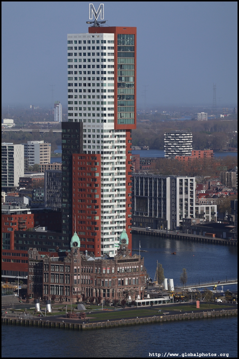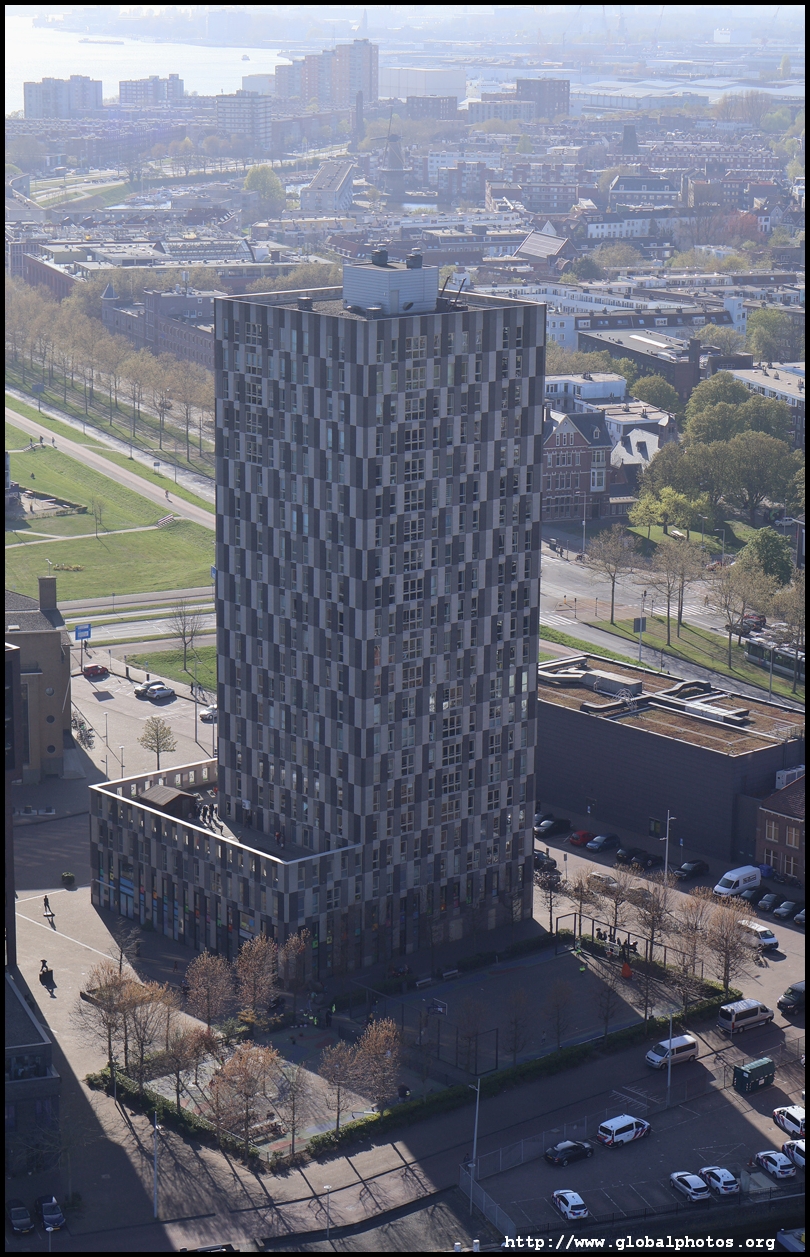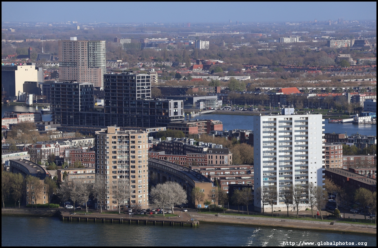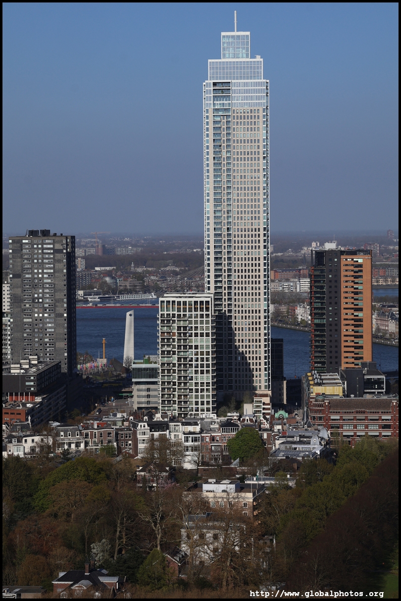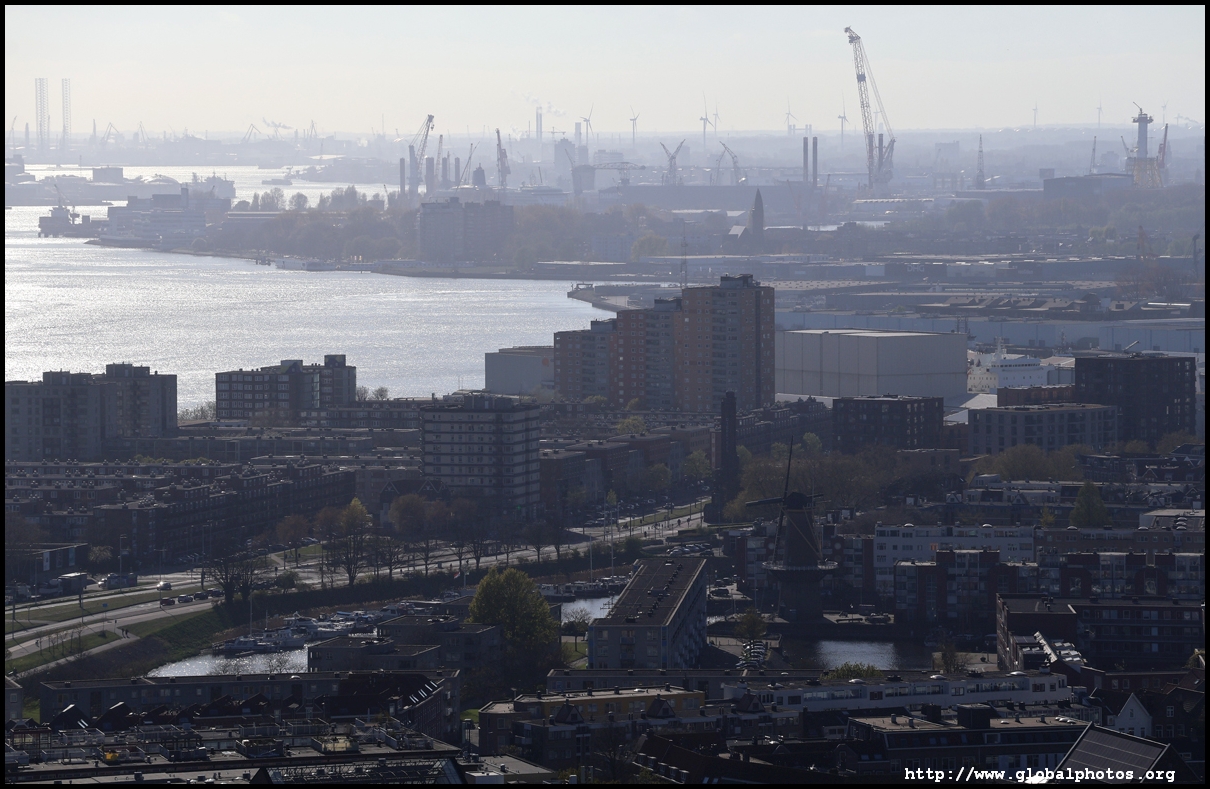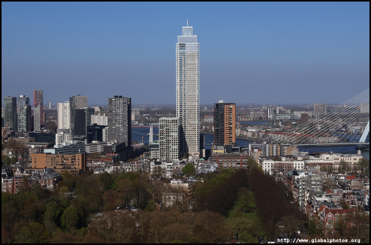 The tower is just across the highway from Het Park, a nice urban oasis along the Nieuwe Maas river. On the other side of the river towards the south are plenty of residential developments around Rijnhaven, Maashaven, and further beyond. To the west, the residential communities slowly fade away and the massive port takes over all the way to the North Sea. In 2024, Rotterdam's port throughput exceeded 435 million tonnes, including 13.8 million container TEU, ranking it the largest in Europe. To the north, I can make out The Hague's skyline in the distance. The metro's line E connects both cities together, with a journey time of about half an hour from Centraal station.
