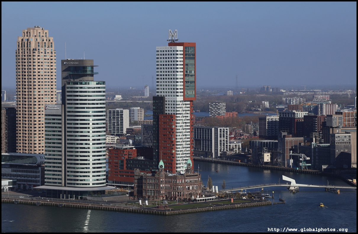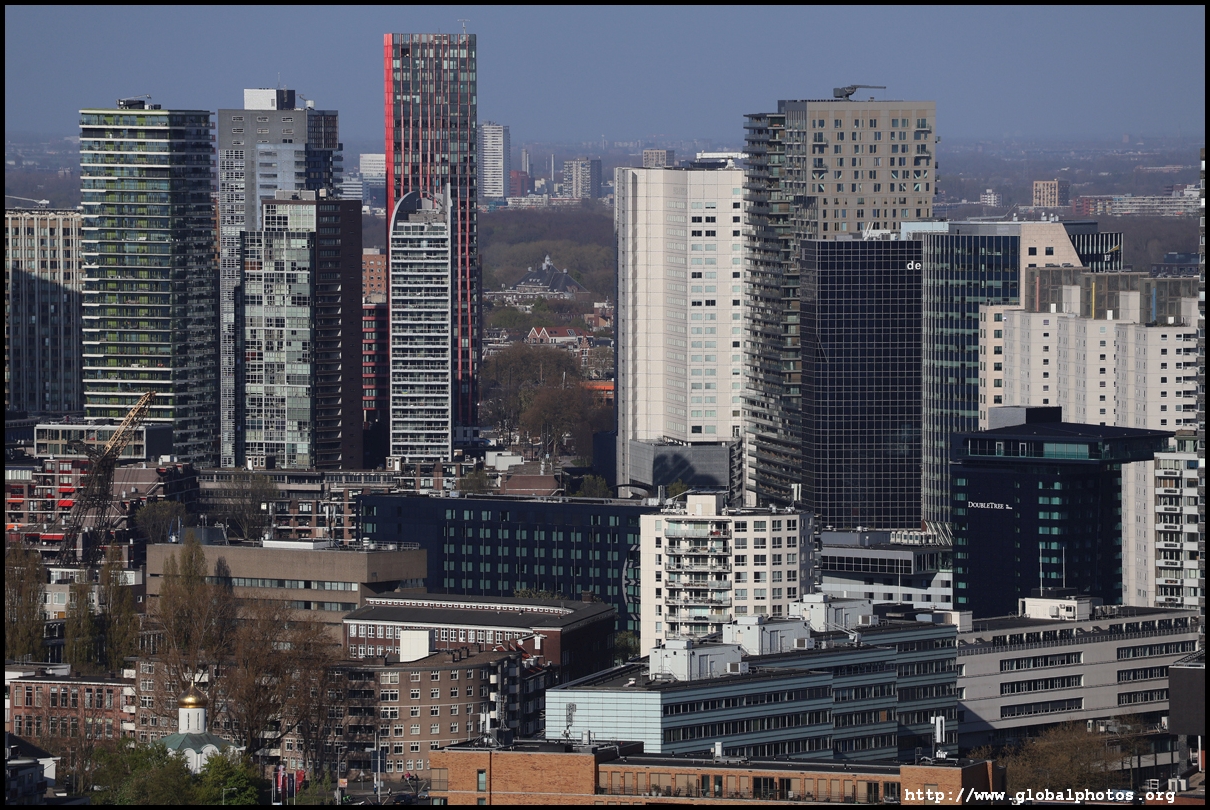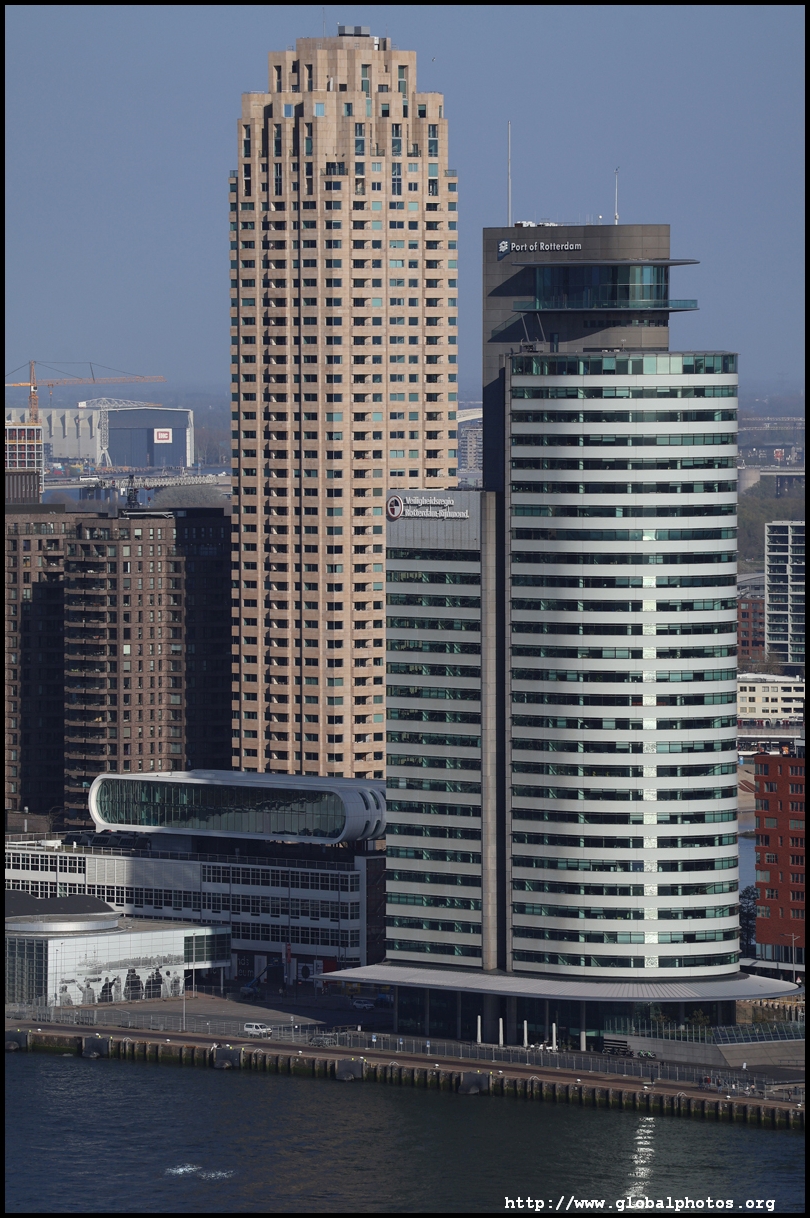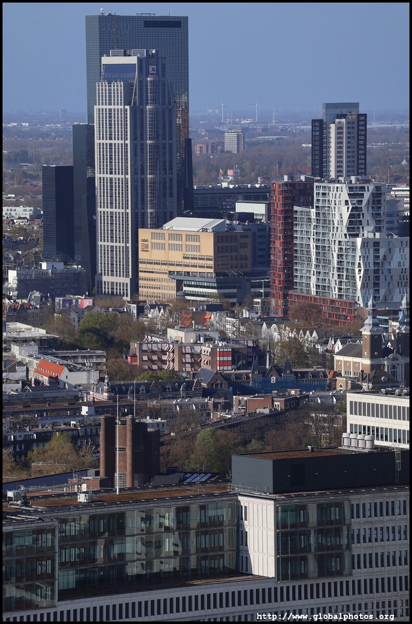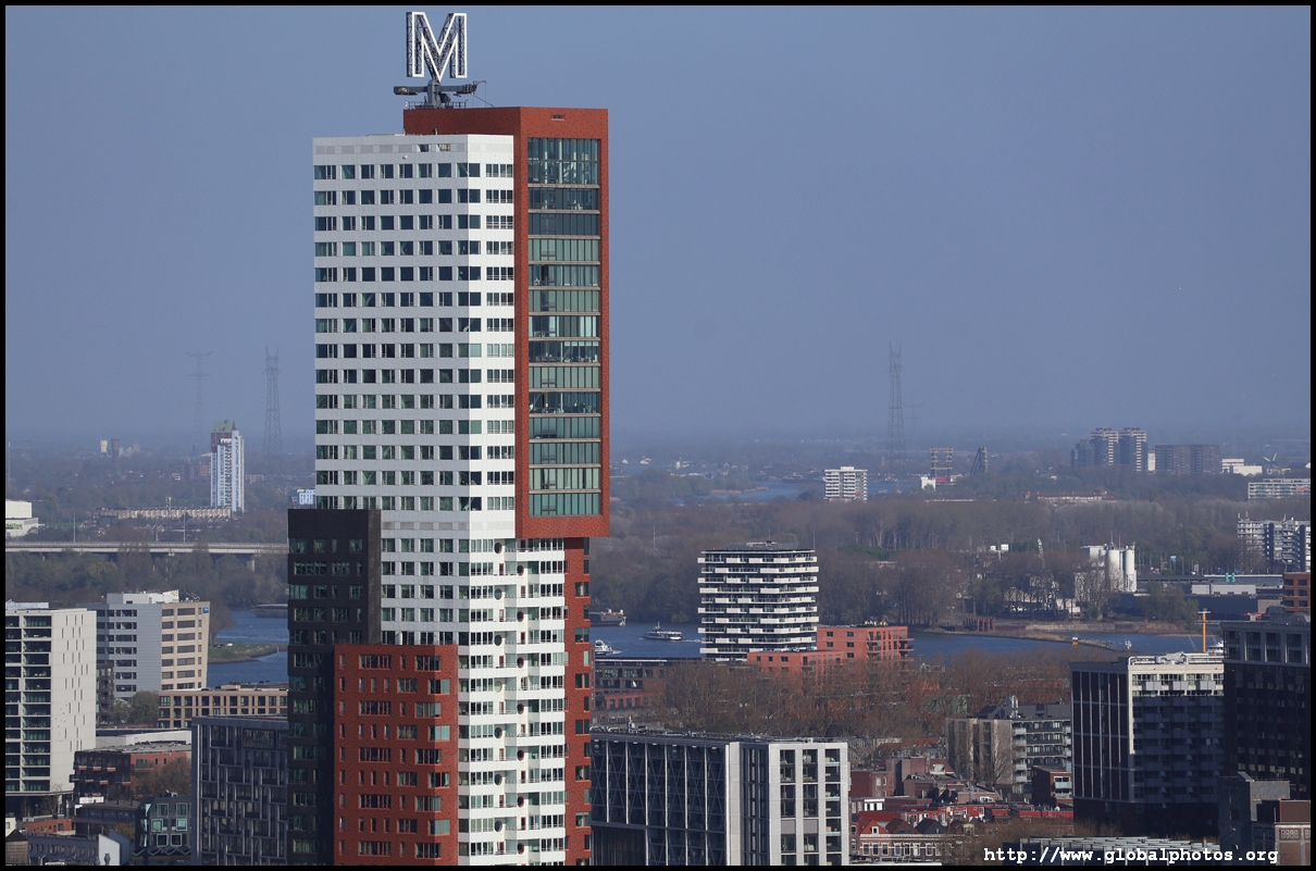 The tower is just across the highway from Het Park, a nice urban oasis along the Nieuwe Maas river. On the other side of the river towards the south are plenty of residential developments around Rijnhaven, Maashaven, and further beyond. To the west, the residential communities slowly fade away and the massive port takes over all the way to the North Sea. In 2024, Rotterdam's port throughput exceeded 435 million tonnes, including 13.8 million container TEU, ranking it the largest in Europe. To the north, I can make out The Hague's skyline in the distance. The metro's line E connects both cities together, with a journey time of about half an hour from Centraal station.